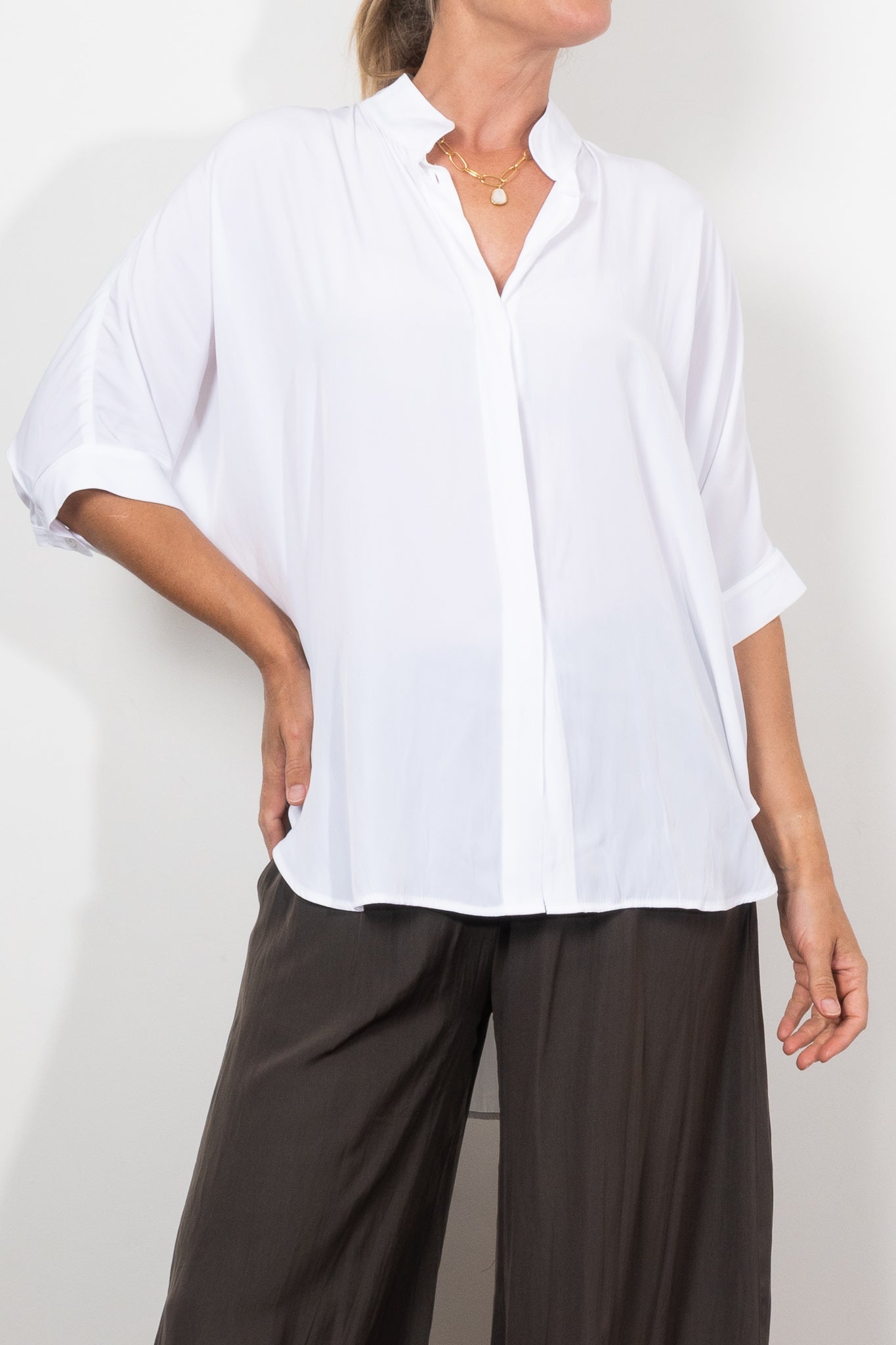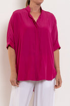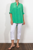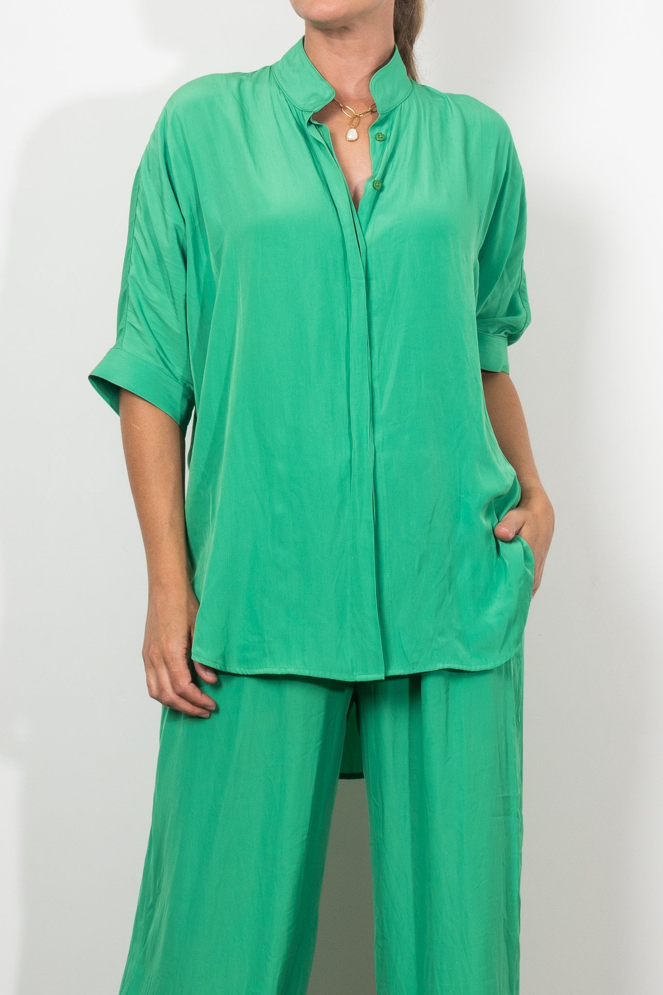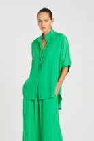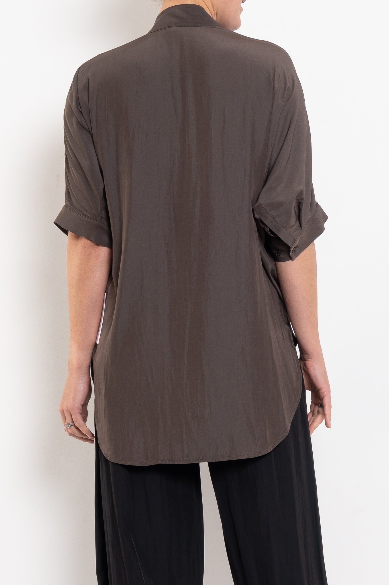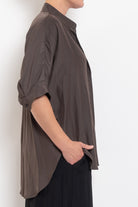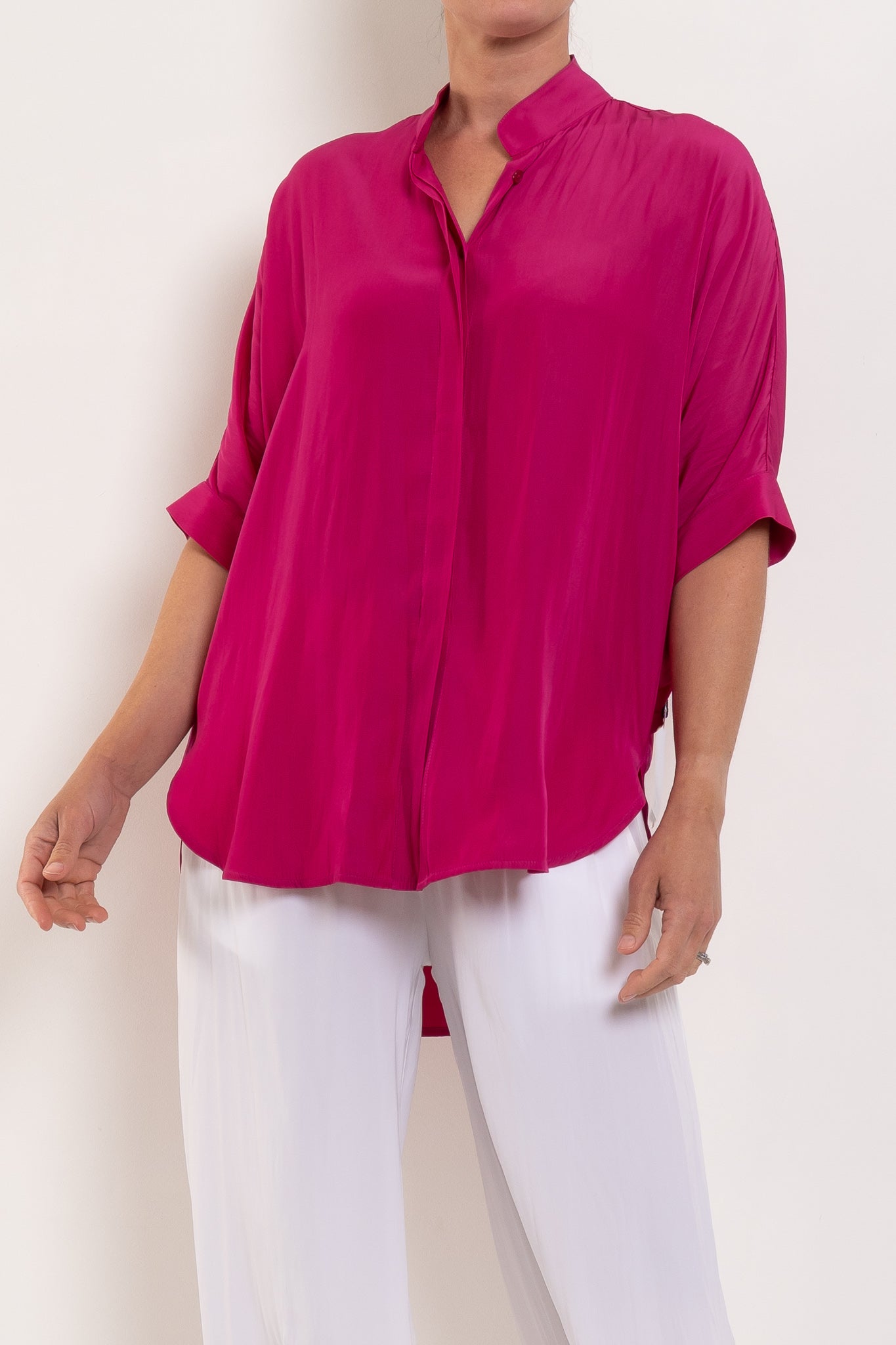 The Villa Overshirt is cut from Mela Purdie’s signature Mache, a Japanese-woven fabric that feels like silk yet resists creasing — making it as practical as it is luxurious. Its stand collar and concealed placket bring subtle structure, while the dramatic curved hemline creates a flowing, modern silhouette. Designed with a relaxed fit, it’s the piece that elevates everything from casual denim to tailored pants, carrying you from weekday errands to evening dinners in style.