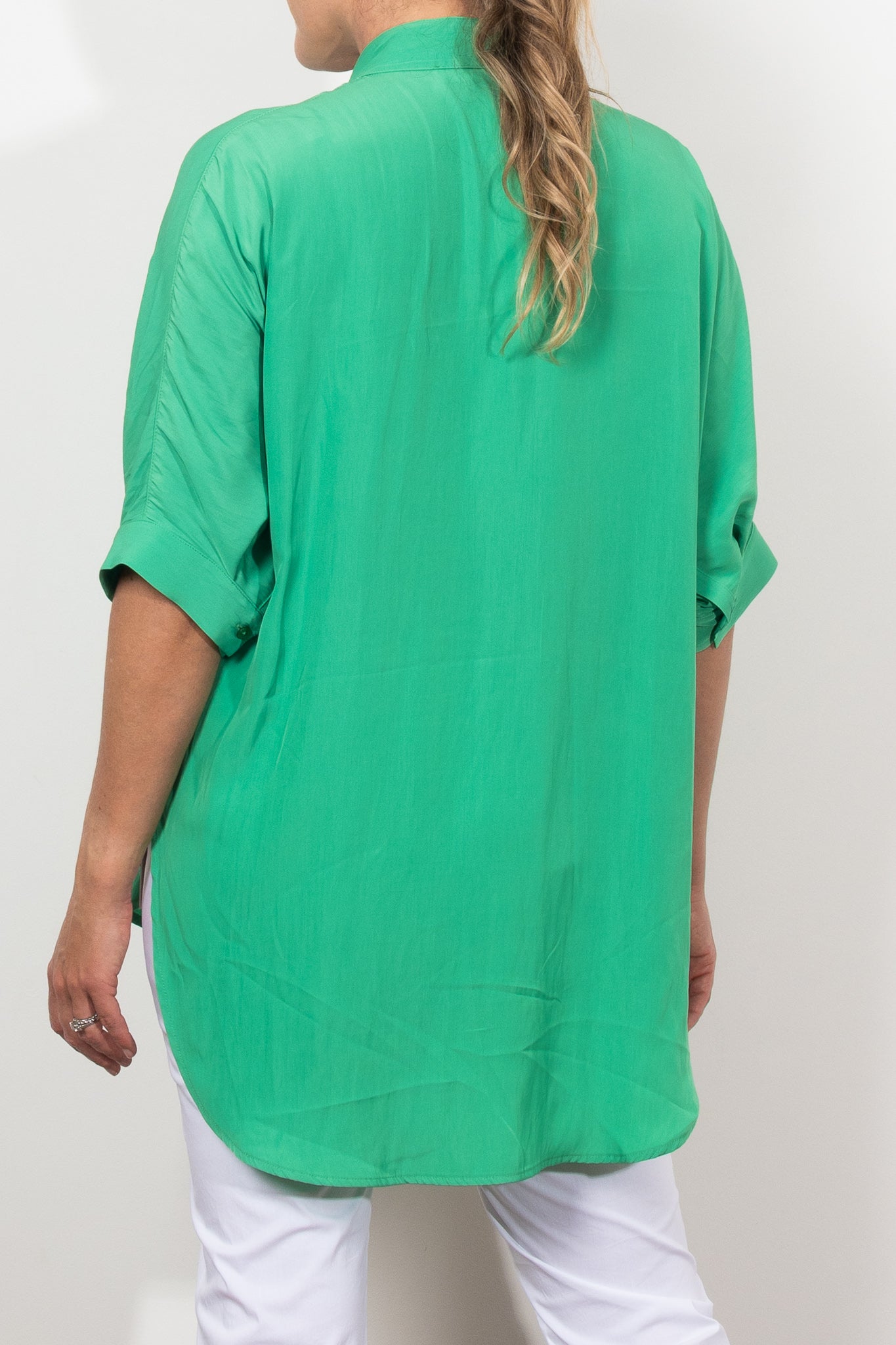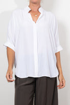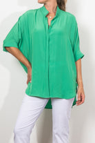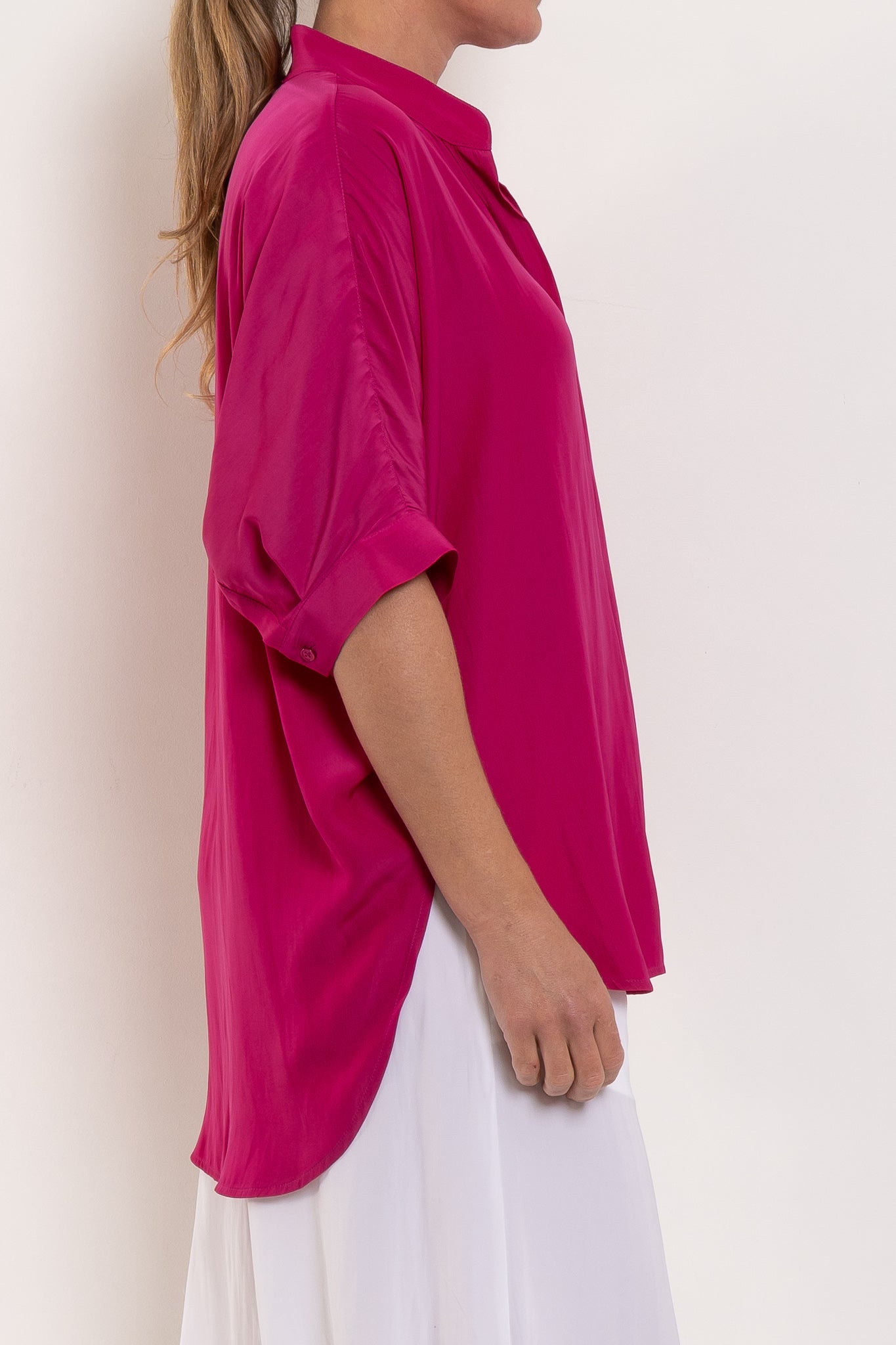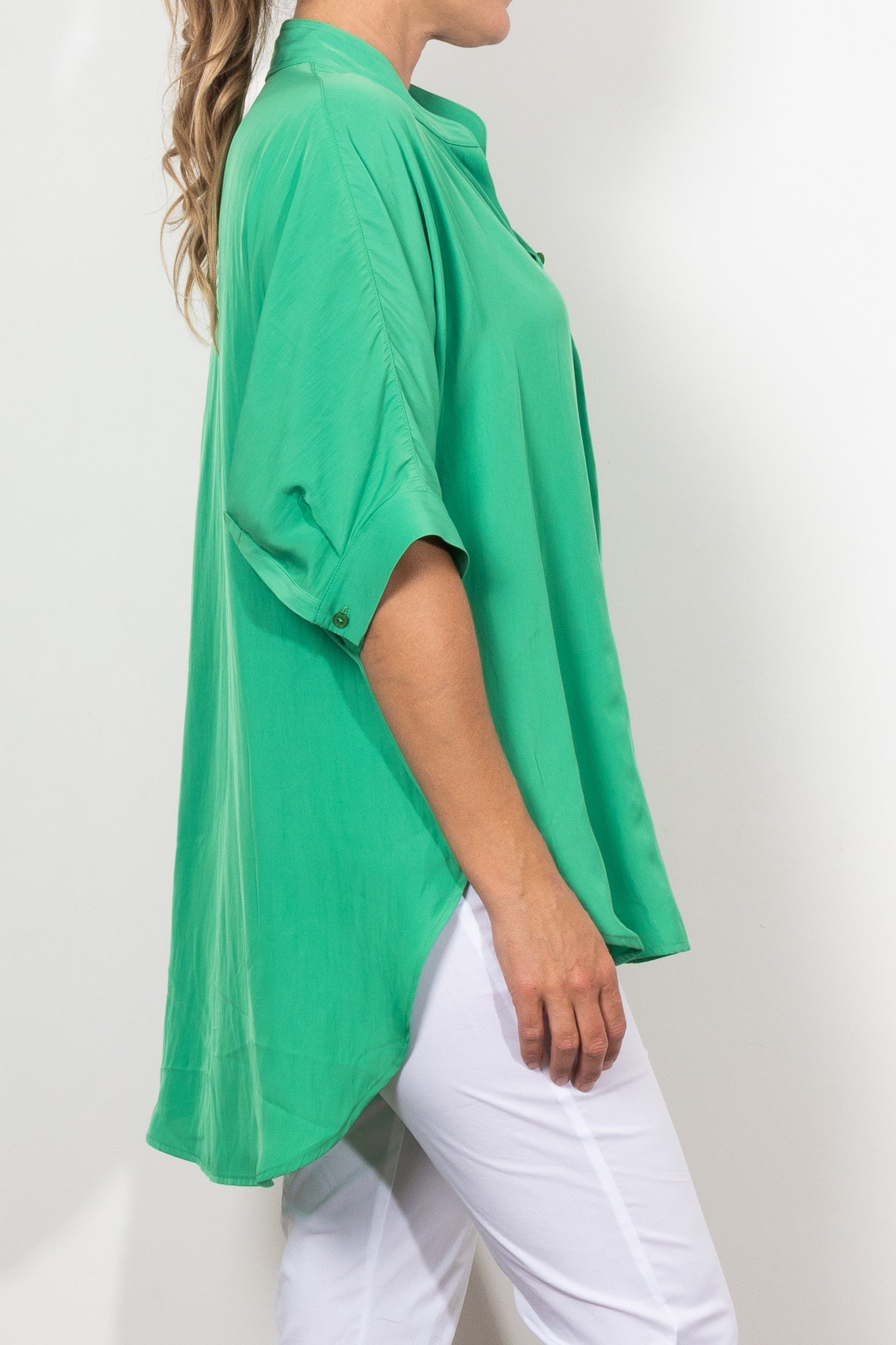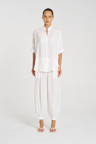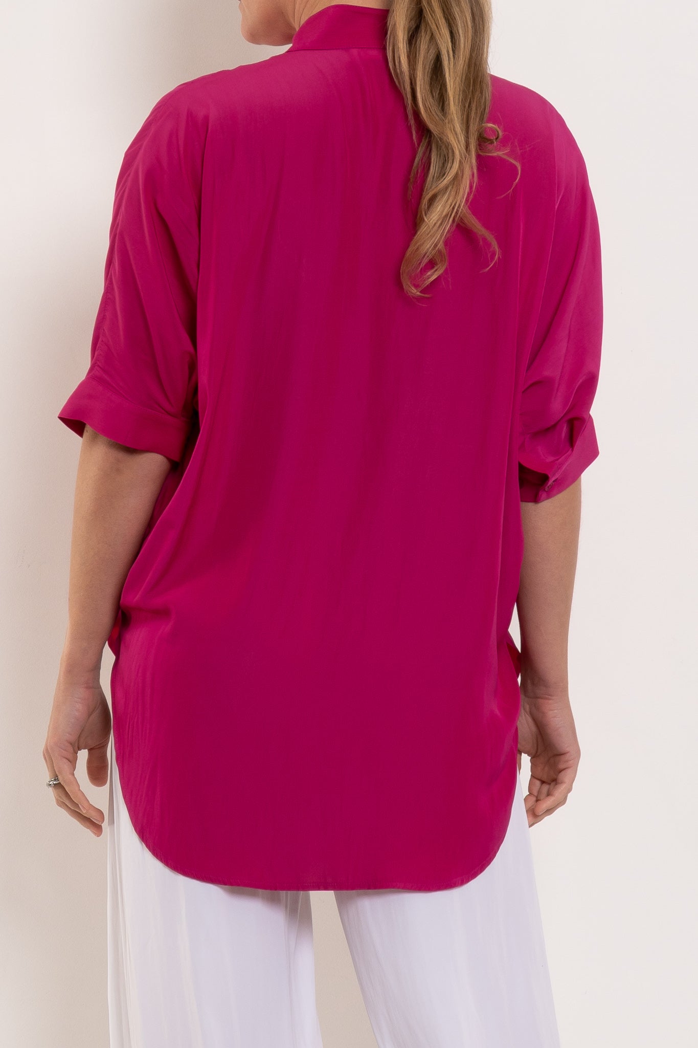 The Villa Overshirt is cut from Mela Purdie’s signature Mache, a Japanese-woven fabric that feels like silk yet resists creasing — making it as practical as it is luxurious. Its stand collar and concealed placket bring subtle structure, while the dramatic curved hemline creates a flowing, modern silhouette. Designed with a relaxed fit, it’s the piece that elevates everything from casual denim to tailored pants, carrying you from weekday errands to evening dinners in style.