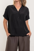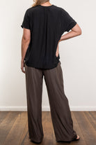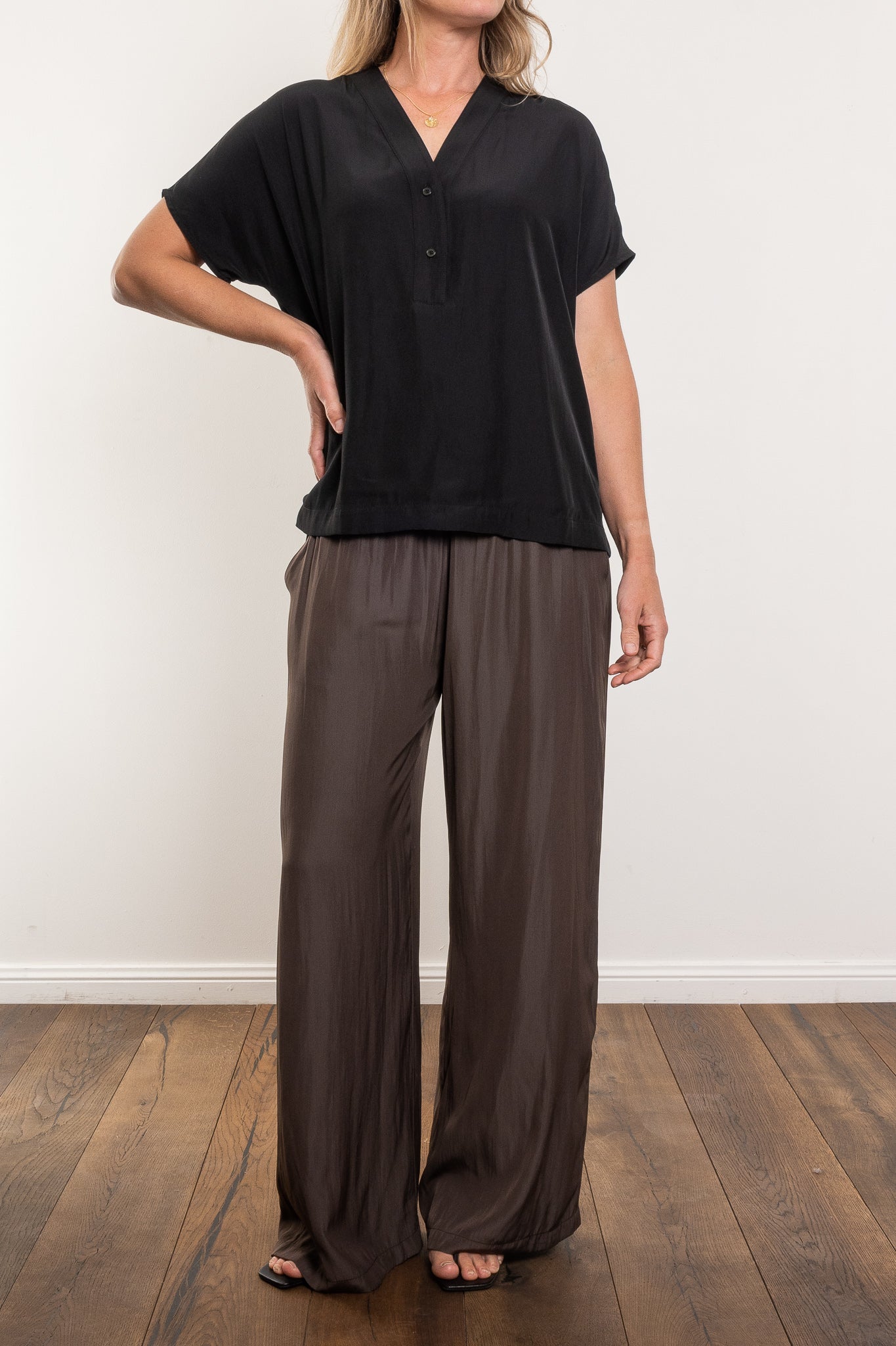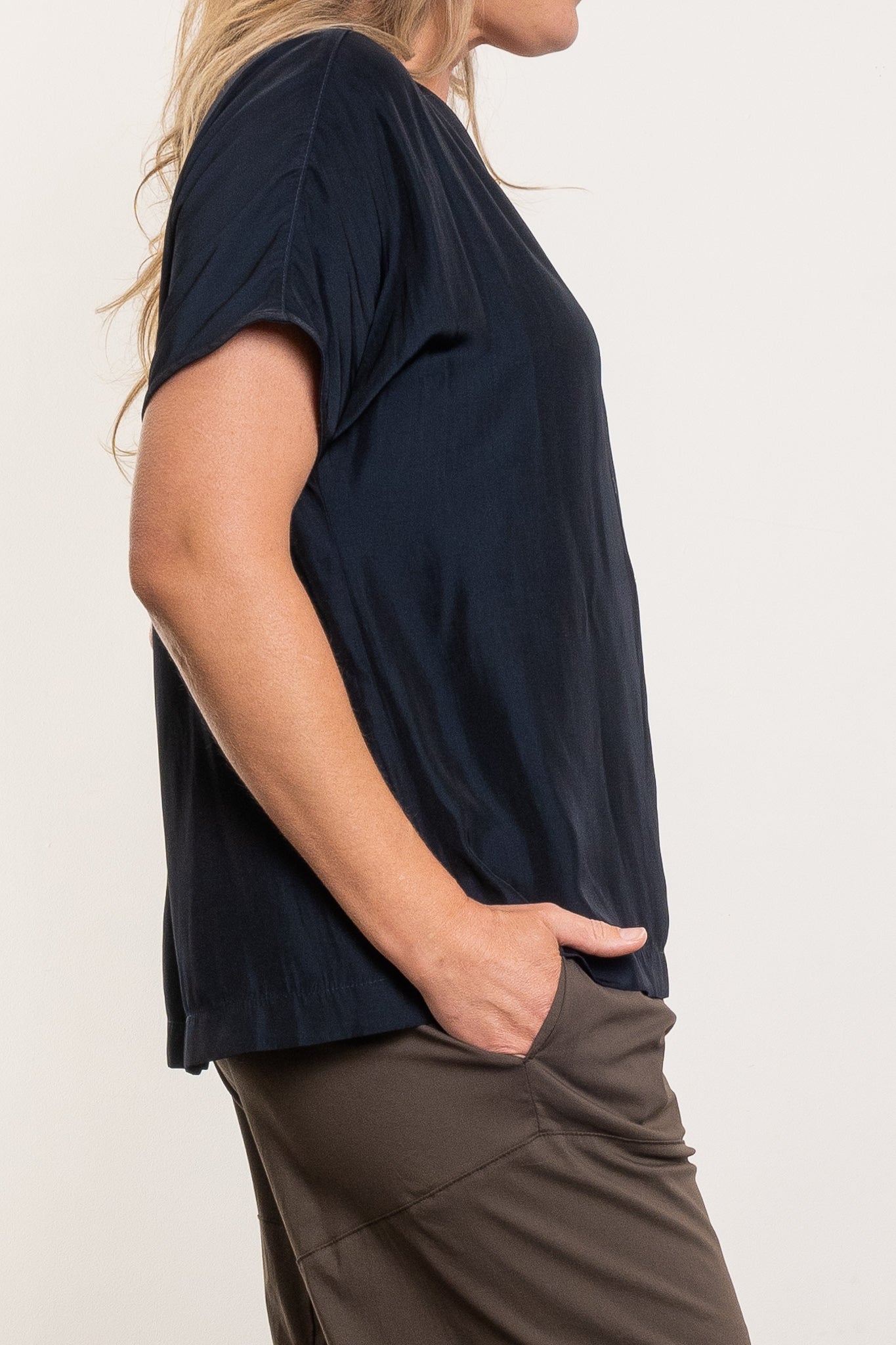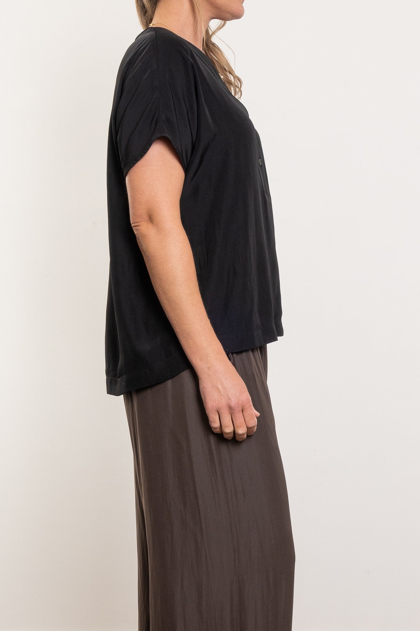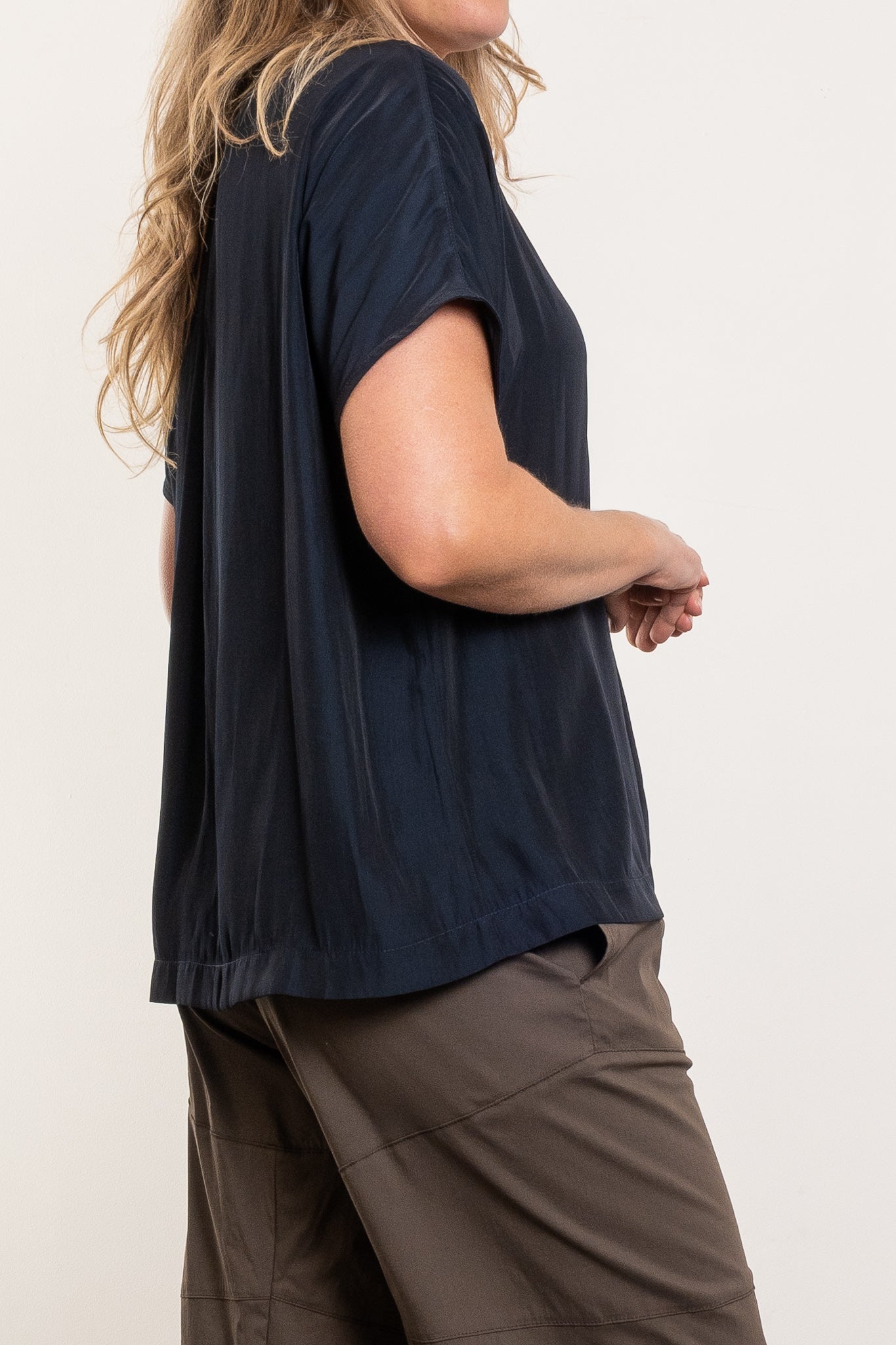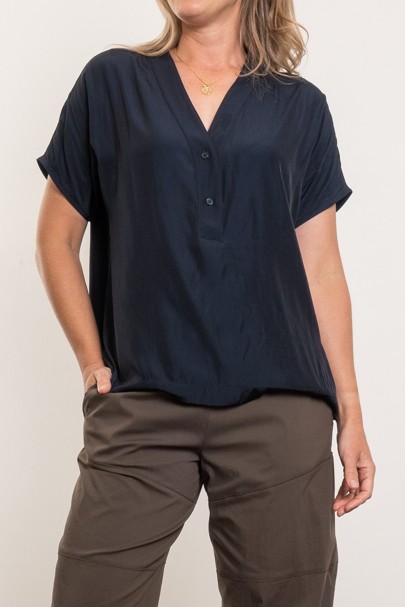 When the day calls for ease without sacrificing polish, the Wedge Tab Shell steps up beautifully. Cut from Mela Purdie’s signature Mache—a fluid Japanese technical weave with a subtle sheen—it drapes like silk but handles like your favourite easy-care travel piece. The shaped V neckline with button detail frames the face, while cap sleeves and a relaxed fit keep you cool and comfortable. A timeless summer staple that slips effortlessly into workdays, weekends, or holidays abroad.