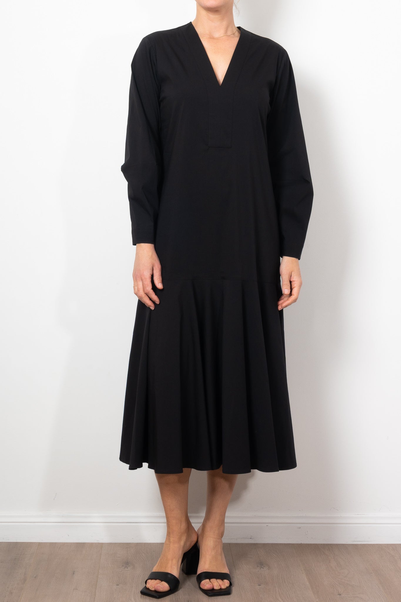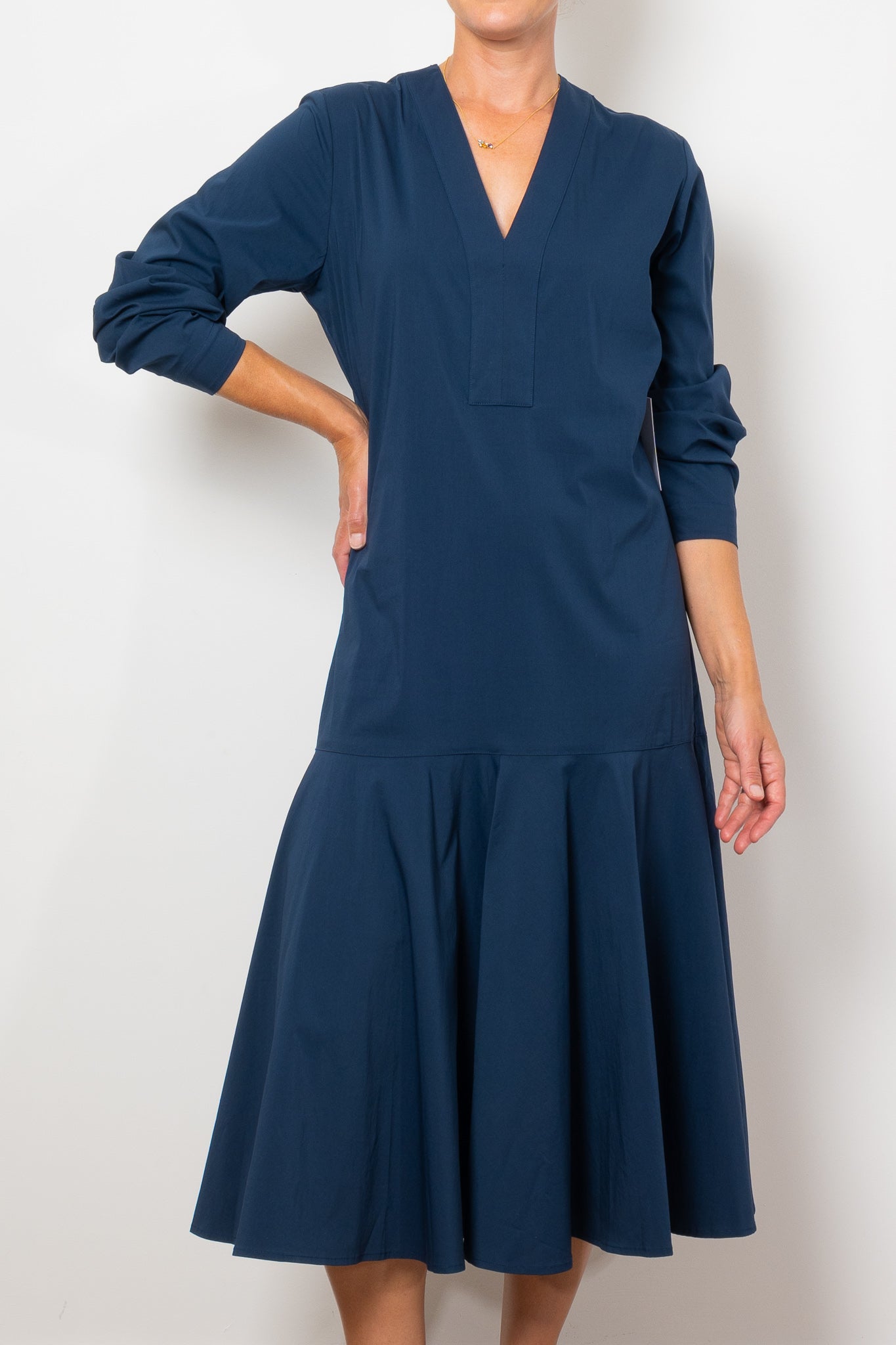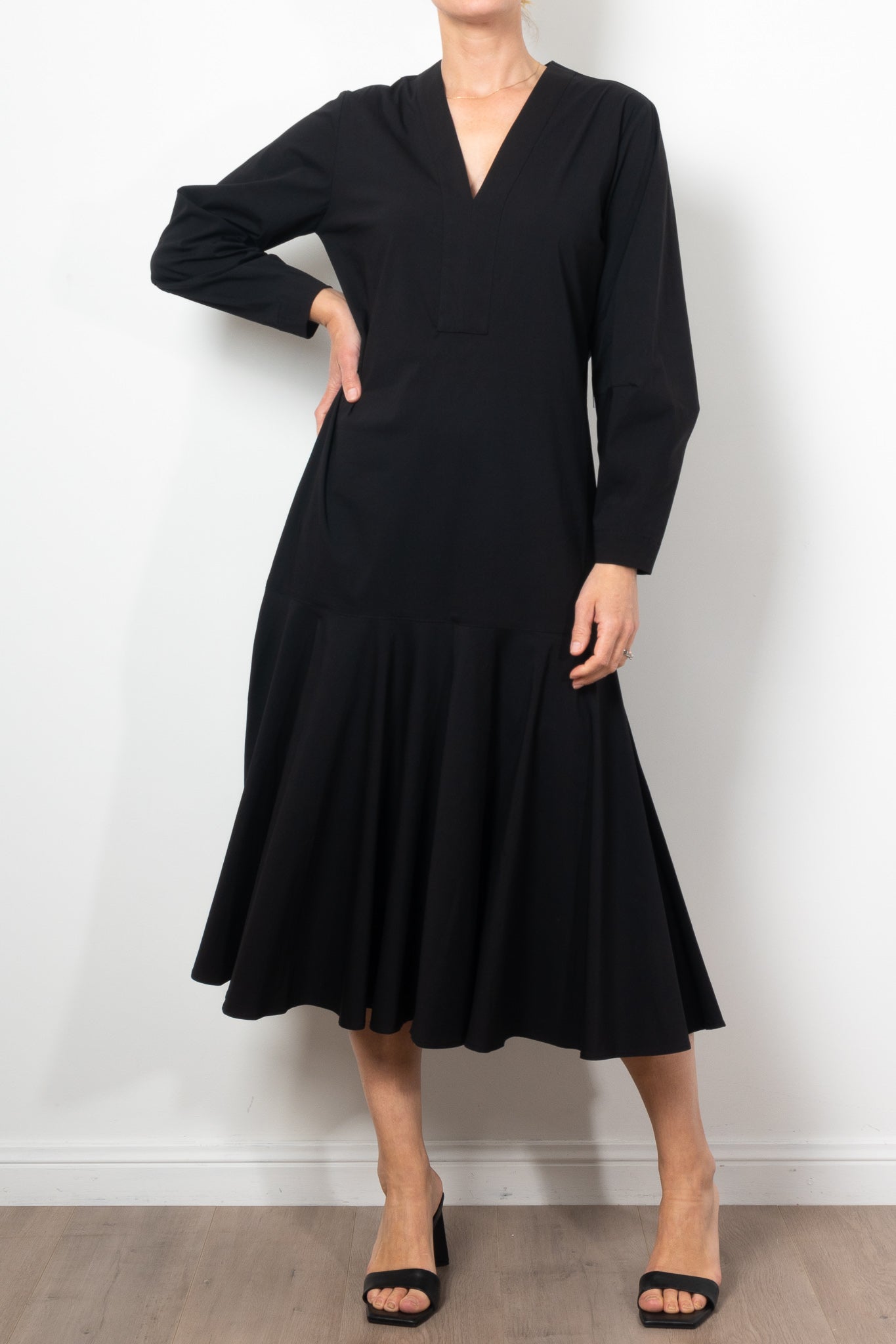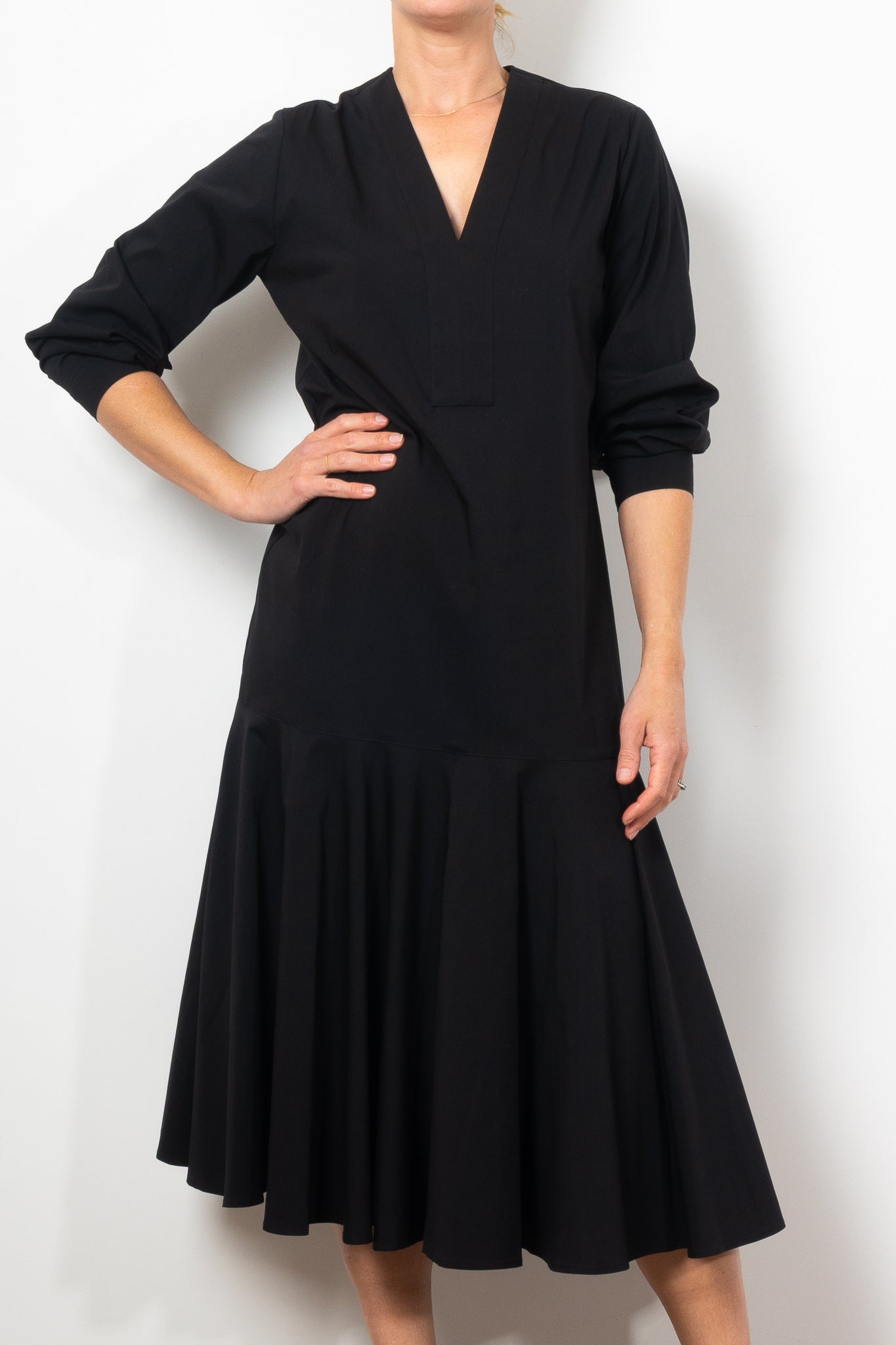 Add a touch of elegance to your wardrobe with the Mela Purdie Bell Dress in Microprene. Crafted from a crisp, high-stretch cotton blend, this dress features a chic deep V neckline and flared hem, adding a flattering silhouette to any look. The elasticated waistband and full length make it both comfortable and stylish for any occasion.