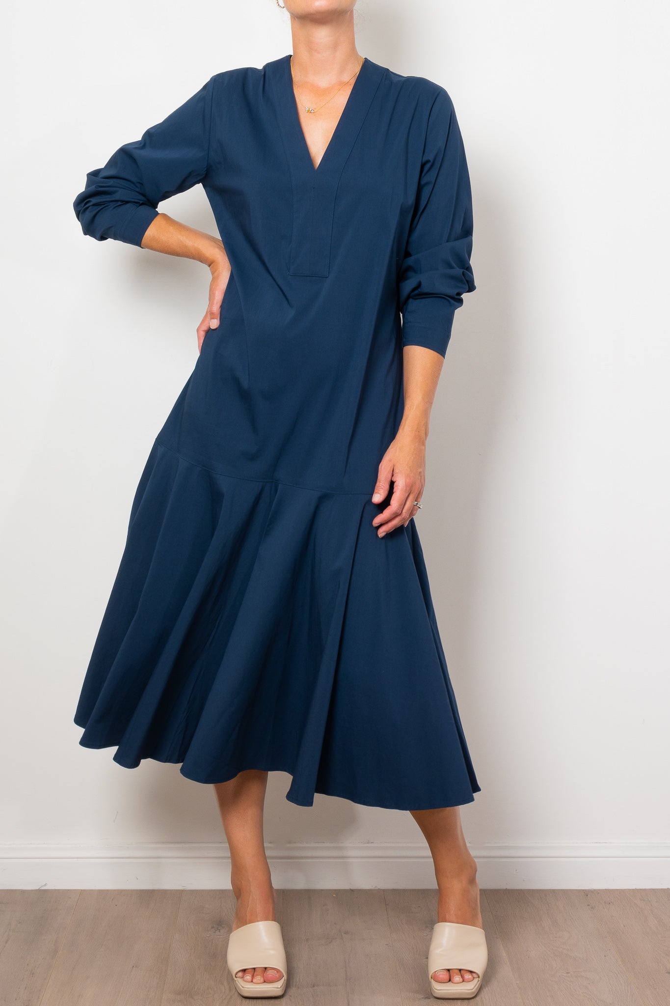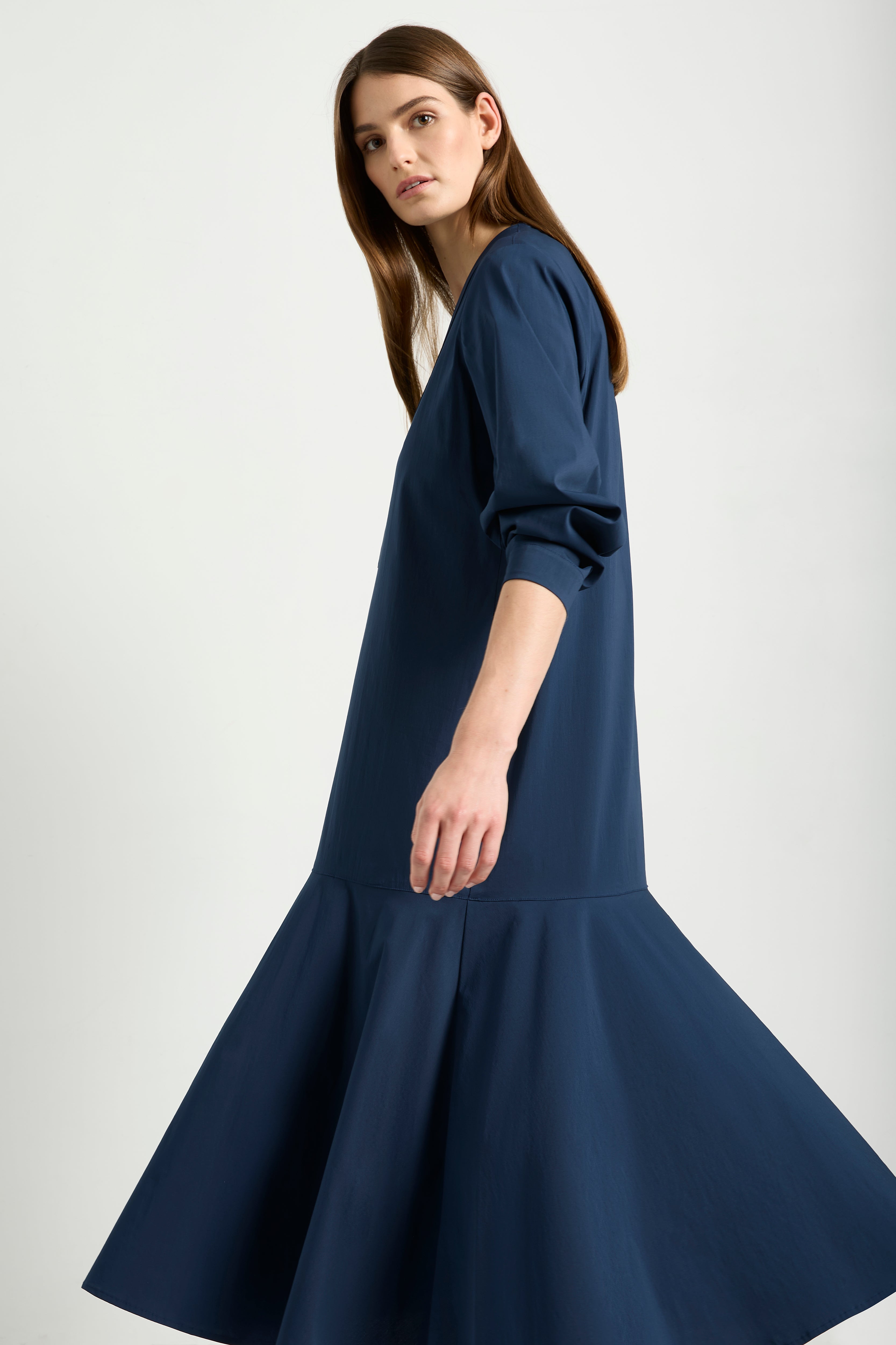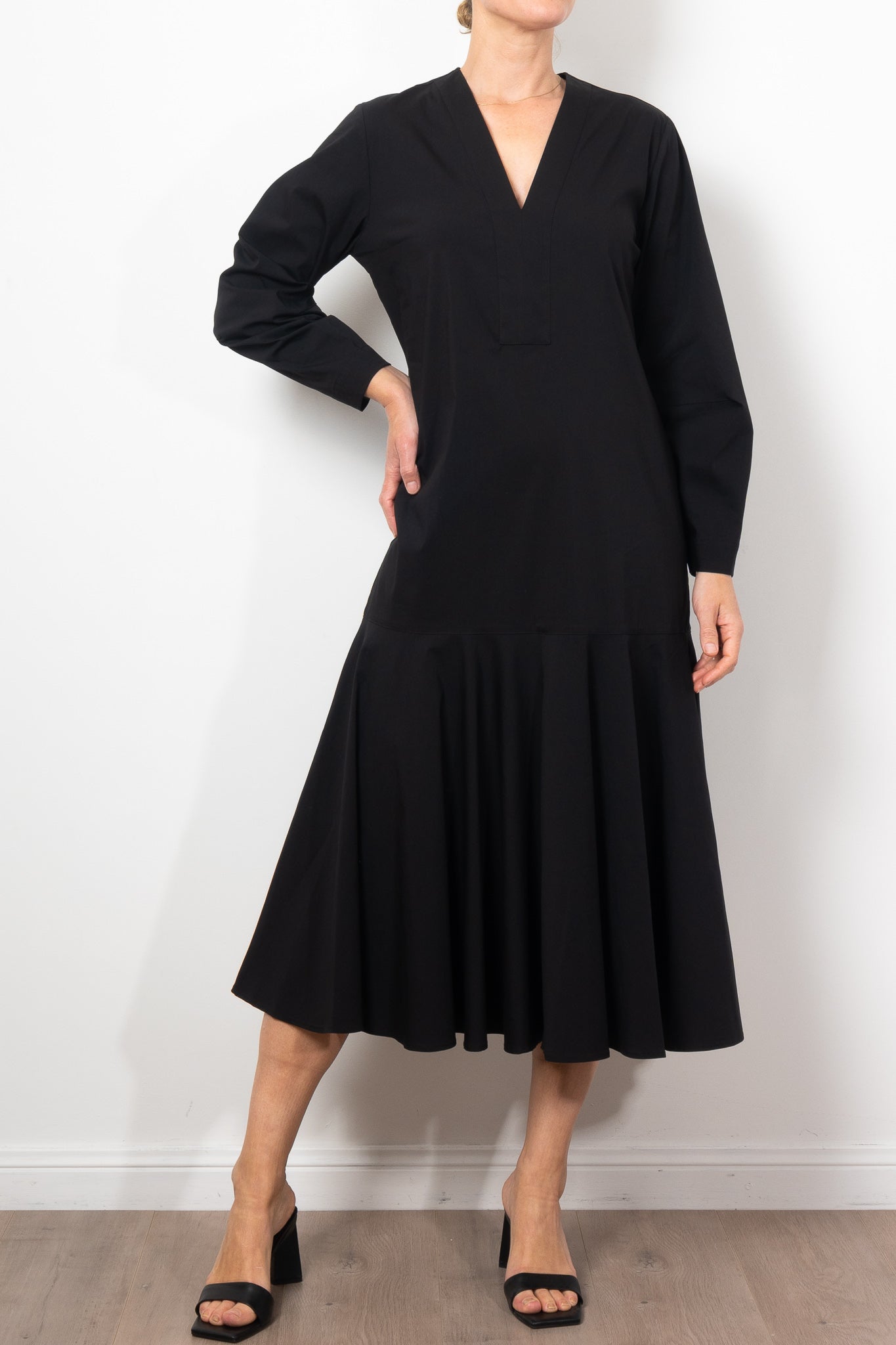 Add a touch of elegance to your wardrobe with the Mela Purdie Bell Dress in Microprene. Crafted from a crisp, high-stretch cotton blend, this dress features a chic deep V neckline and flared hem, adding a flattering silhouette to any look. The elasticated waistband and full length make it both comfortable and stylish for any occasion.