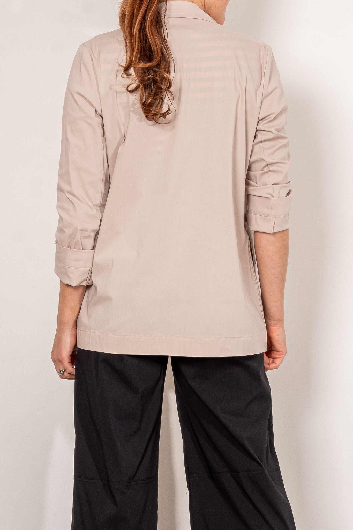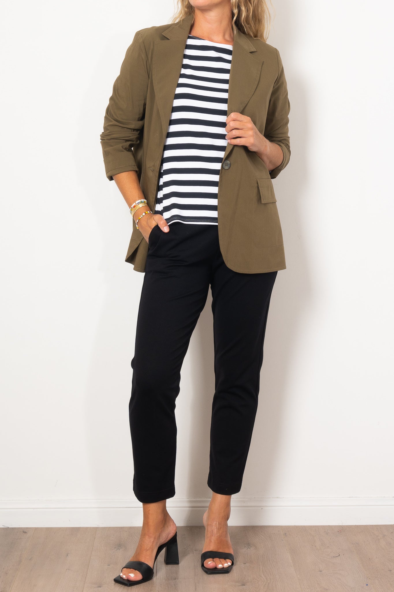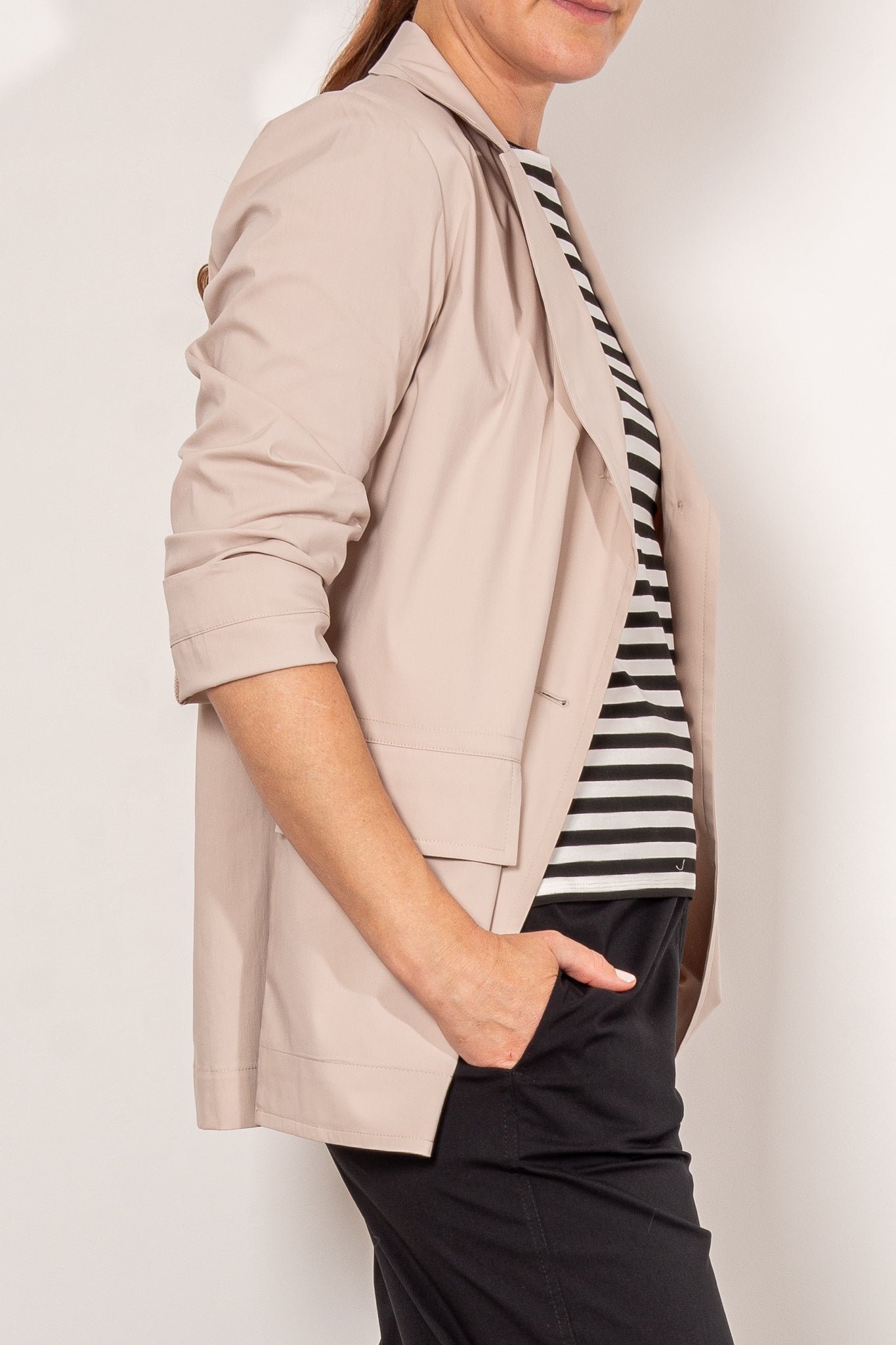 Cut from Microprene. A crisp, cotton rich, high stretch fabrication with a polished finish. The Stretch Blazer has a modern relaxed fit with a crisp collar and patch pocket detail.