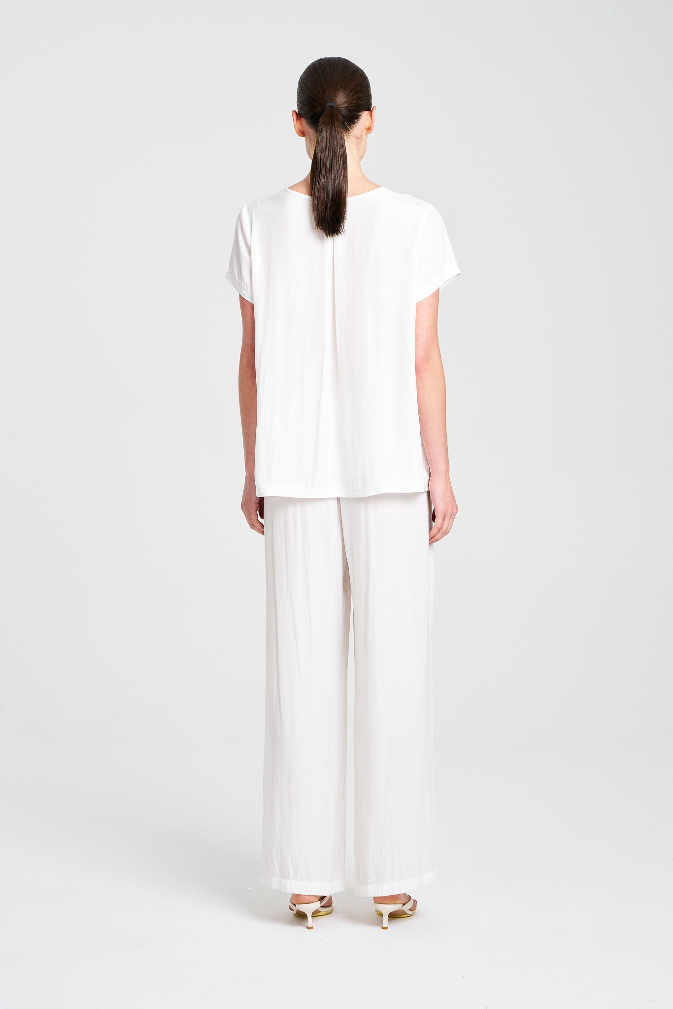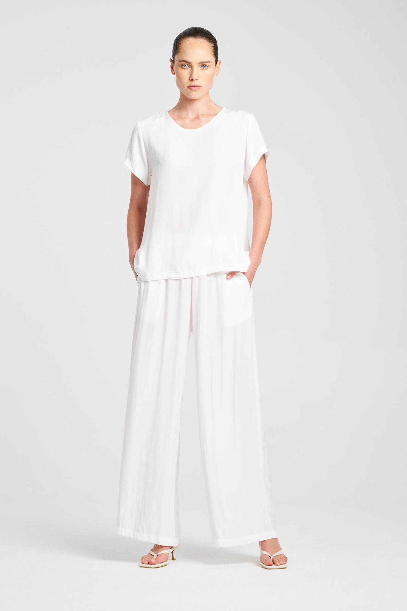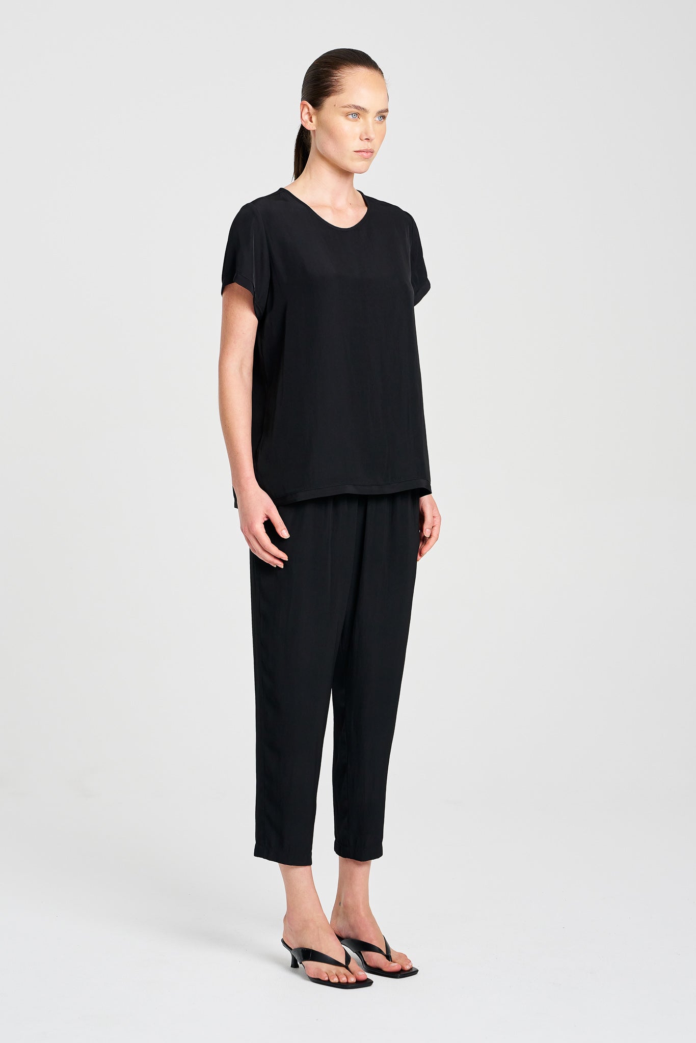 A wardrobe essential, the Transit T has an effortless, slightly loose fit. Crafted from Mela's fluid Mache, with a scoop neckline and flattering short sleeve, it is the perfect layering piece.