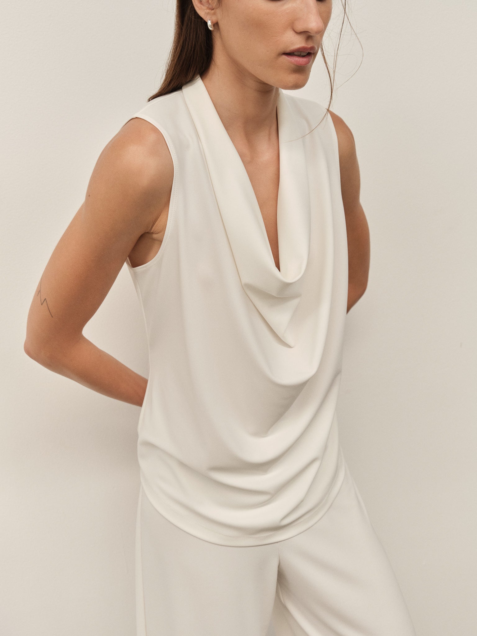 The Drape Shell brings a polished edge to everyday dressing, thanks to its elegant cowl neckline and fluid Powder Knit fabric. A modern essential that works from workday to weekend.