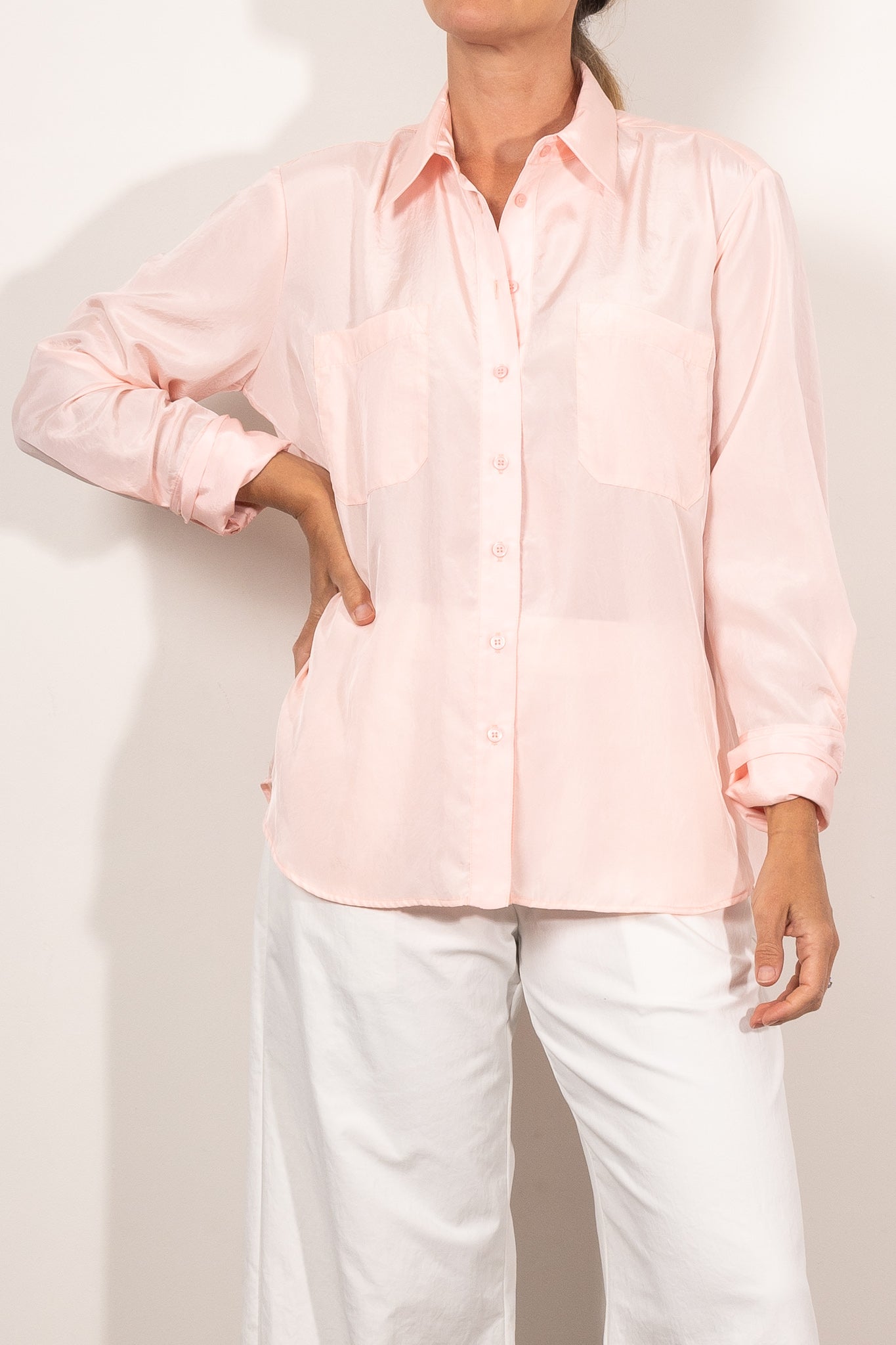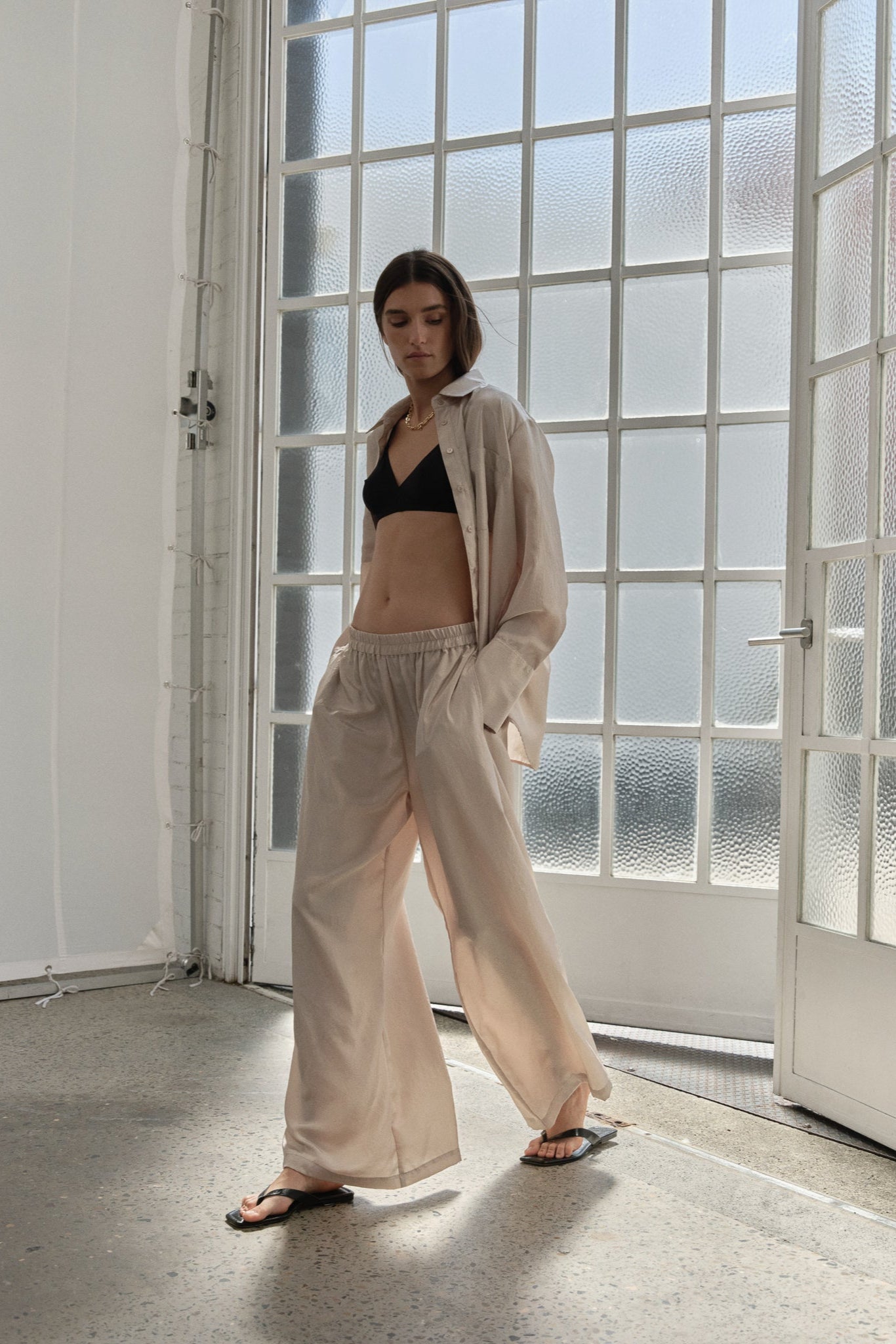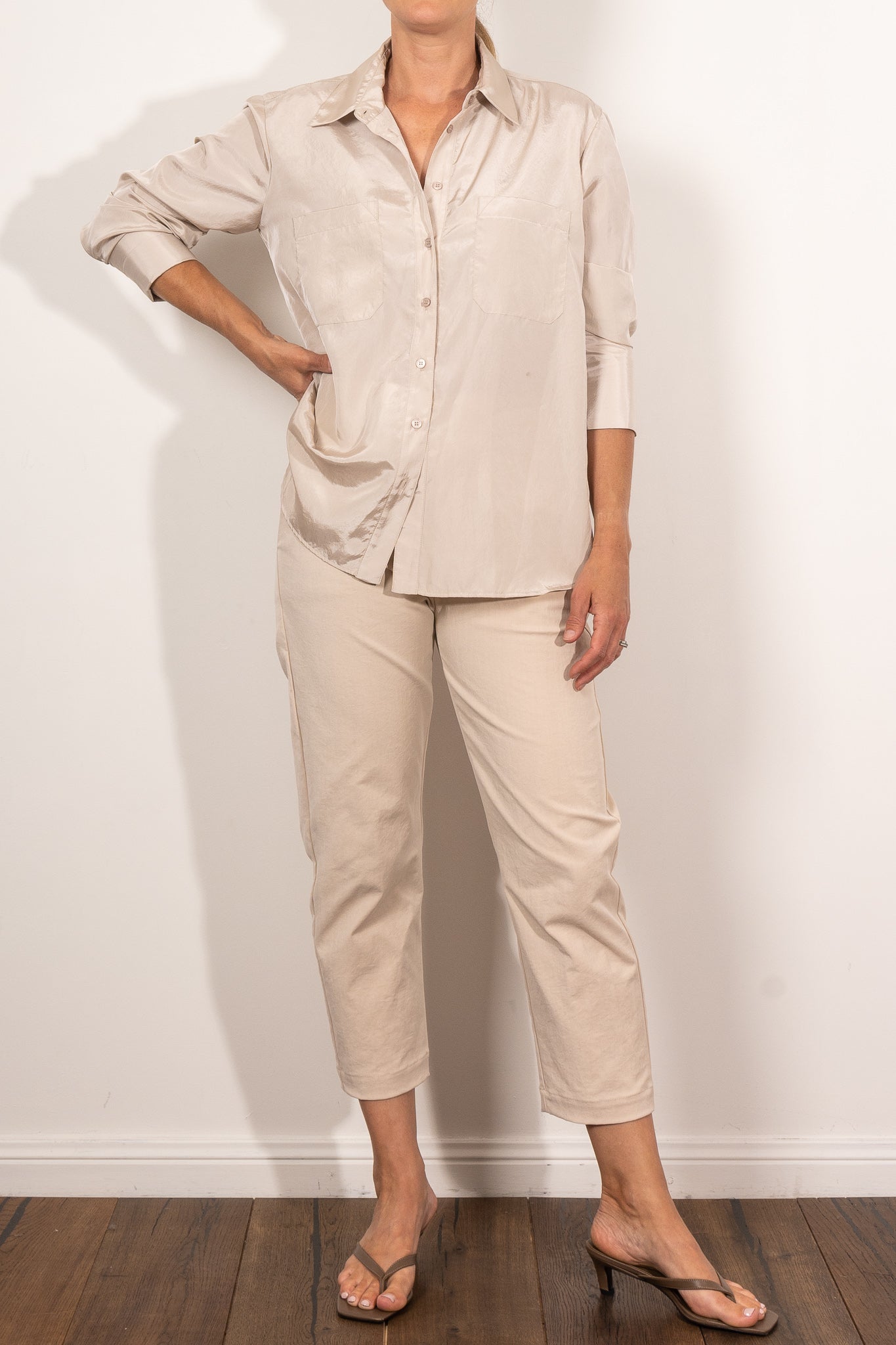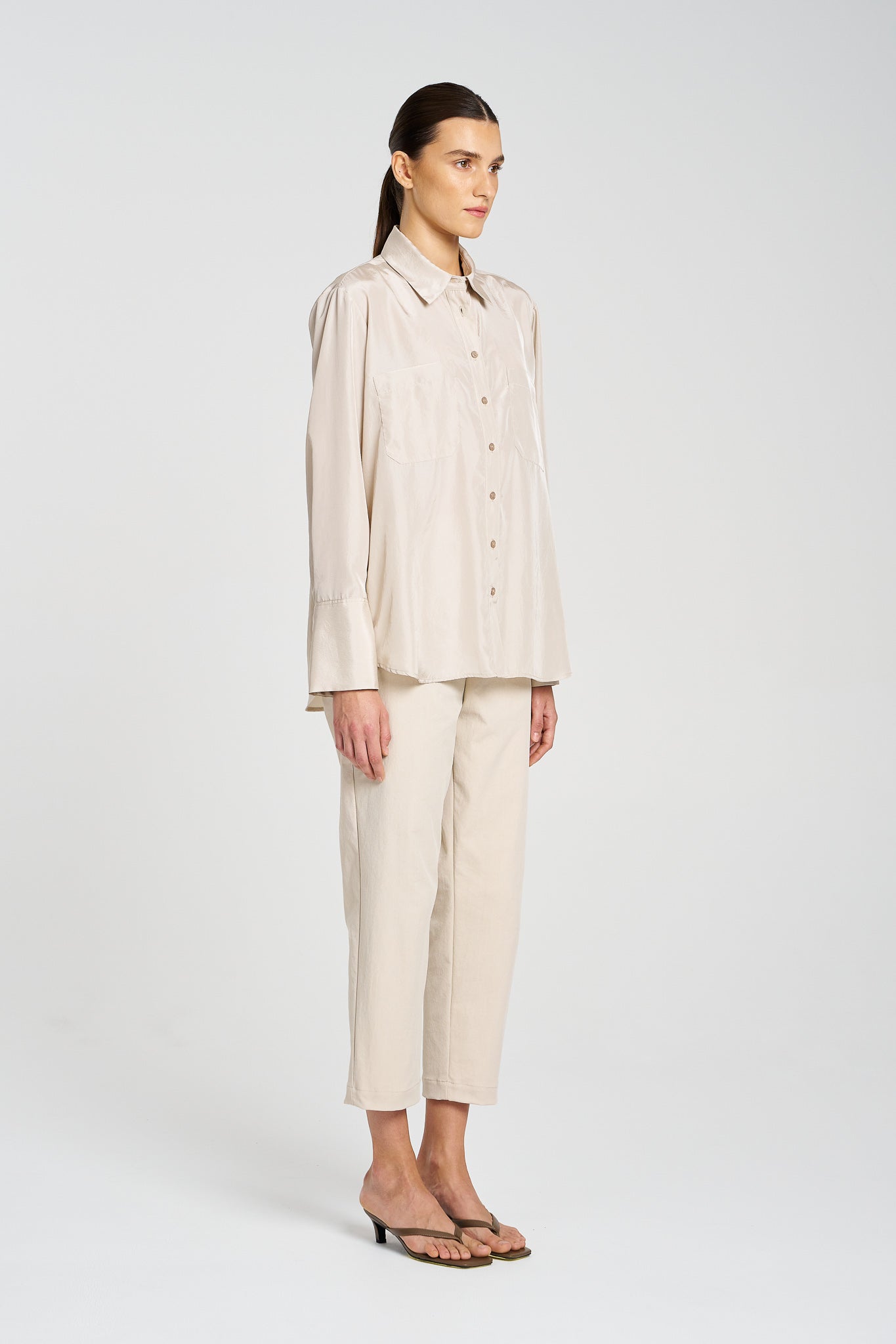 The Crisp Shirt is a modern classic, crafted from Mela Purdie’s ultra-light, travel-friendly Technical Tumbled Taffeta. This Japanese-woven fabric offers a softly structured silhouette with a subtle sheen, delivering both comfort and polish. Designed with a concealed front placket, full-length sleeves, and two front patch pockets, this shirt blends tailored elegance with everyday ease. A versatile piece that works equally well styled up or pared back.