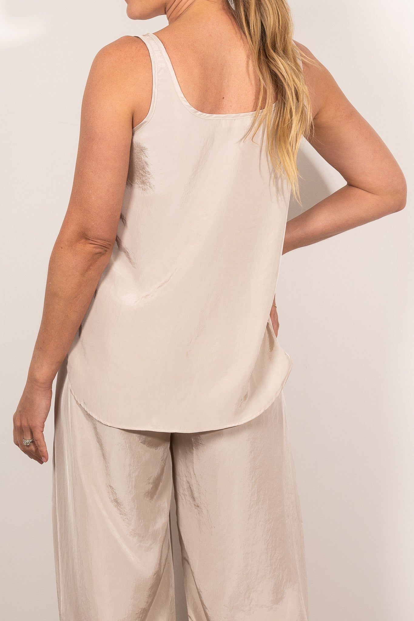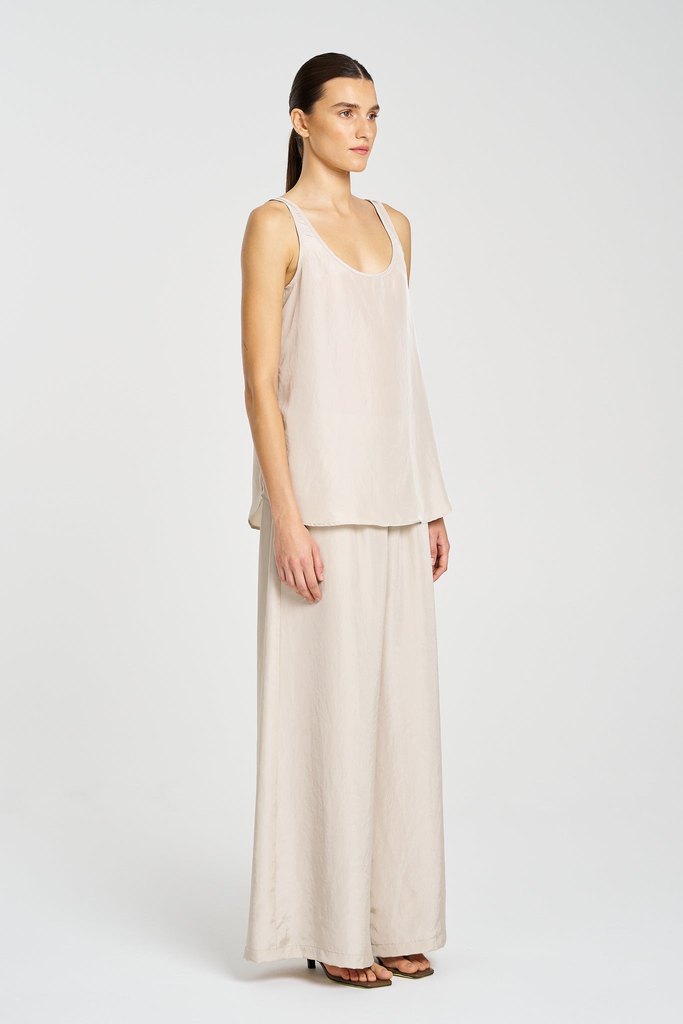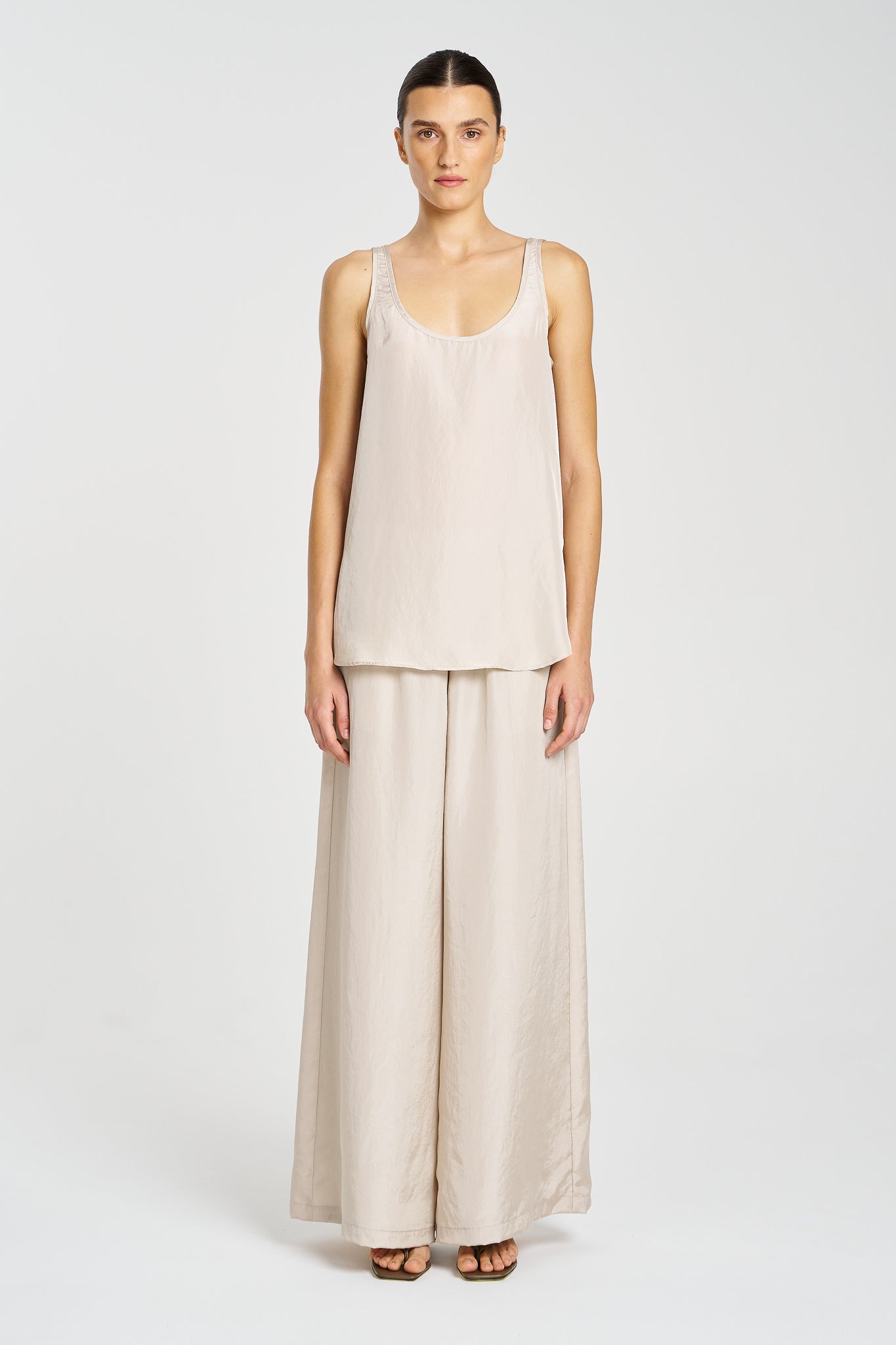 Lightweight and lustrous, the Halo Tank is crafted from Mela Purdie’s signature Technical Tumbled Taffeta — a Japanese fabrication with parchment-like structure and a subtle sheen. With a low scooped neckline, curved hem, and clean sleeveless silhouette, this elevated essential balances structure with fluidity. Perfect for layering or worn solo for minimalist impact.