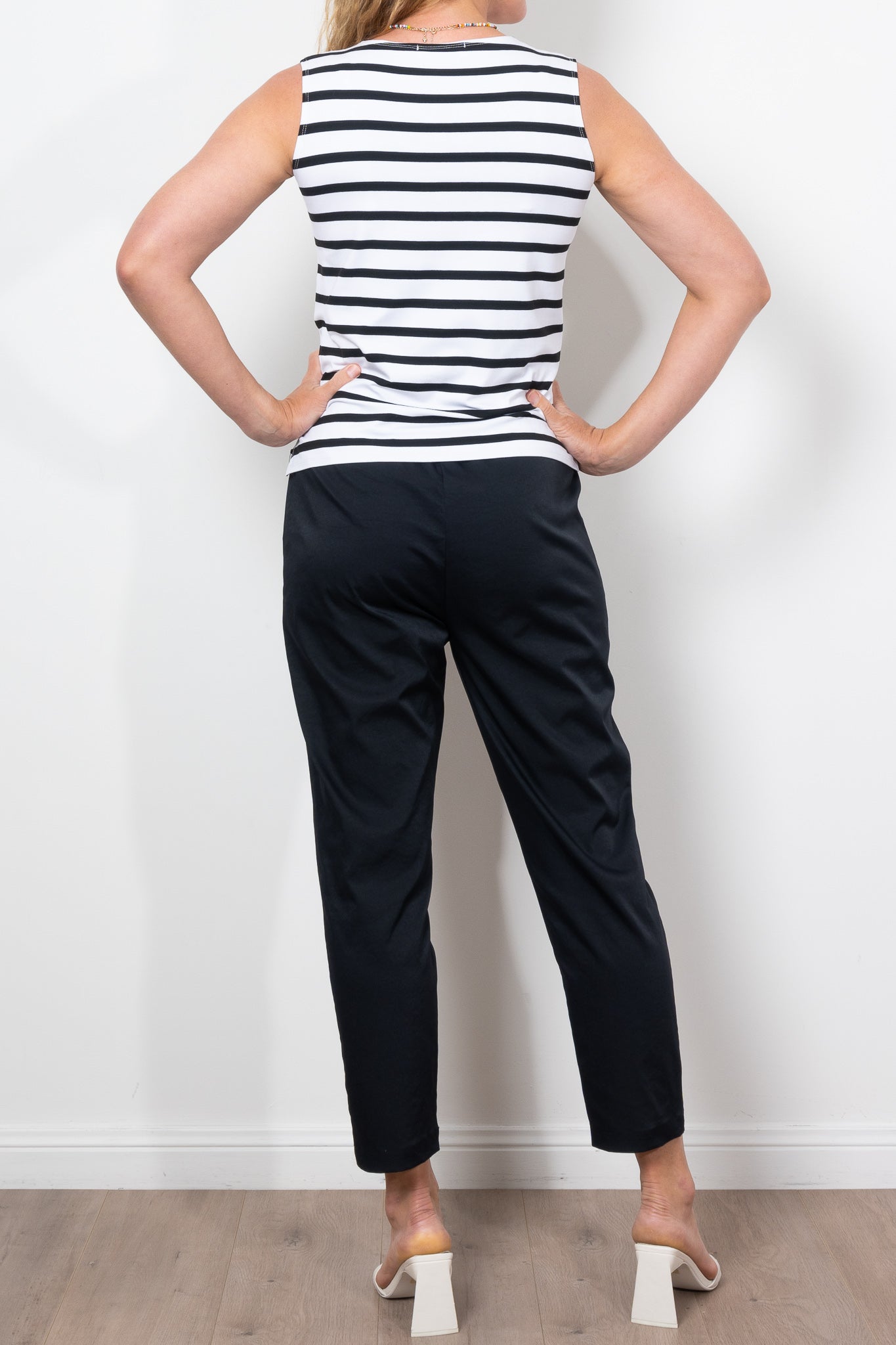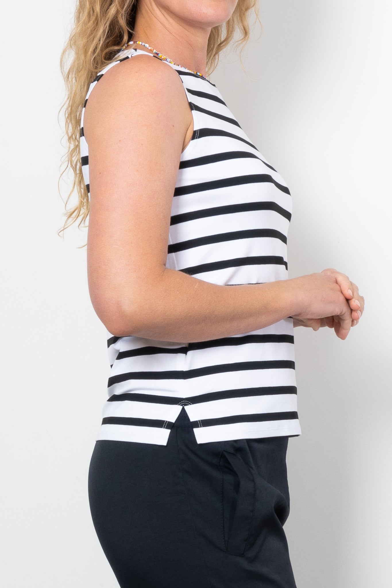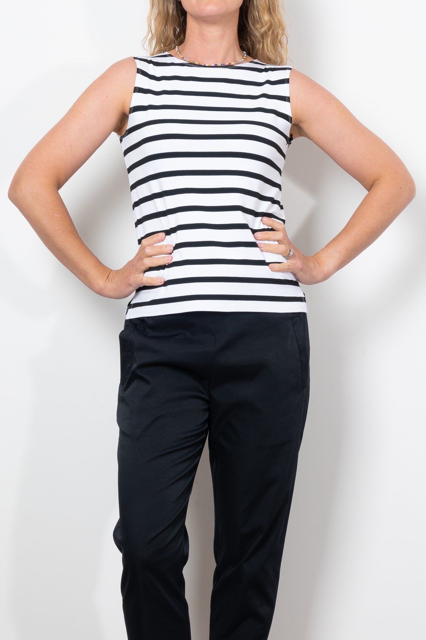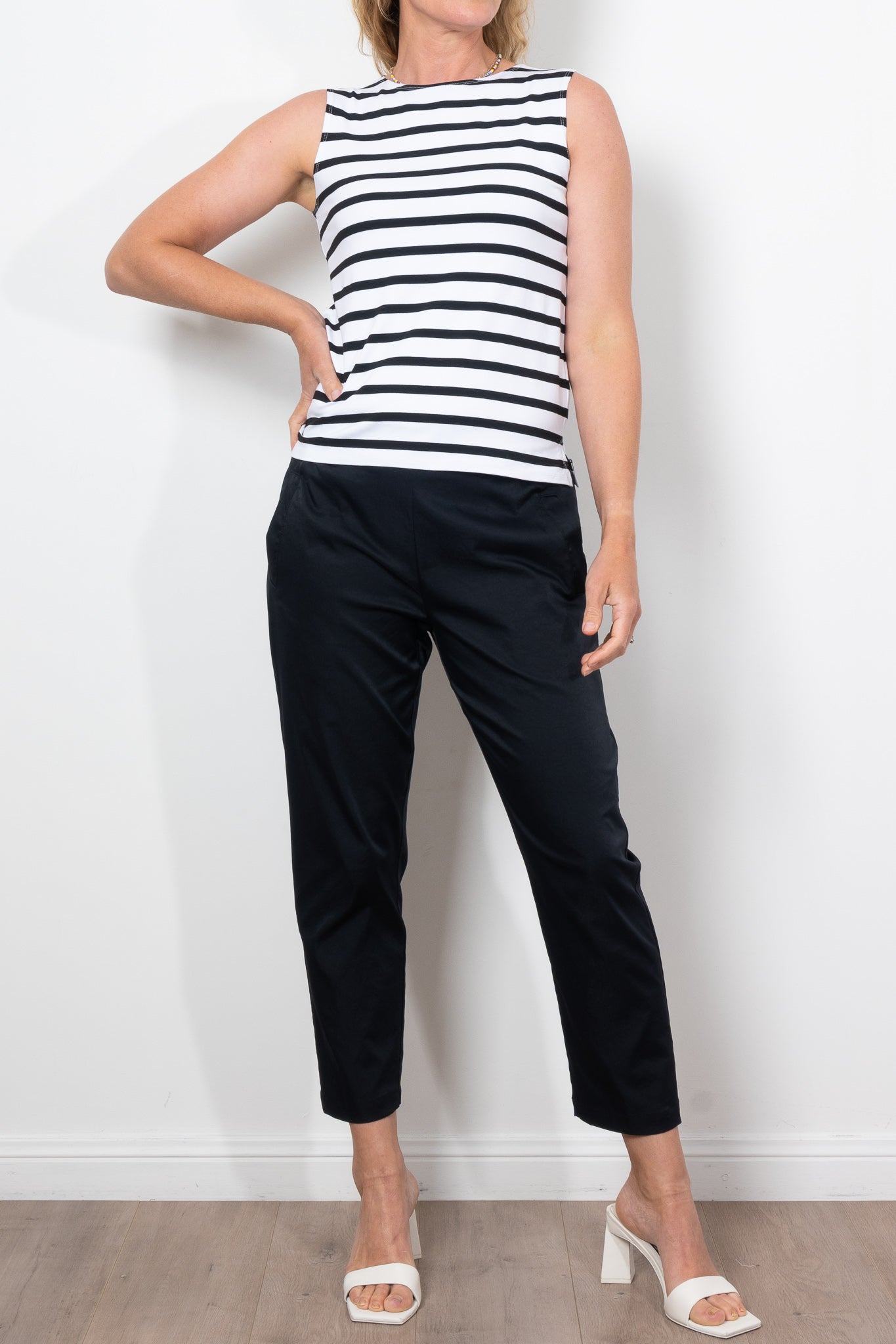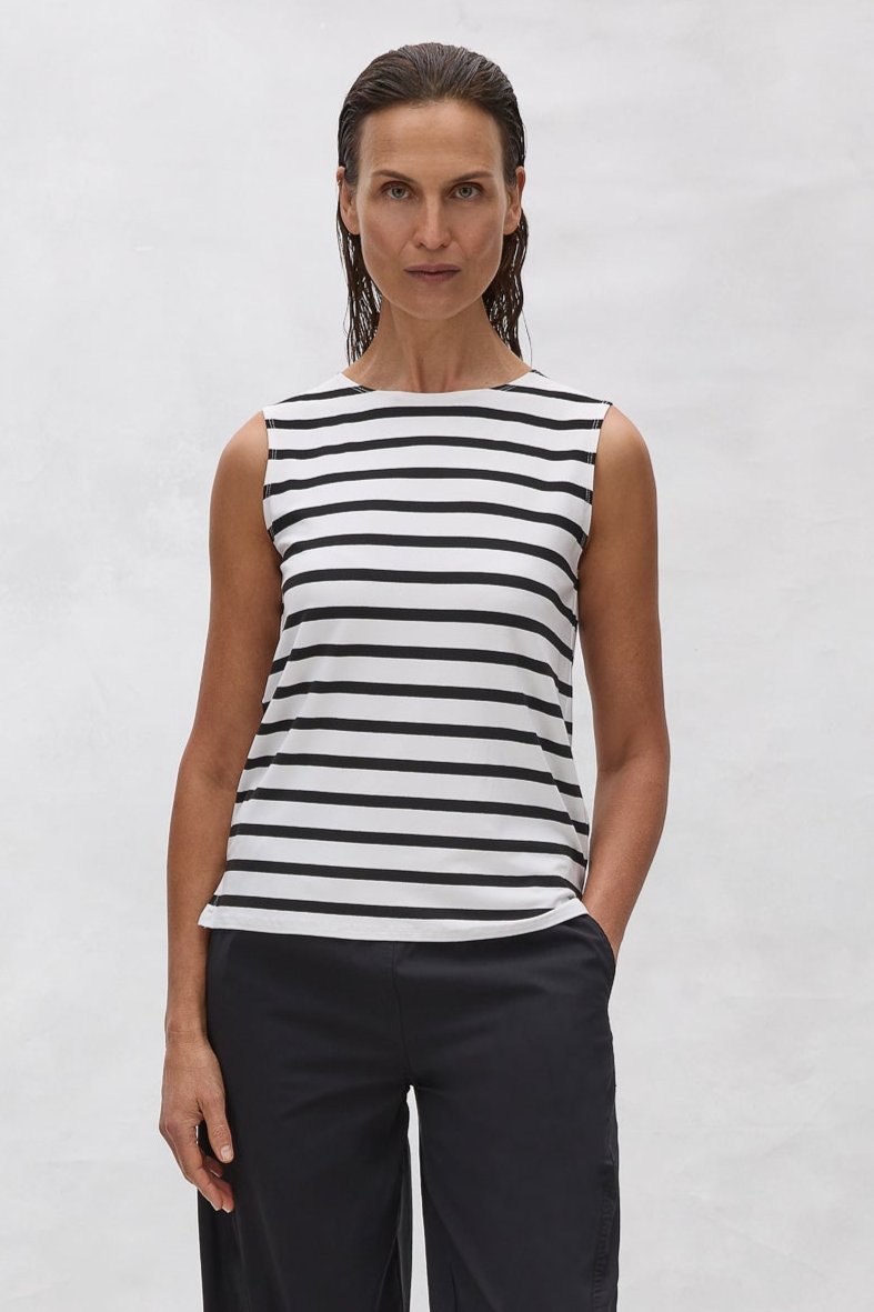 Discover the versatility and stylish design of the Mela Purdie Palazzo Shell. Featuring a timeless silhouette and a custom-designed Trunk Striped Jersey fabric, this knit top offers a mid-weight, matte texture that contrasts bold black stripes on a neutral base. With a relaxed fit and subtle side splits, this piece is perfect for any occasion.