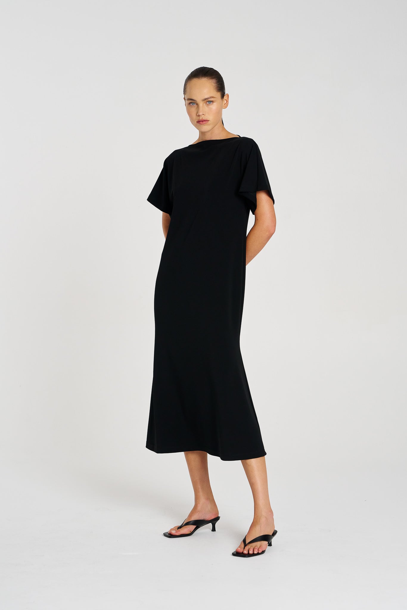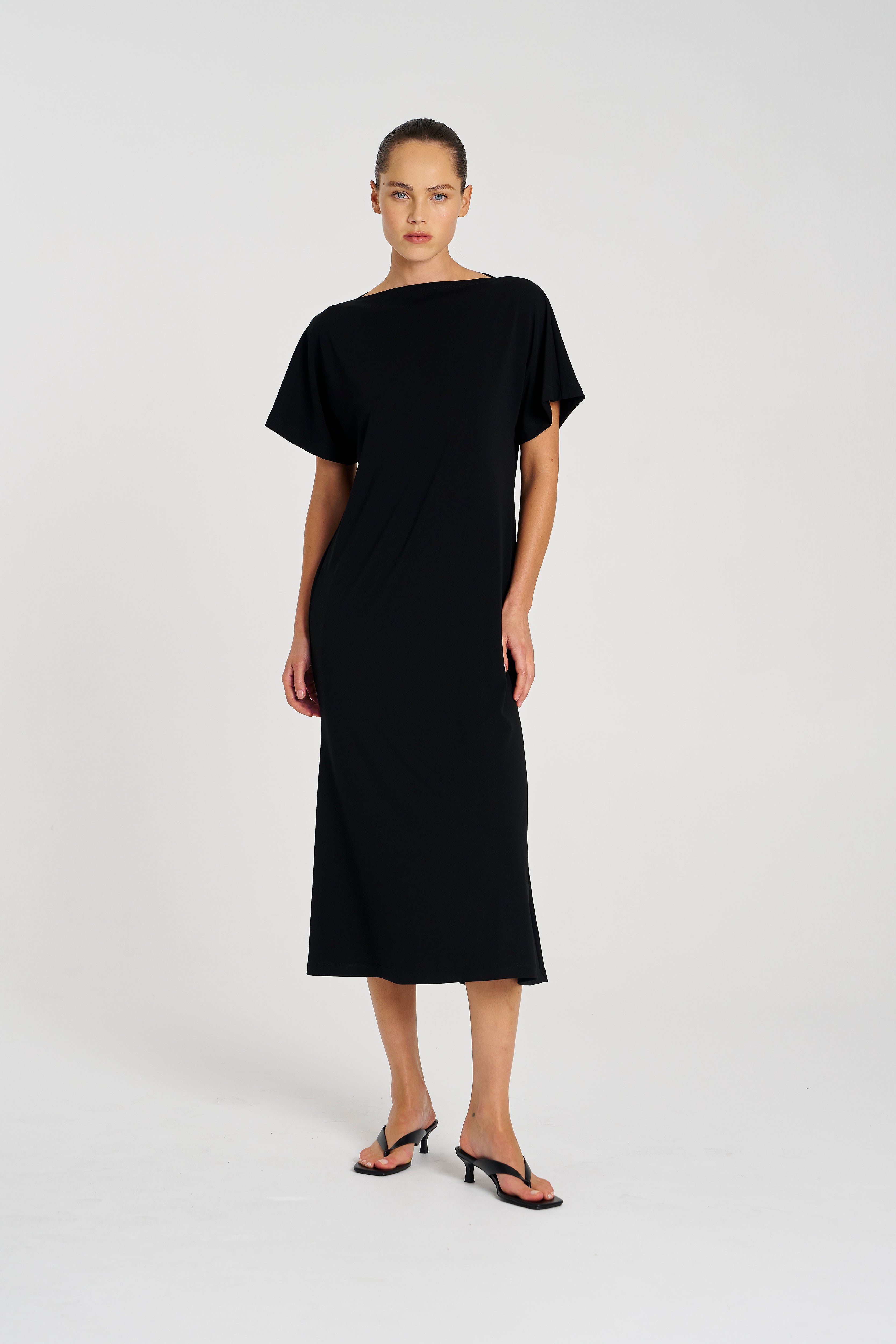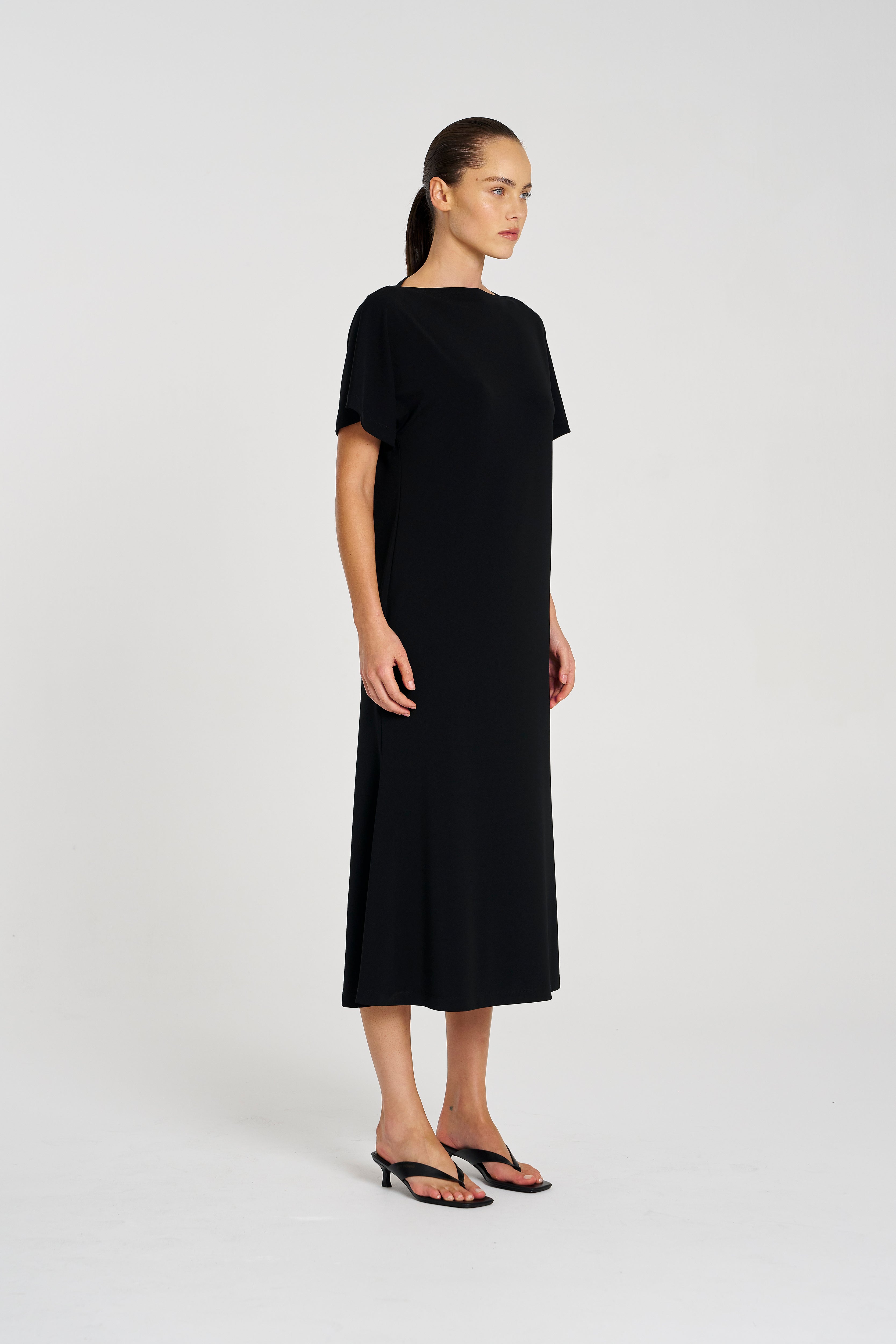 Crafted in Mela Purdie’s classic matte finish Powder Knit, this dress is the definition of versatile sophistication. The flattering boat neckline, fluid sleeves, and fit-and-flare silhouette create a refined shape that drapes beautifully, making it equally suited for effortless daytime wear or elevated evening moments. Lightweight, crease-resistant, and quick drying, it’s a travel-friendly piece you’ll wear on repeat.