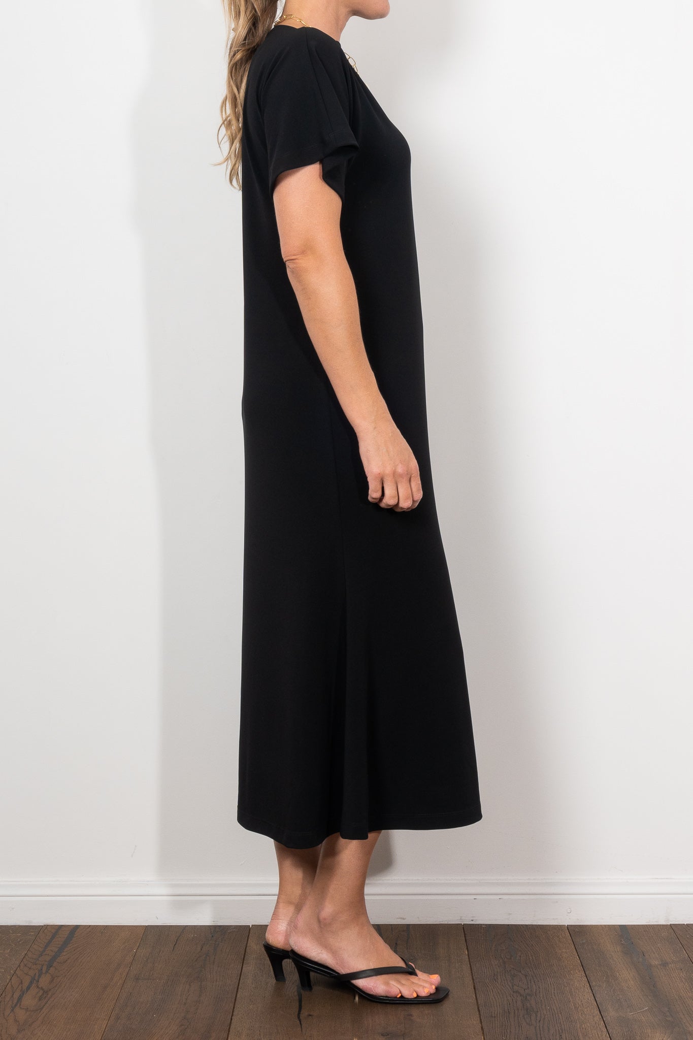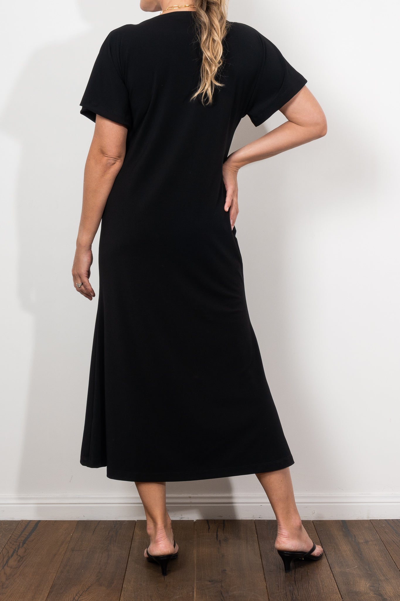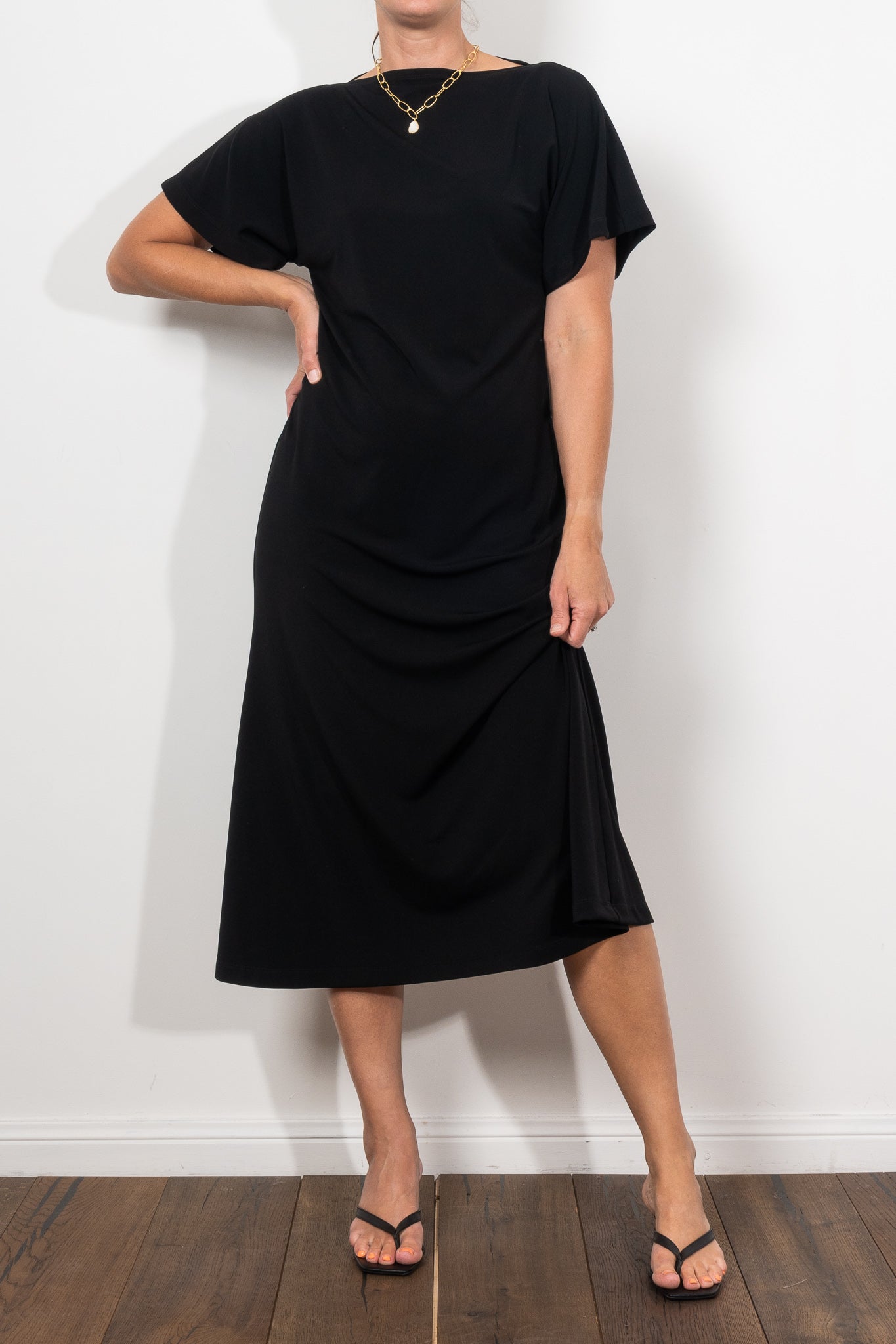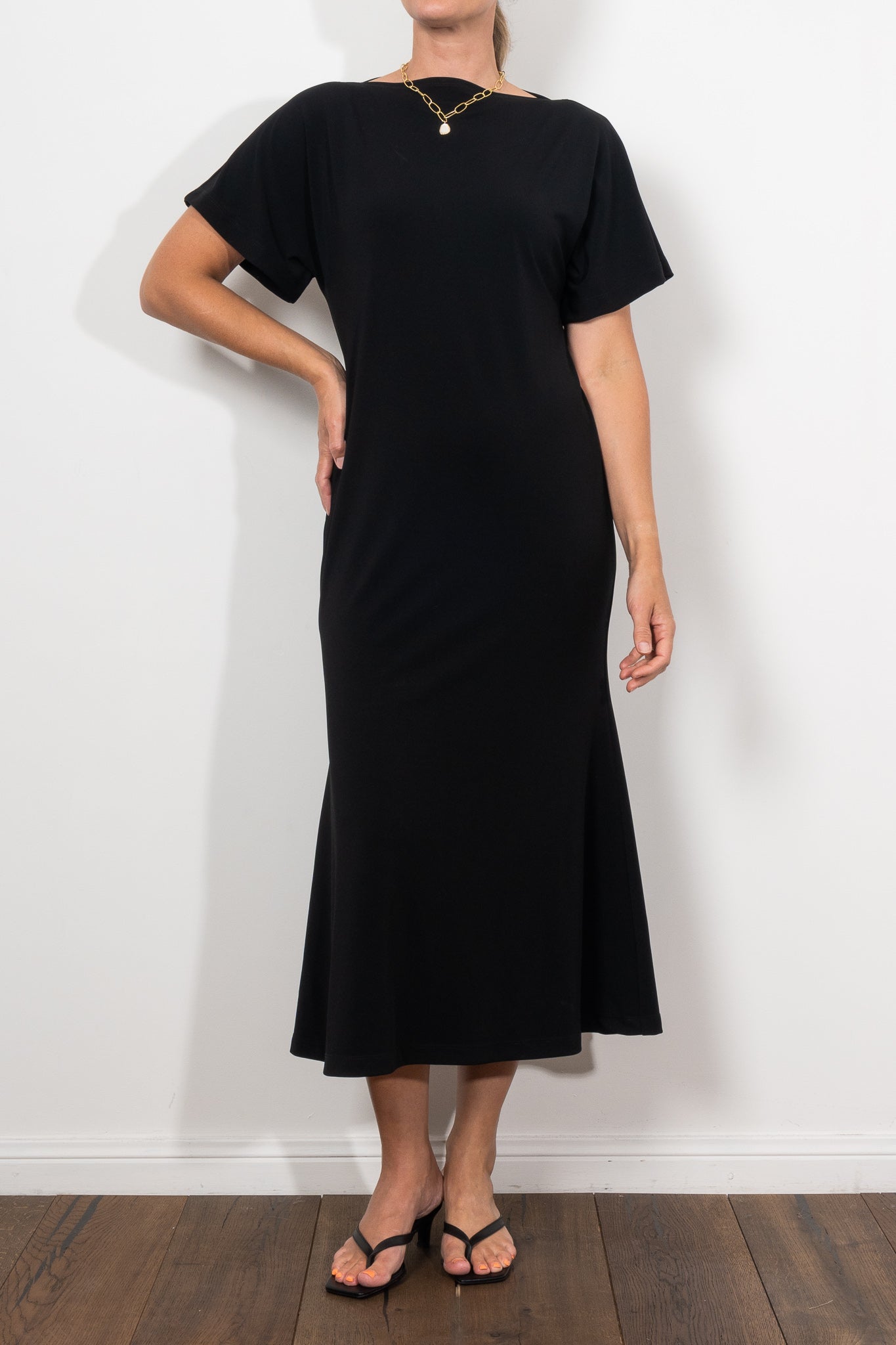 Crafted in Mela Purdie’s classic matte finish Powder Knit, this dress is the definition of versatile sophistication. The flattering boat neckline, fluid sleeves, and fit-and-flare silhouette create a refined shape that drapes beautifully, making it equally suited for effortless daytime wear or elevated evening moments. Lightweight, crease-resistant, and quick drying, it’s a travel-friendly piece you’ll wear on repeat.