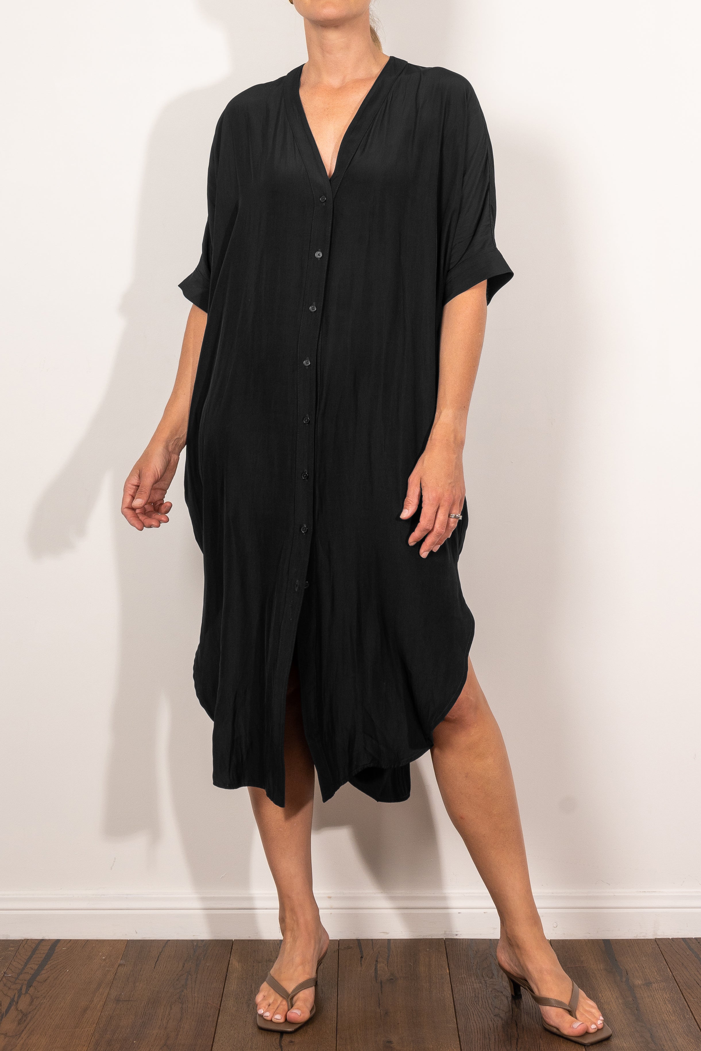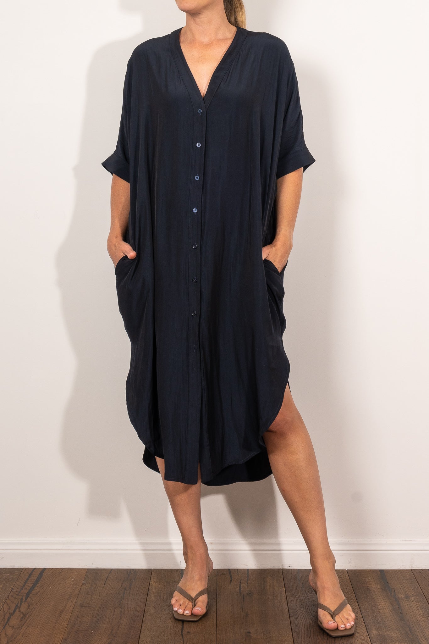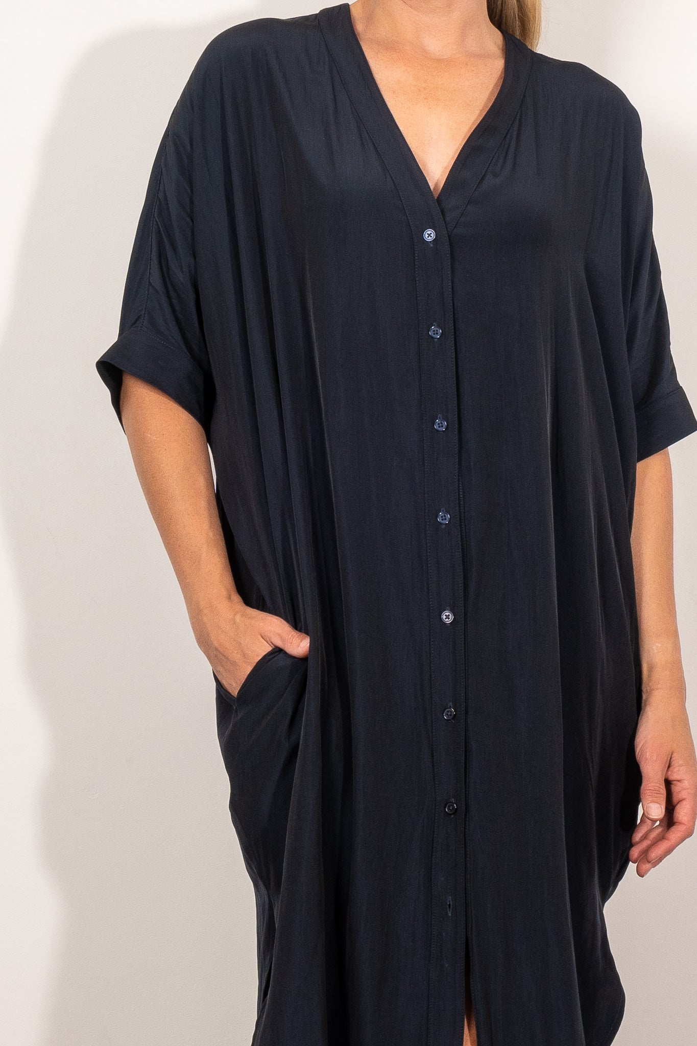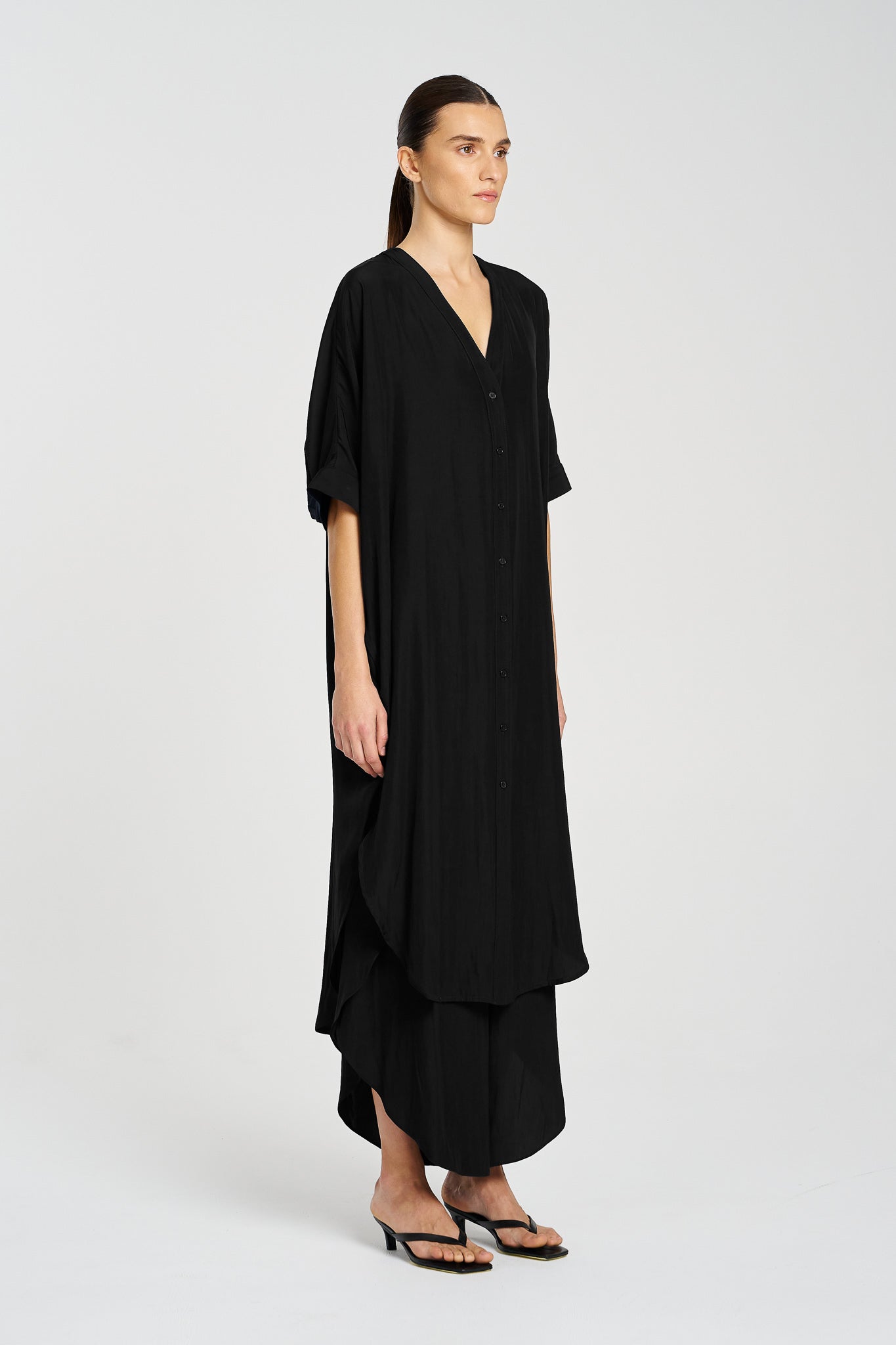 Crafted from Mela Purdie’s signature Mache—a softly structured Japanese fabric with a smooth, lustrous finish—the Villa Tabbard is the kind of effortless piece you’ll reach for season after season. Designed with a fluid drape and flattering fluted hemline, it features a full button front and short sleeves with relaxed shoulder coverage. Wear it buttoned up as a dress, open over pants as a duster-style layer, or belted at the waist for shape. Available in classic Black and Navy.