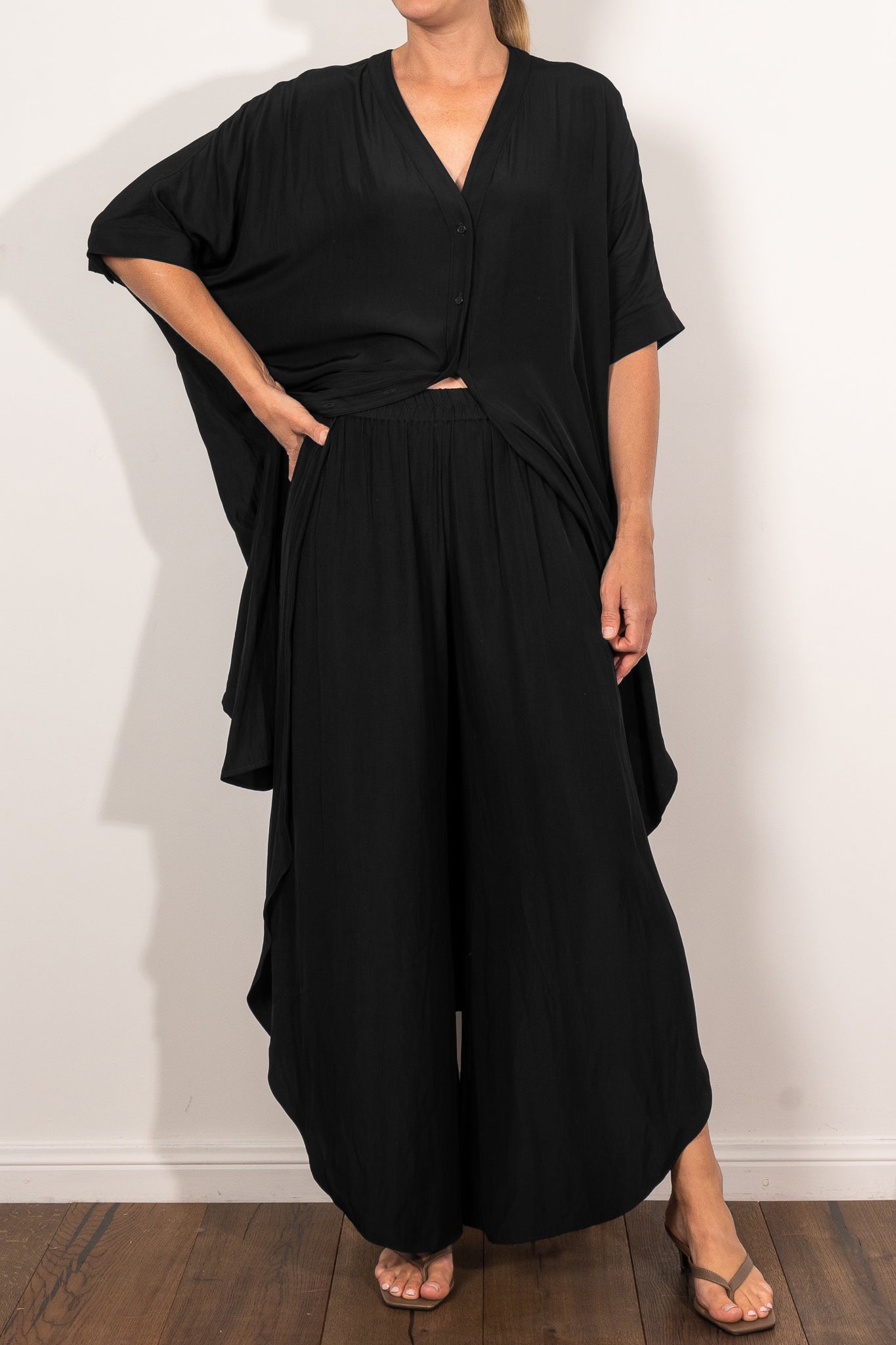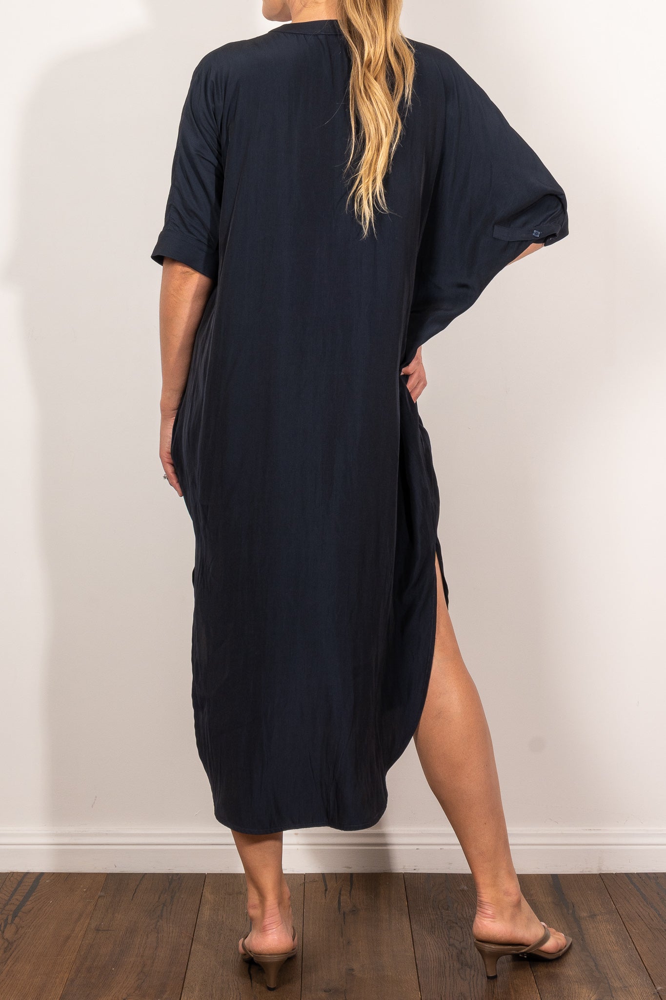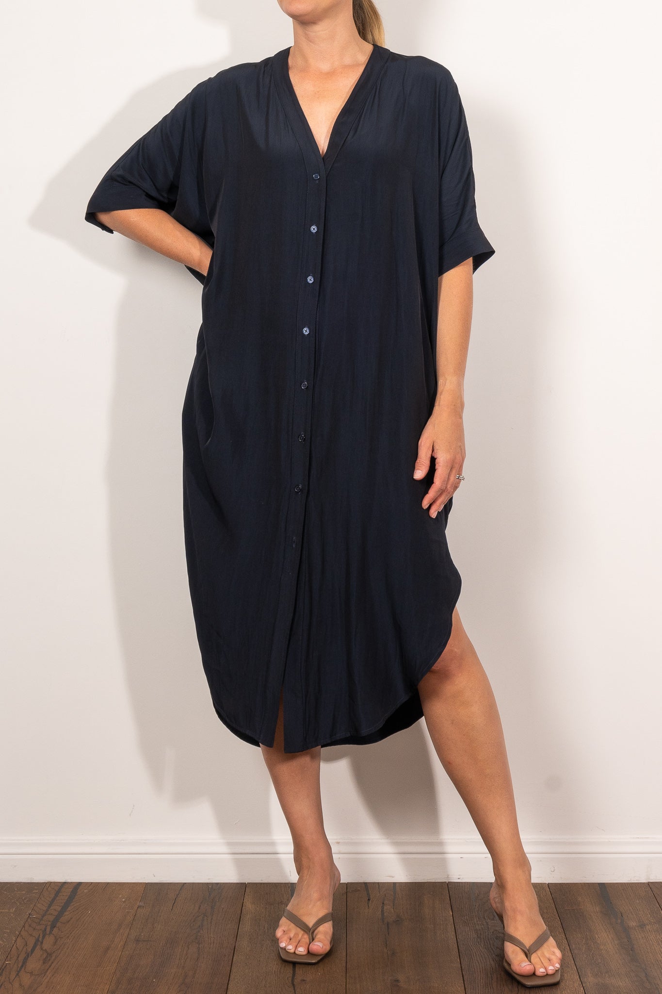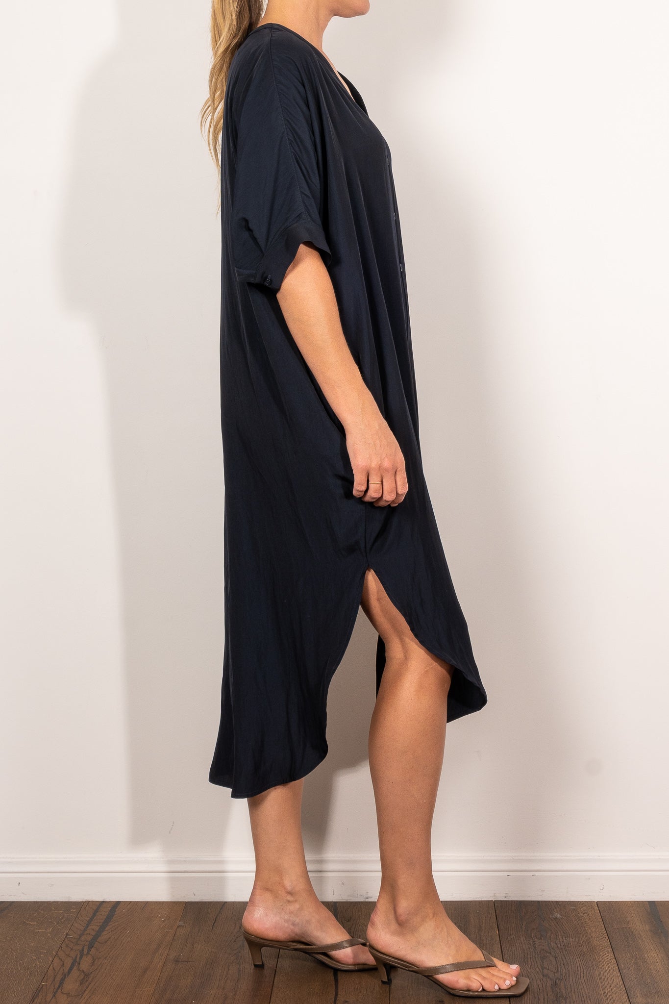 Crafted from Mela Purdie’s signature Mache—a softly structured Japanese fabric with a smooth, lustrous finish—the Villa Tabbard is the kind of effortless piece you’ll reach for season after season. Designed with a fluid drape and flattering fluted hemline, it features a full button front and short sleeves with relaxed shoulder coverage. Wear it buttoned up as a dress, open over pants as a duster-style layer, or belted at the waist for shape. Available in classic Black and Navy.