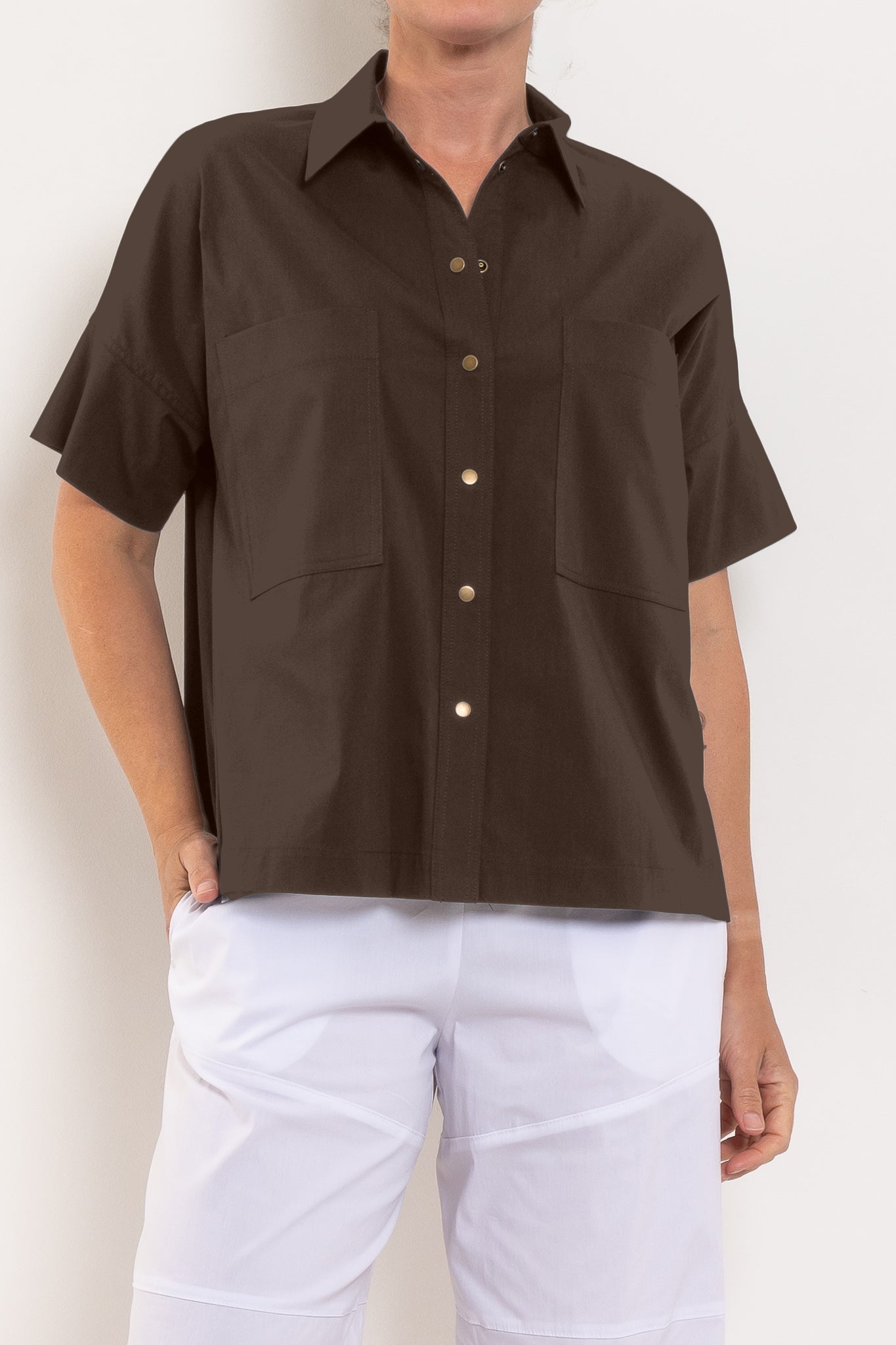 Crafted from Mela Purdie’s signature Microprene — a European cotton-blend fabric with just the right amount of stretch — this shirt delivers a sleek, structured look while remaining lightweight and comfortable. The crisp stand collar and cargo-style pockets lend a contemporary twist, while the stud front closure adds a touch of understated edge. Style it with relaxed pants, tailored denim, or the matching Curve Shorts for a clean, summer-ready look.
