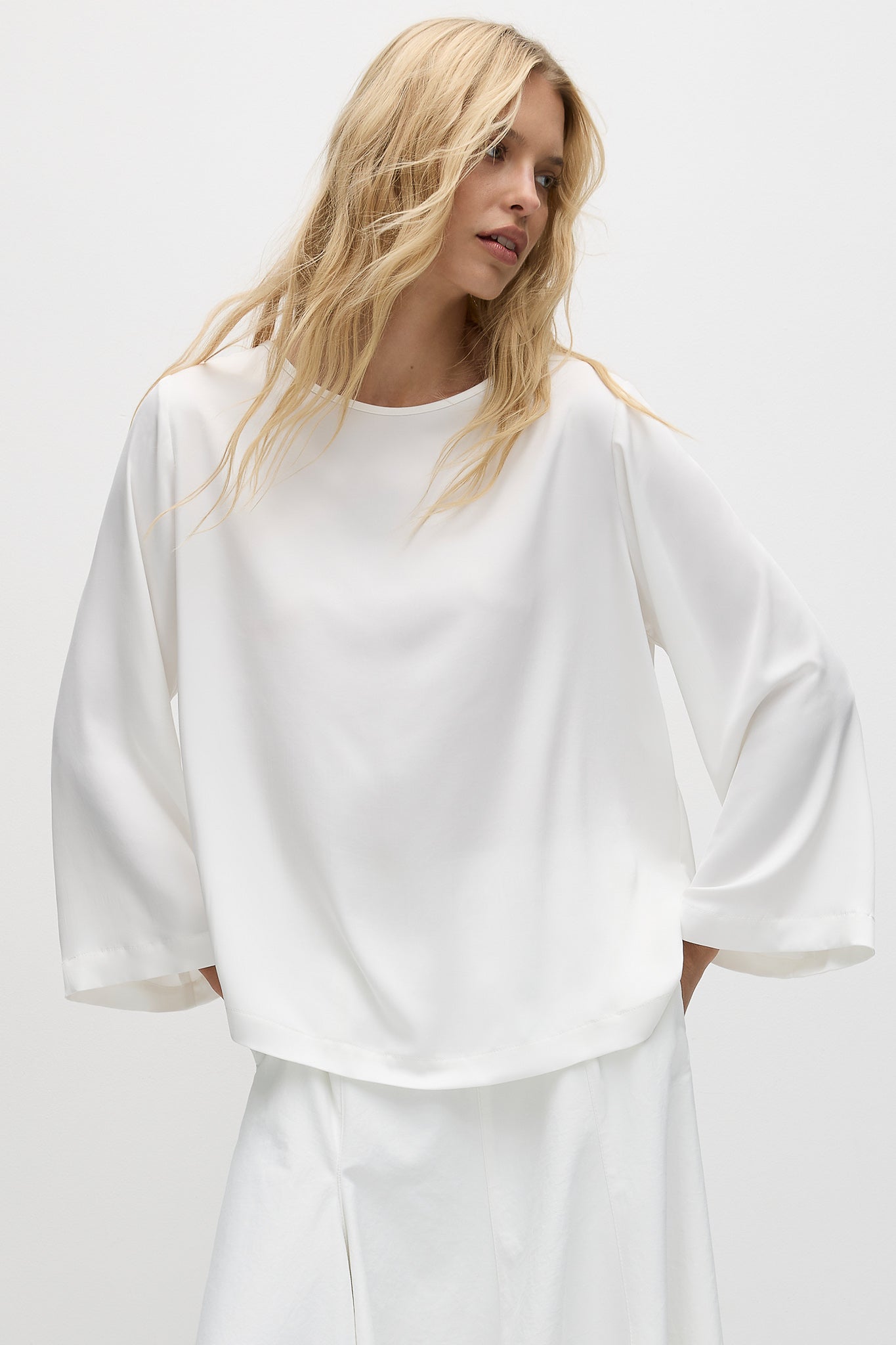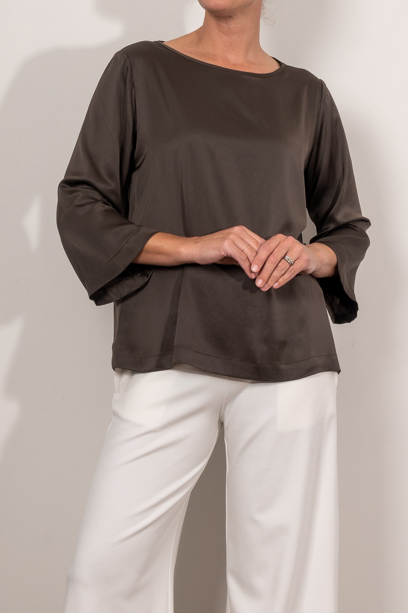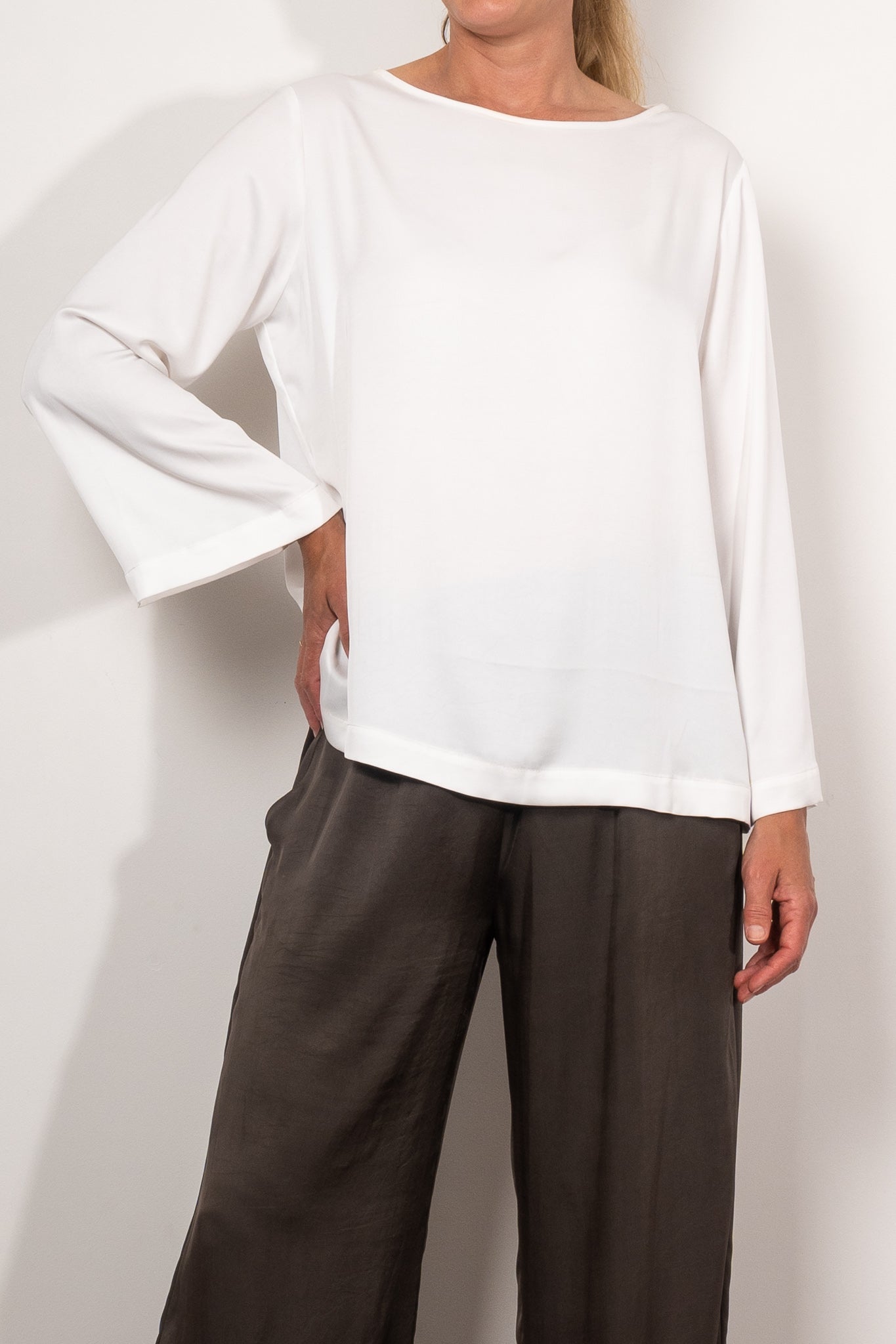 Elevate your wardrobe with the Mela Purdie Long Sleeve Slice Neck Plaza. Made in Australia from luxurious Stretch Gloss fabric, this top features a high boat neck and flared long sleeves for a sophisticated and relaxed look. The Japanese fabrication and mechanical stretch add comfort to style.