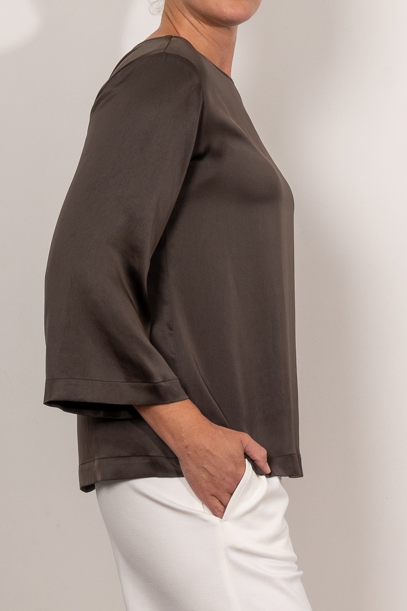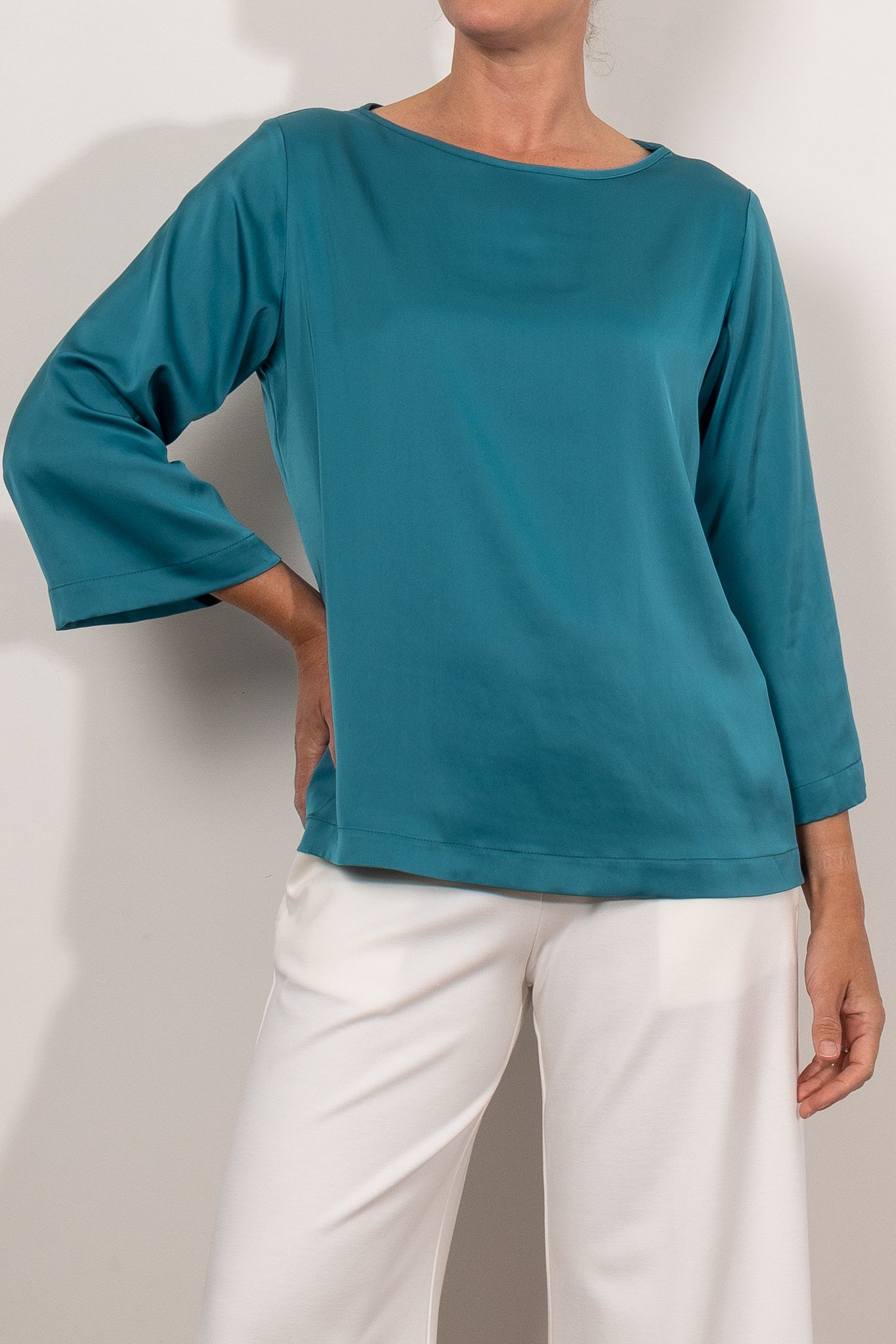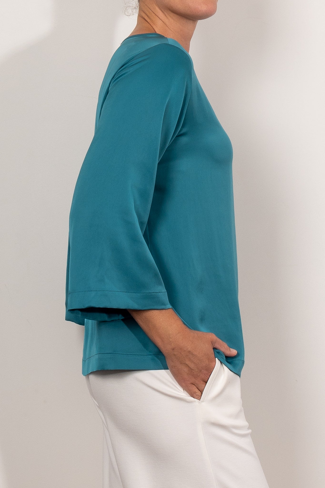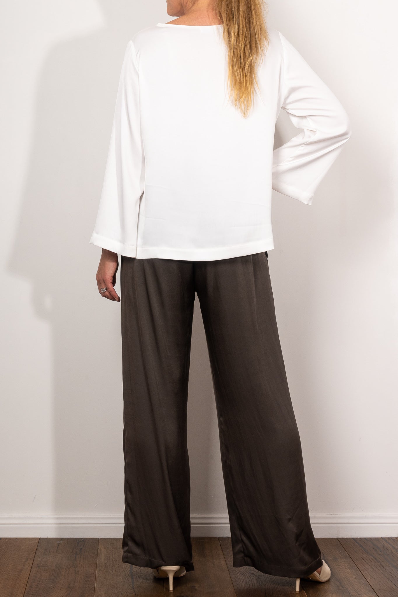 Elevate your wardrobe with the Mela Purdie Long Sleeve Slice Neck Plaza. Made in Australia from luxurious Stretch Gloss fabric, this top features a high boat neck and flared long sleeves for a sophisticated and relaxed look. The Japanese fabrication and mechanical stretch add comfort to style.