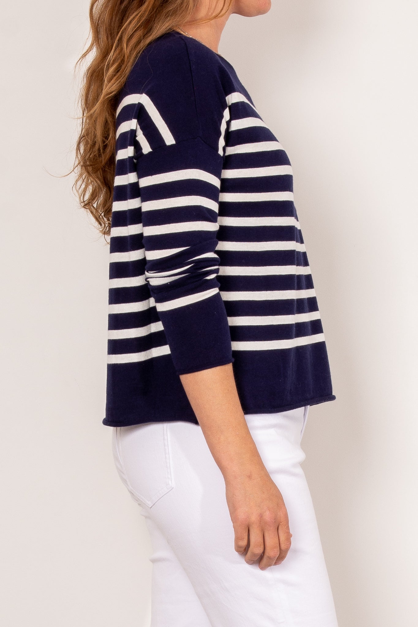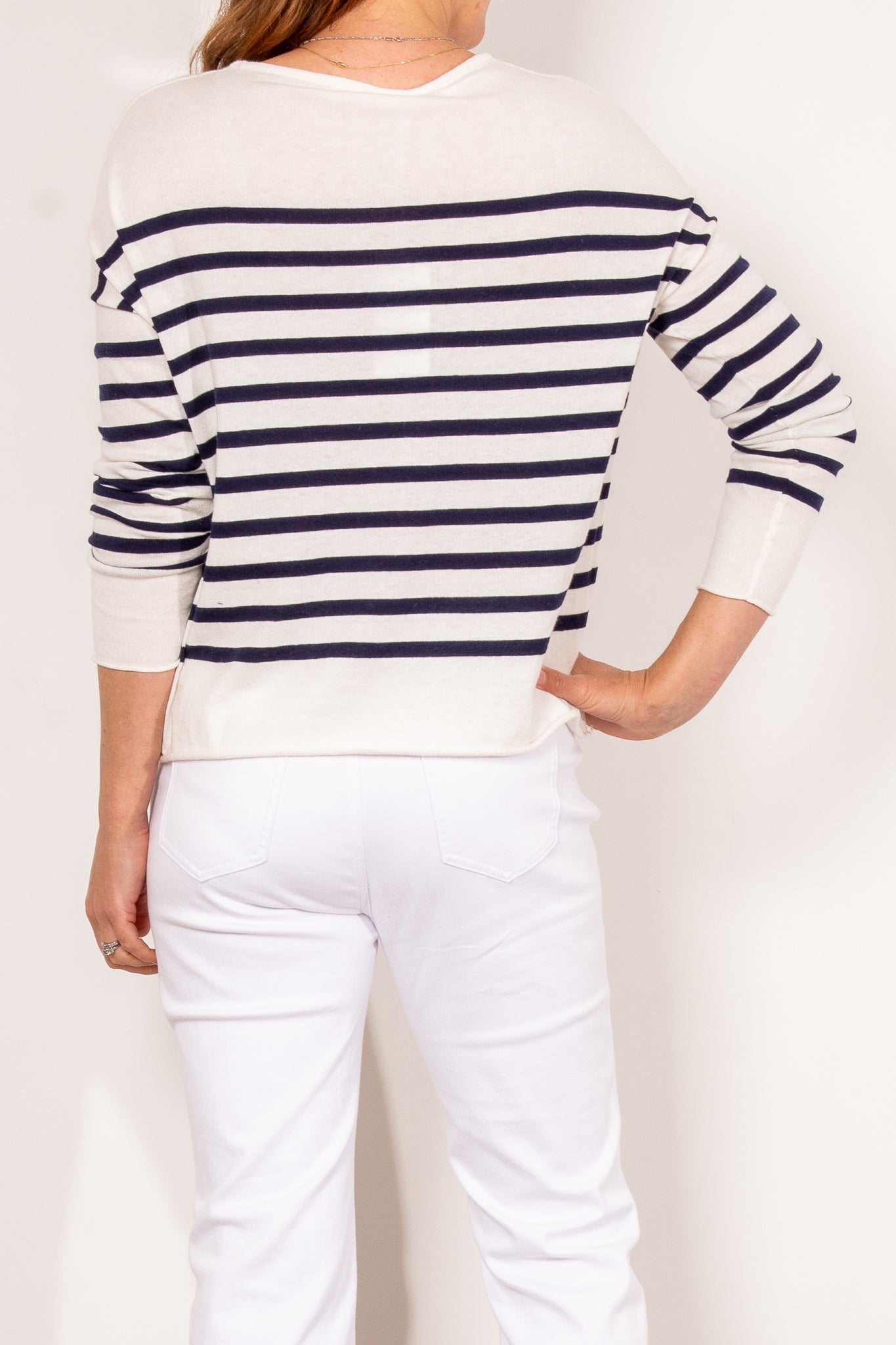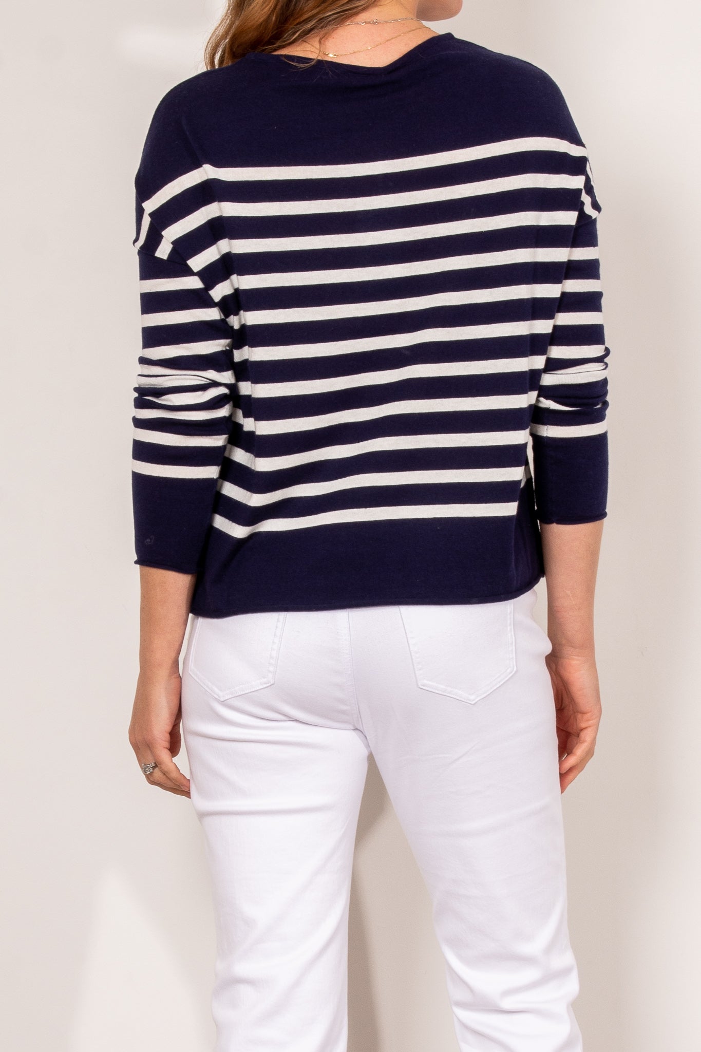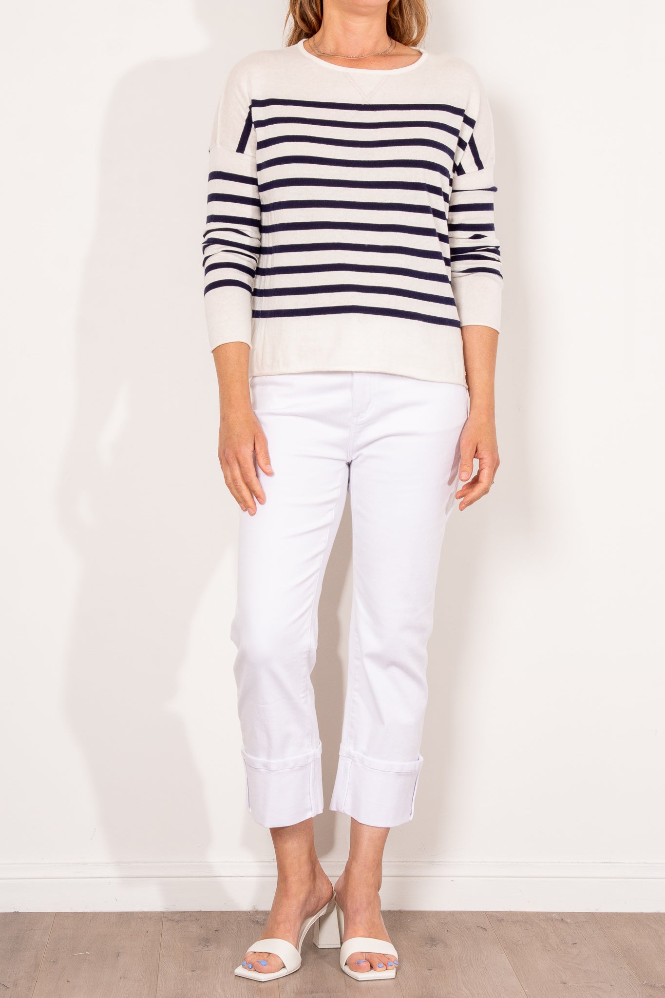 The Mia Fratino Como Stripe Crew is a must-have for effortless everyday wear. Made from a luxurious blend of cotton, silk, and cashmere, this lightweight knit offers all-day comfort and versatility. With its modern nautical-inspired design and slim cuffs, it's perfect for spring layering and summer travels. Treat yourself to the softest, most stylish addition to your wardrobe!