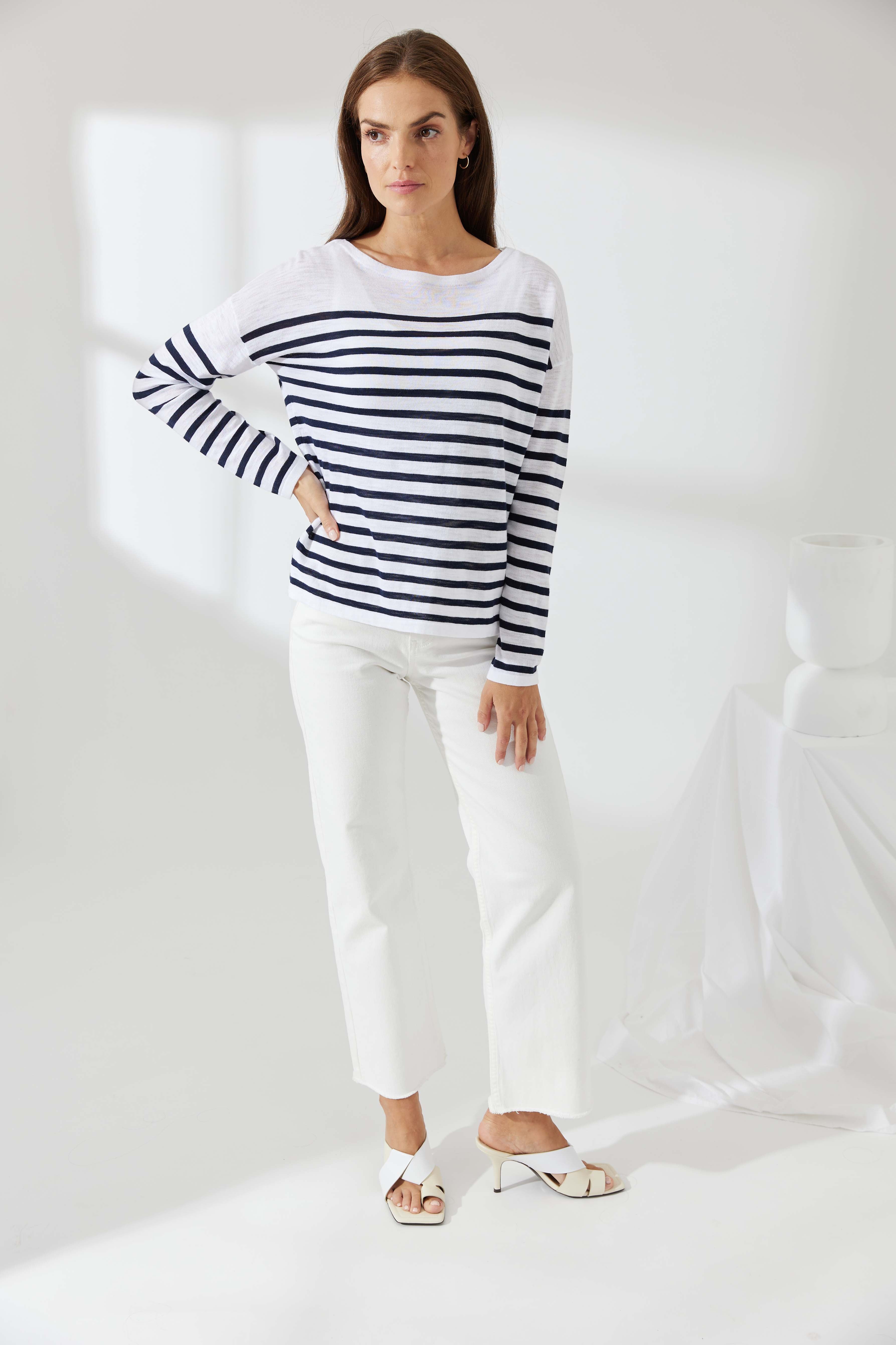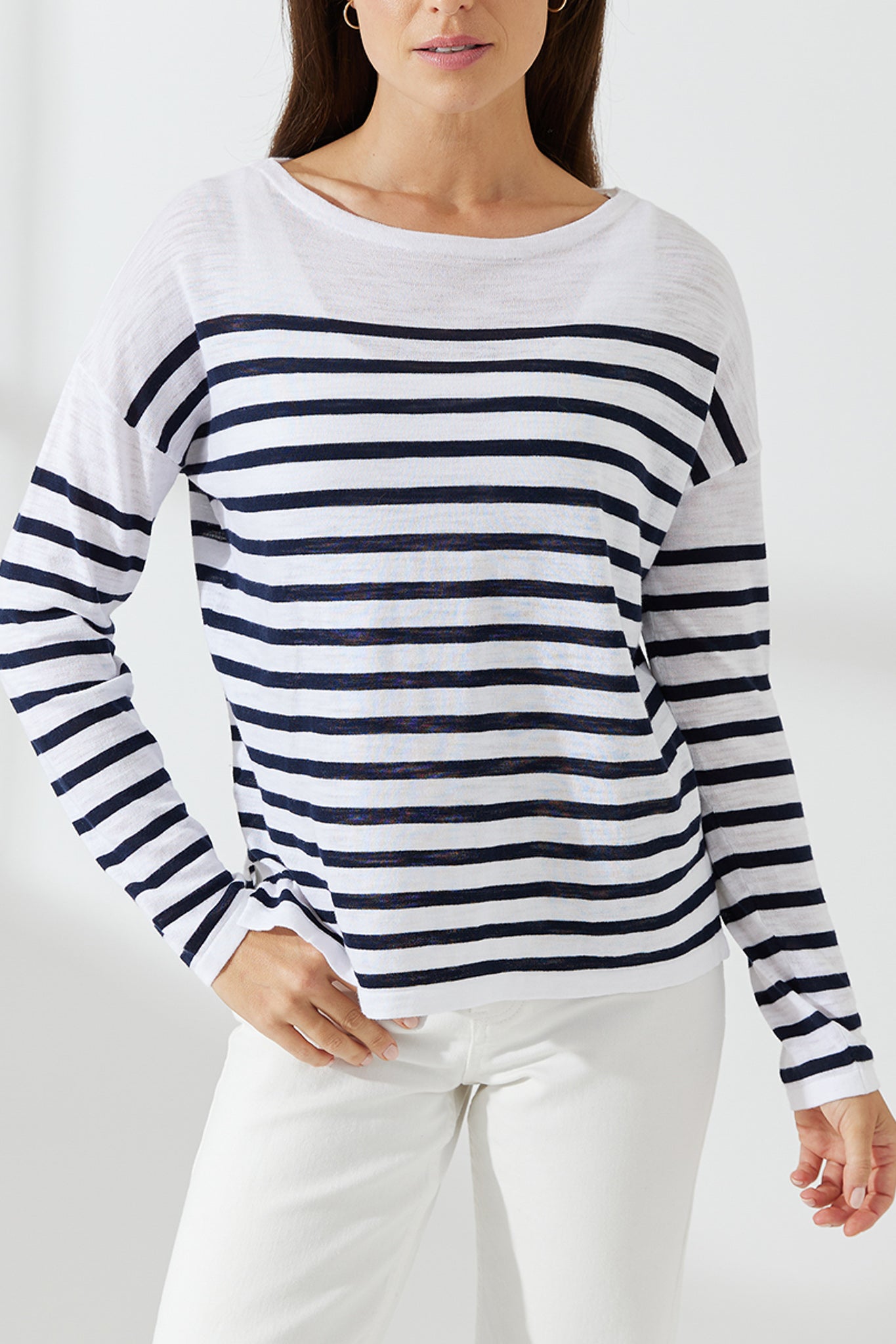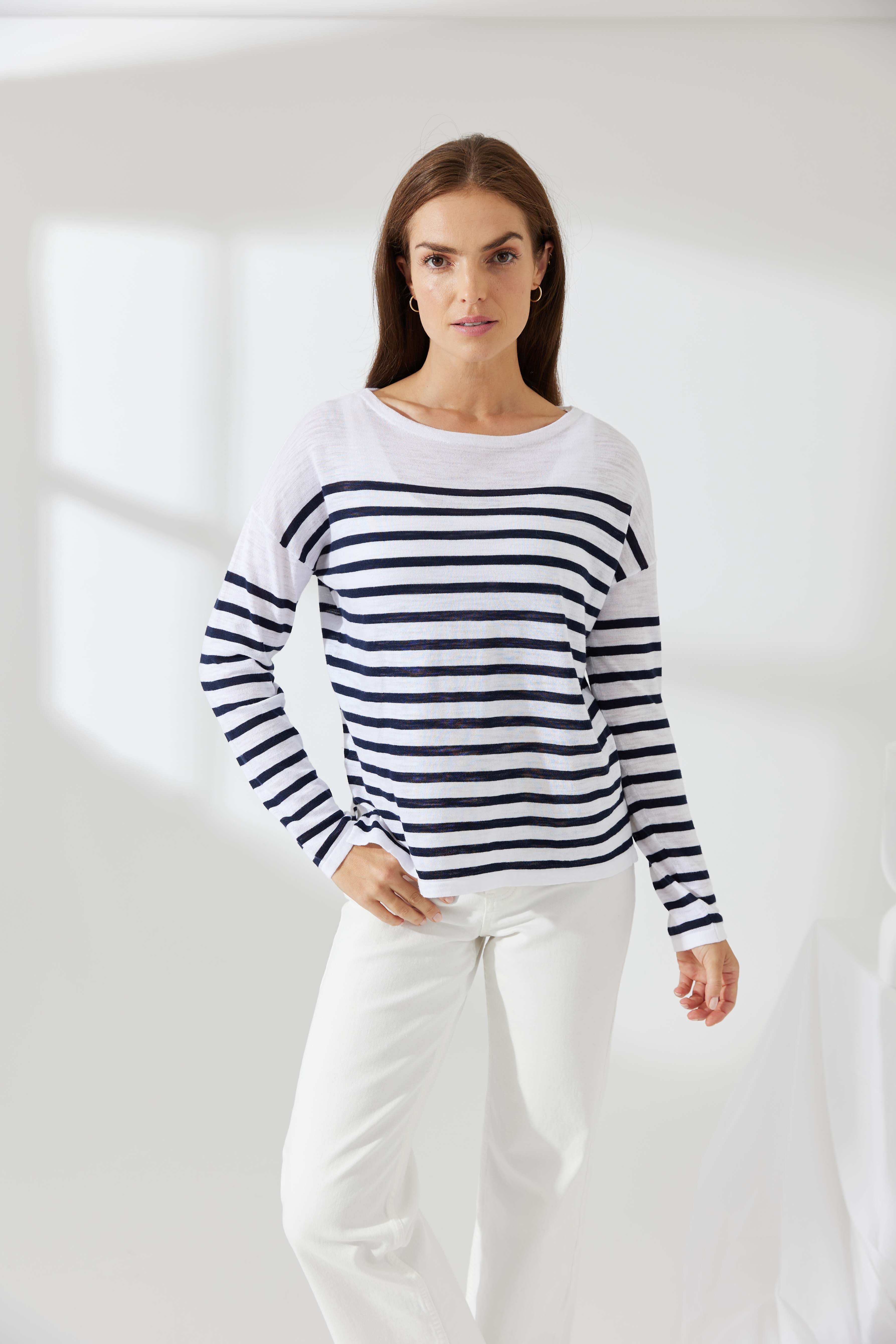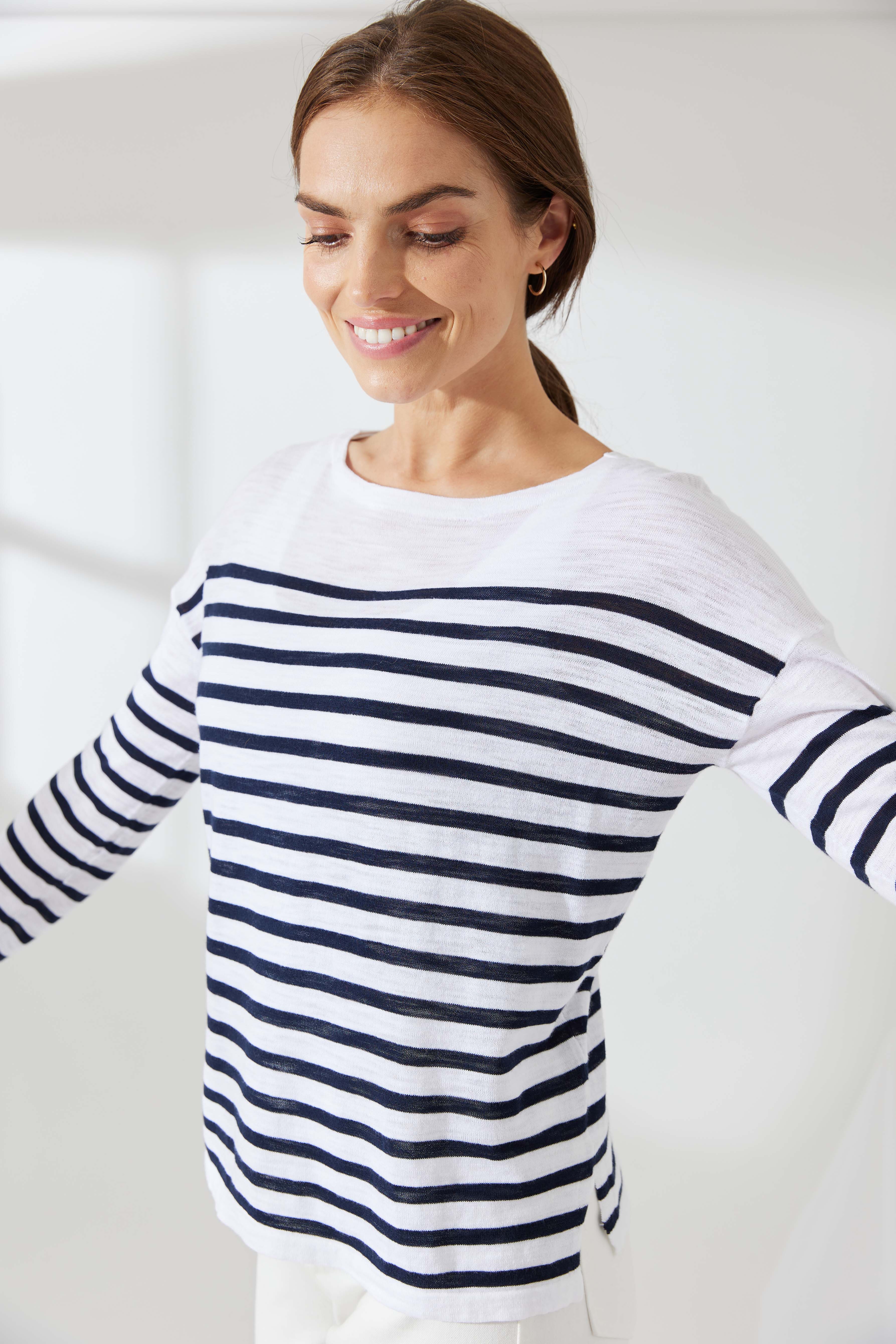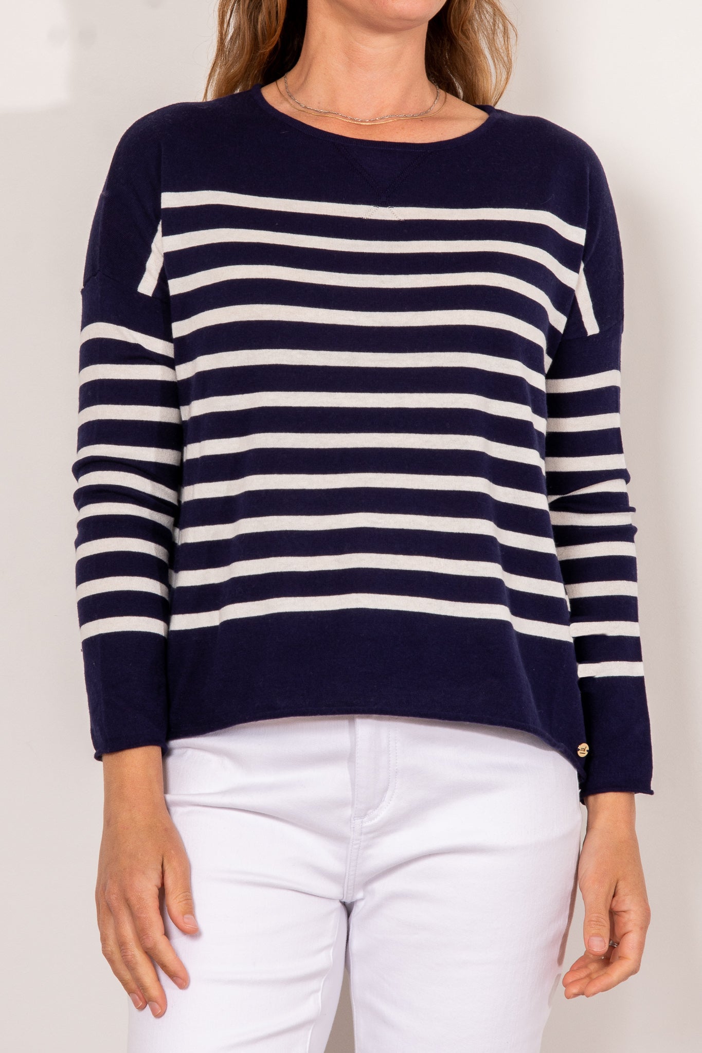 The Mia Fratino Como Stripe Crew is a must-have for effortless everyday wear. Made from a luxurious blend of cotton, silk, and cashmere, this lightweight knit offers all-day comfort and versatility. With its modern nautical-inspired design and slim cuffs, it's perfect for spring layering and summer travels. Treat yourself to the softest, most stylish addition to your wardrobe!