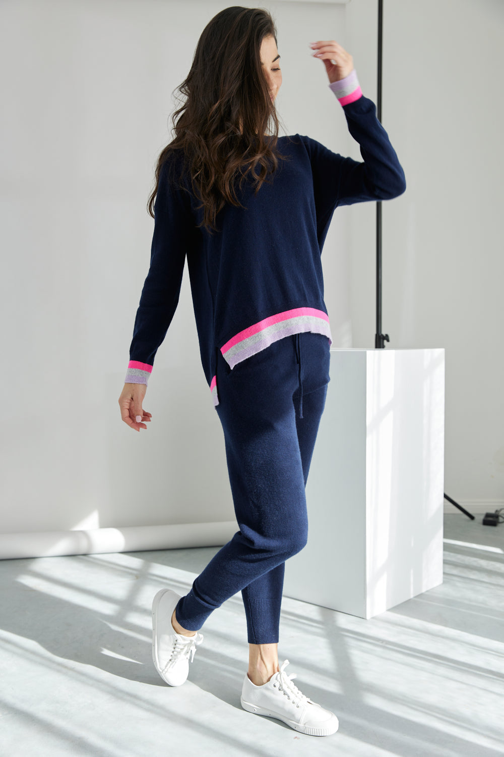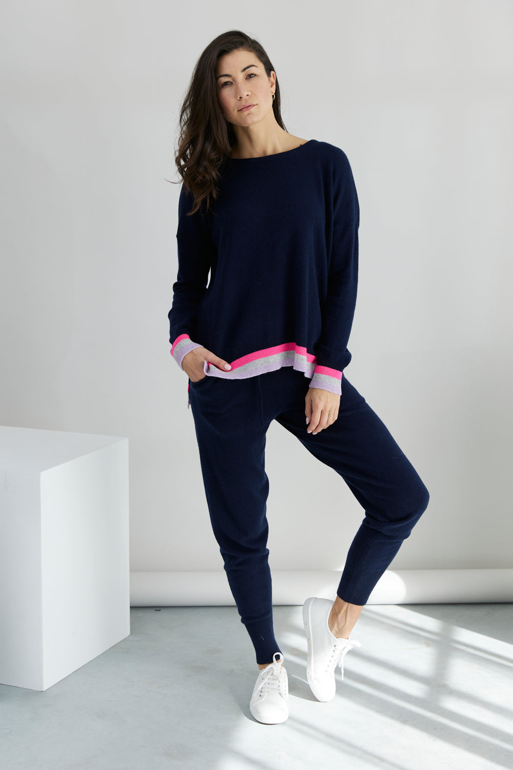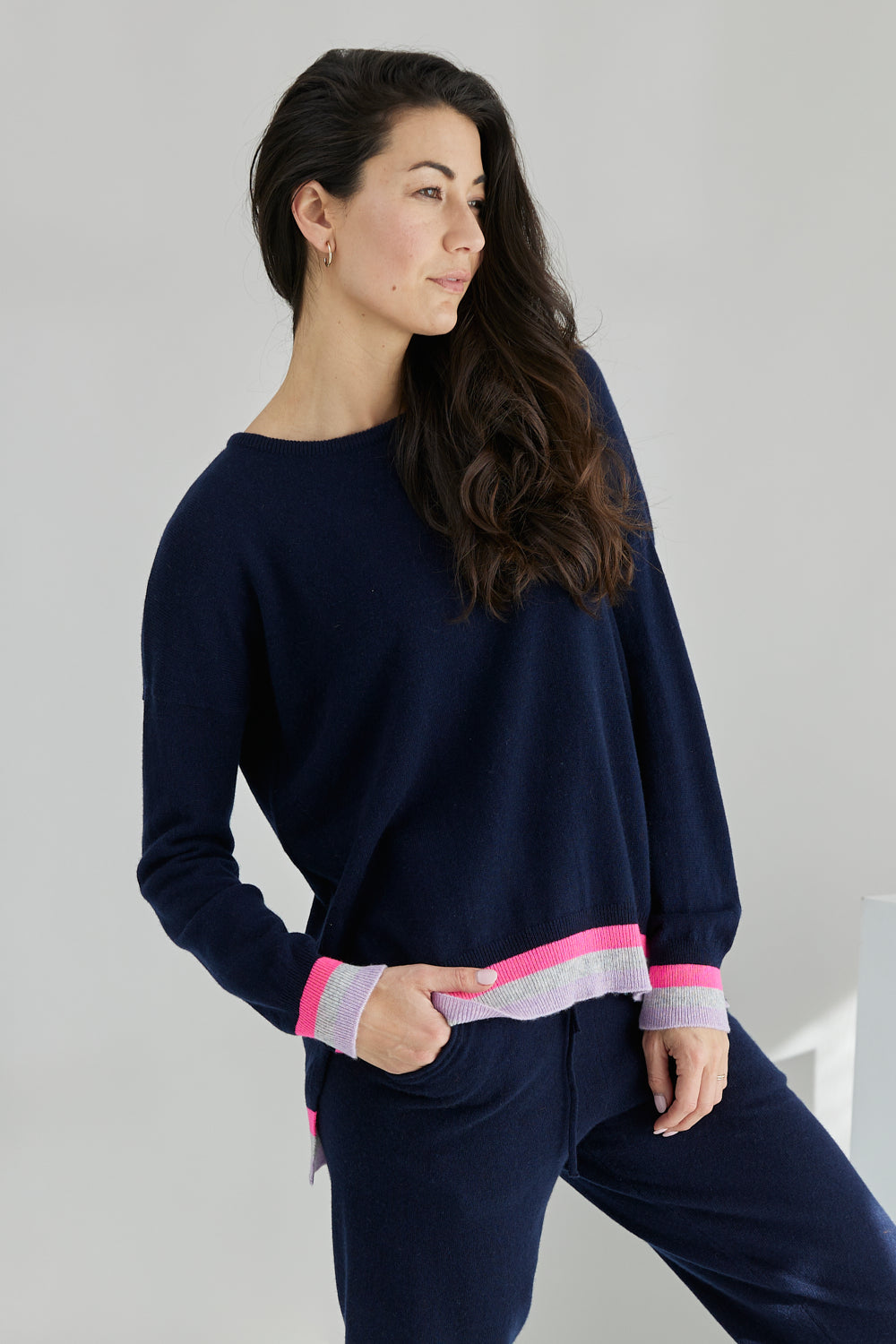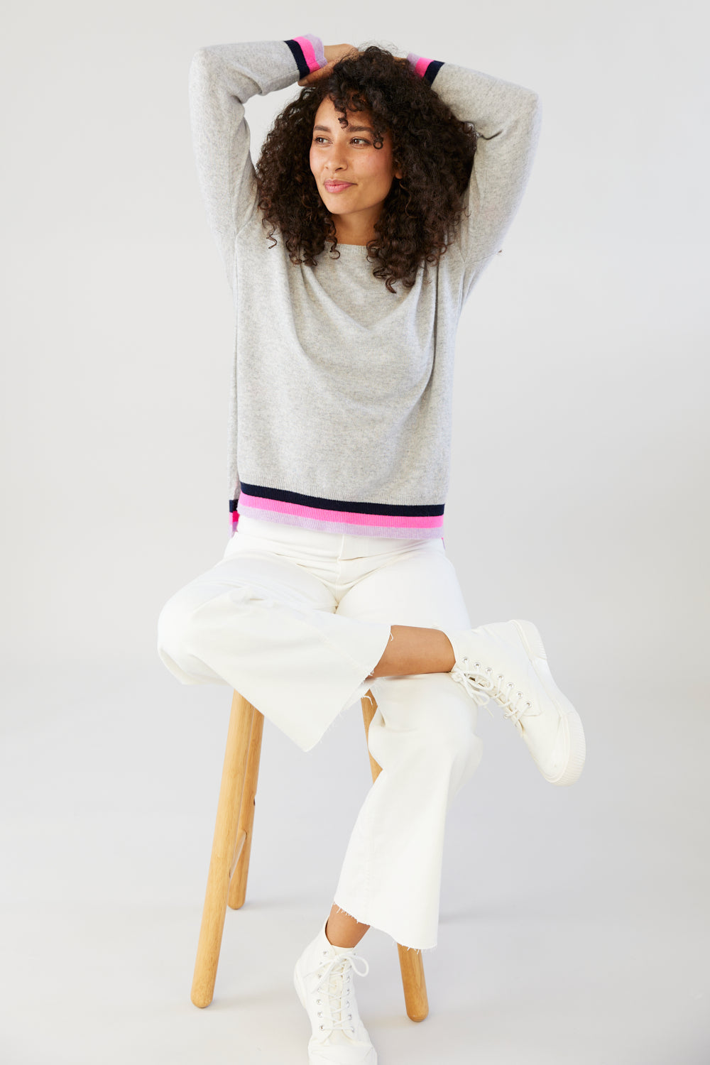 Take comfort to the next level in our 100% cashmere Sia Contrast Crew. Comfy enough for the couch and timeless enough for everyday wear. This garment is characterised by striped hem and cuff tips.