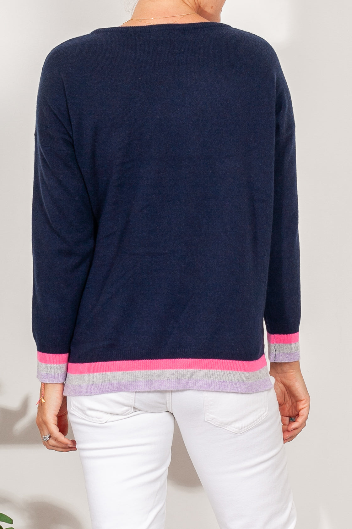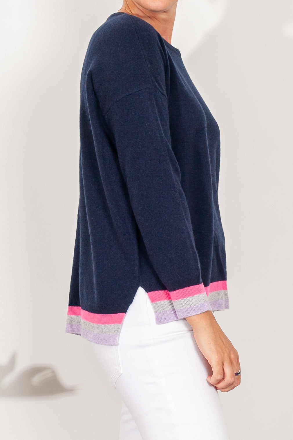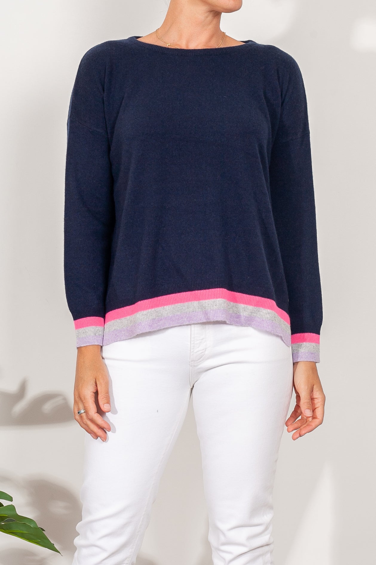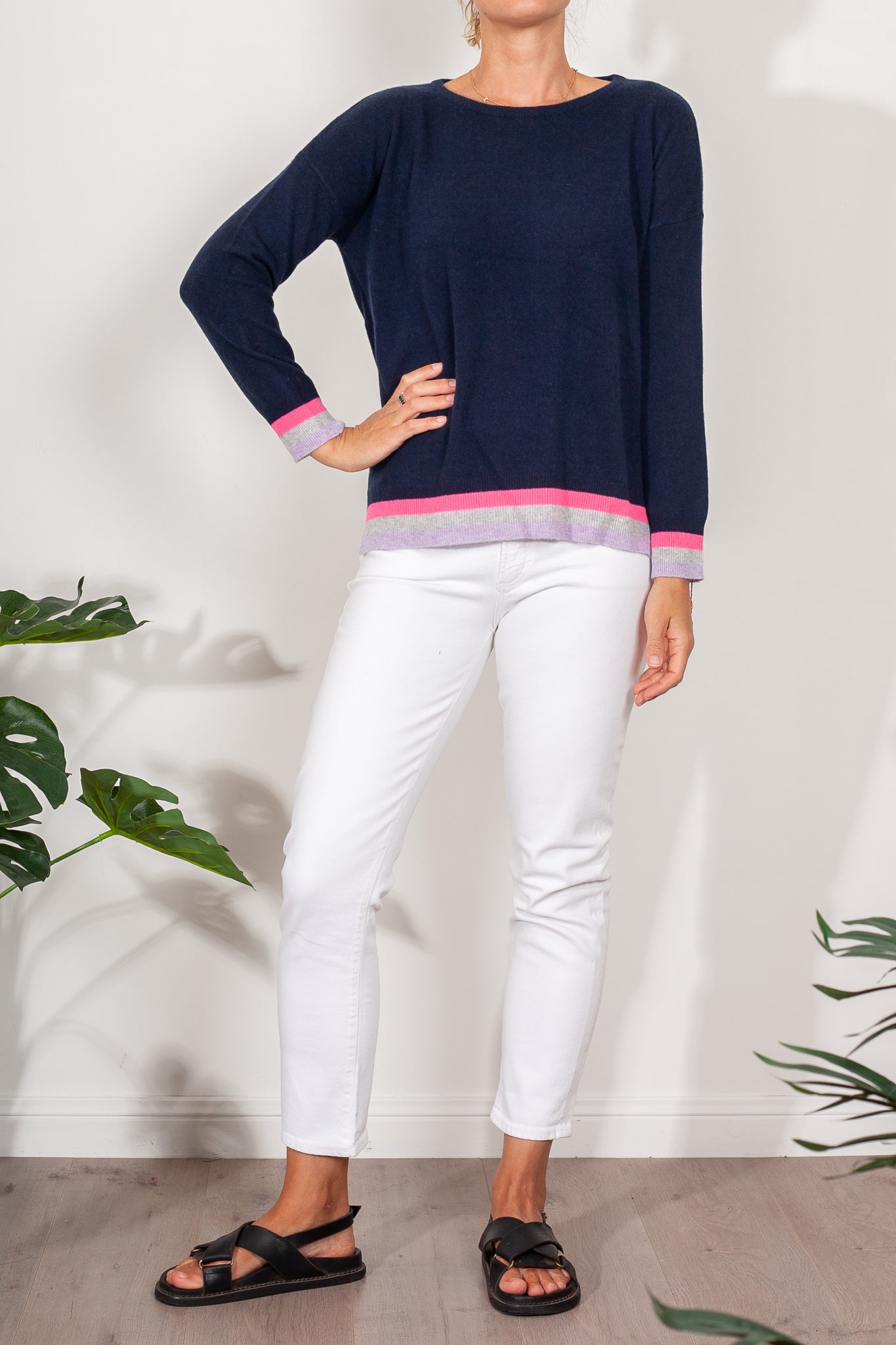 Take comfort to the next level in our 100% cashmere Sia Contrast Crew. Comfy enough for the couch and timeless enough for everyday wear. This garment is characterised by striped hem and cuff tips.