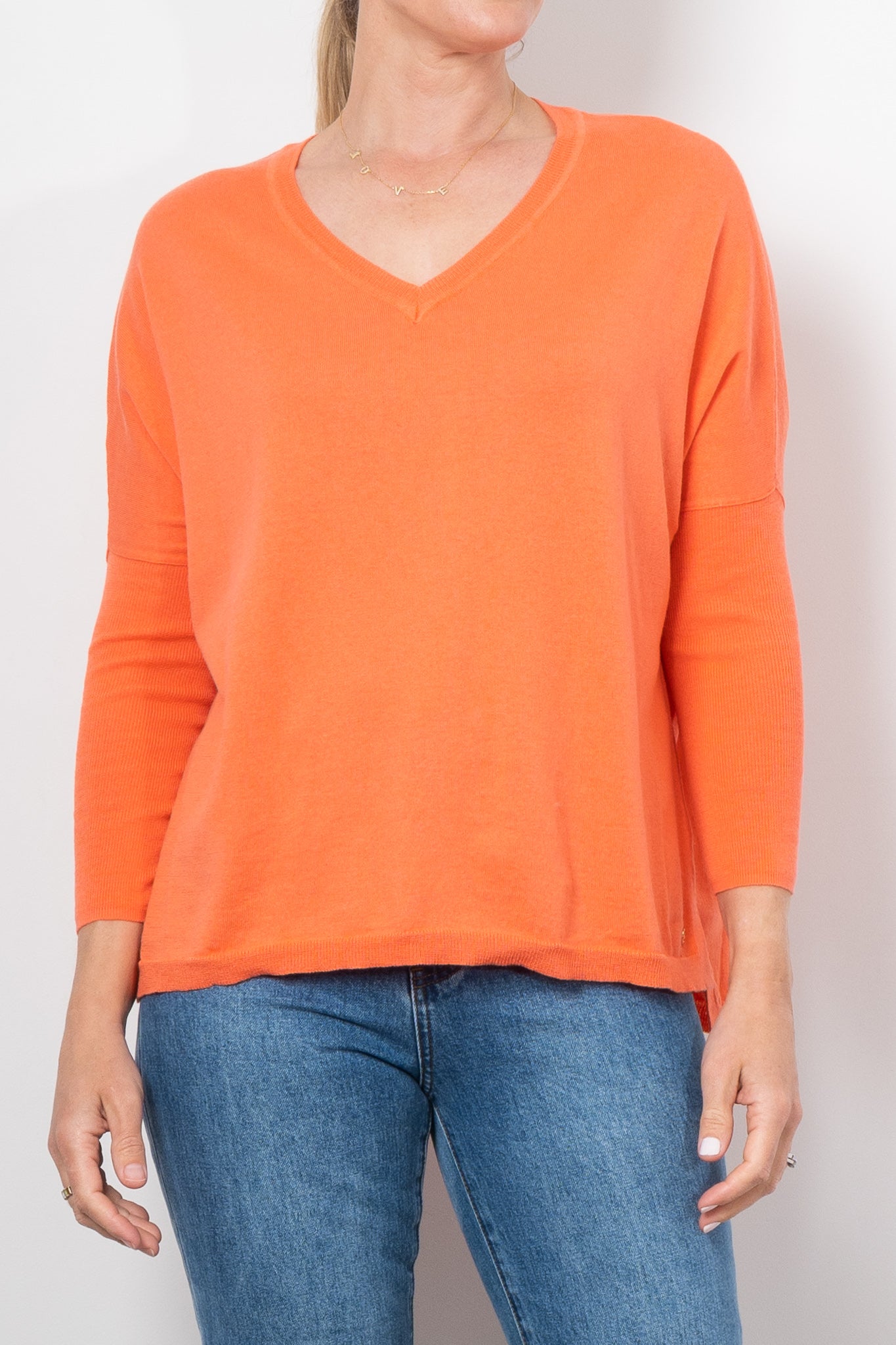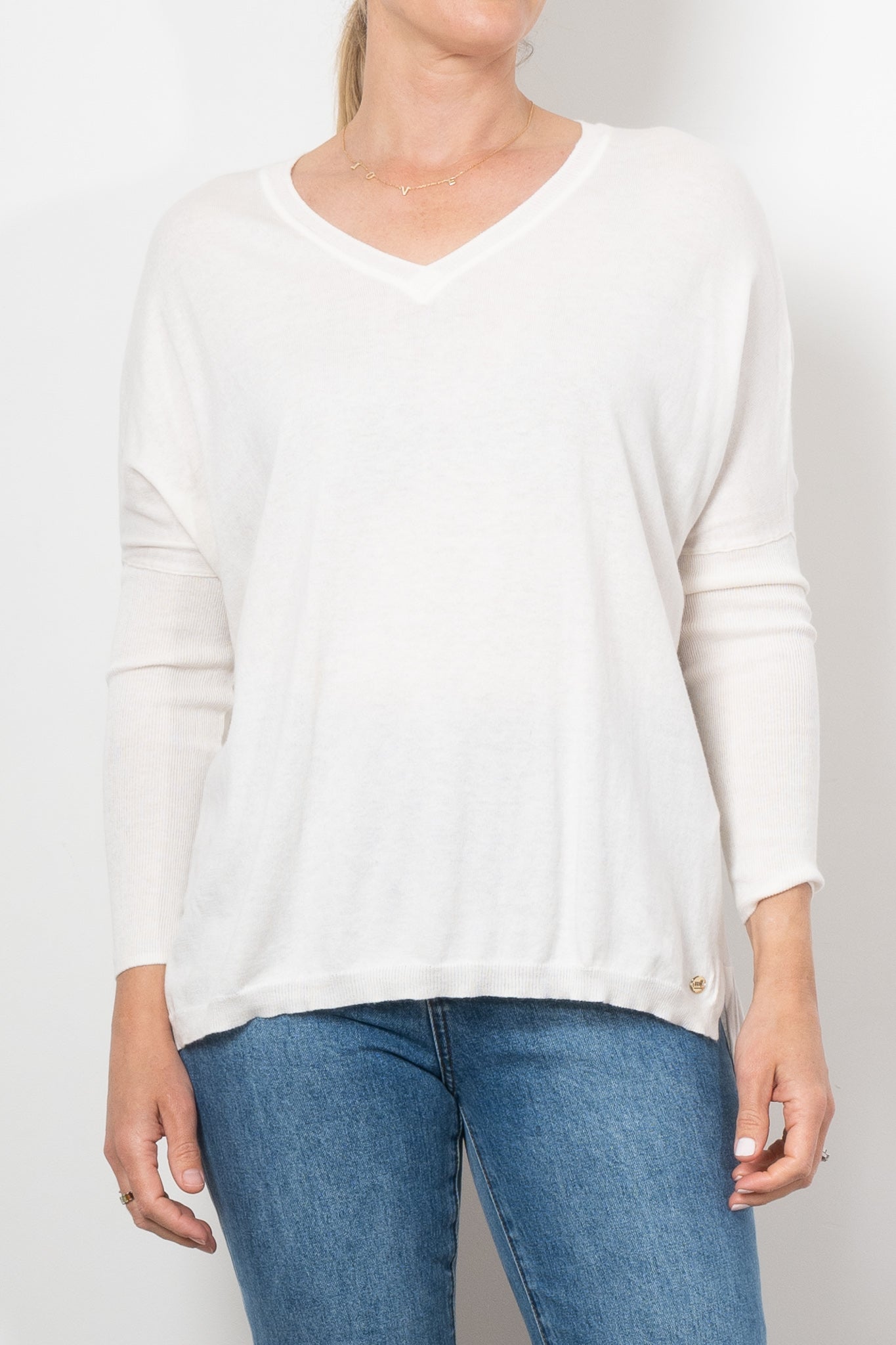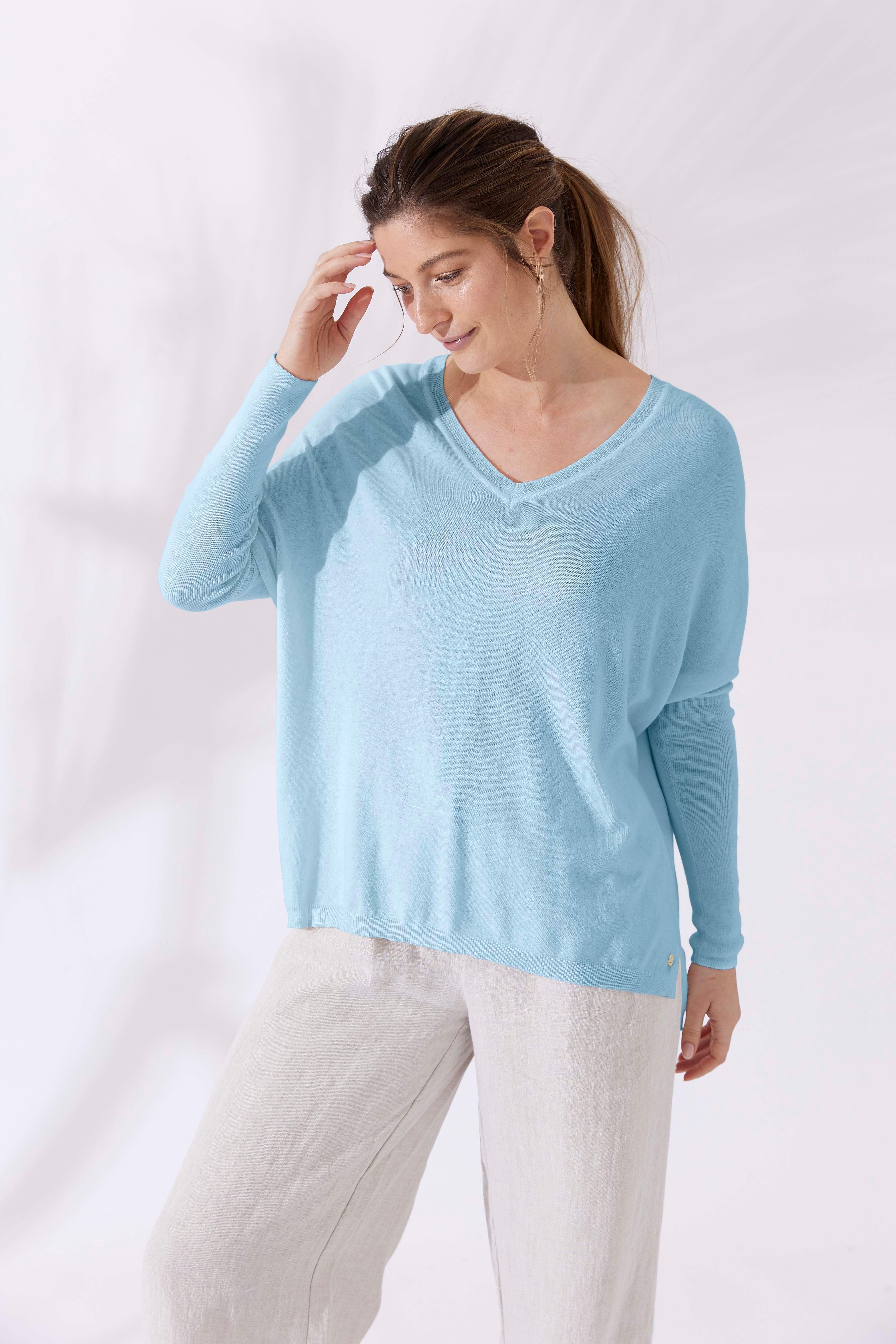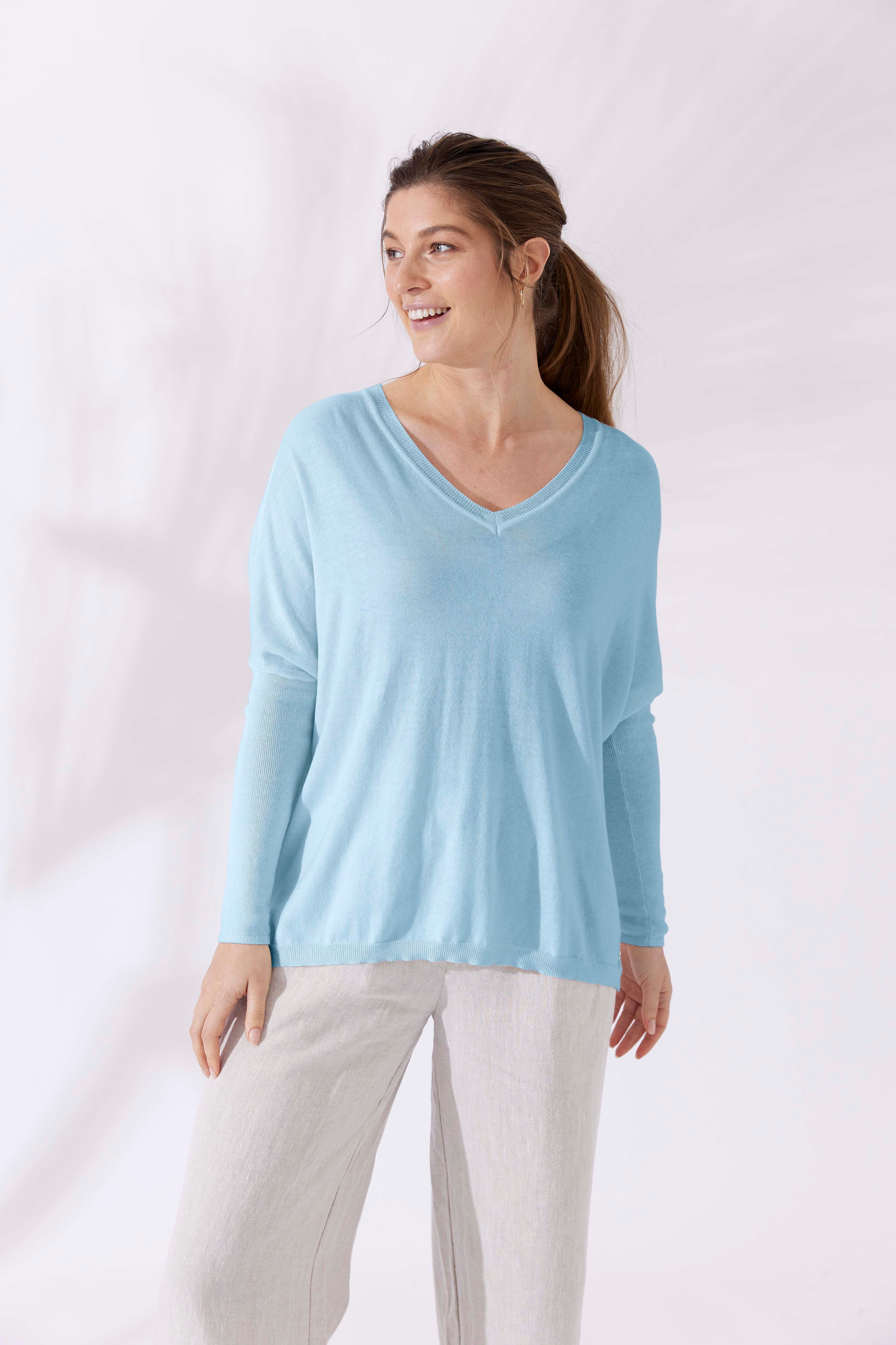 If you love Mia Fratino's classic Boyfriend V-Neck sweater, you'll love the Corfu lightweight vee. Featuring a side split hem, ribbed arm detailing and flattering v-neckline.