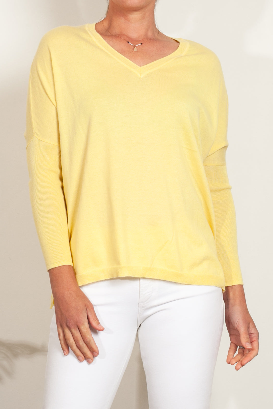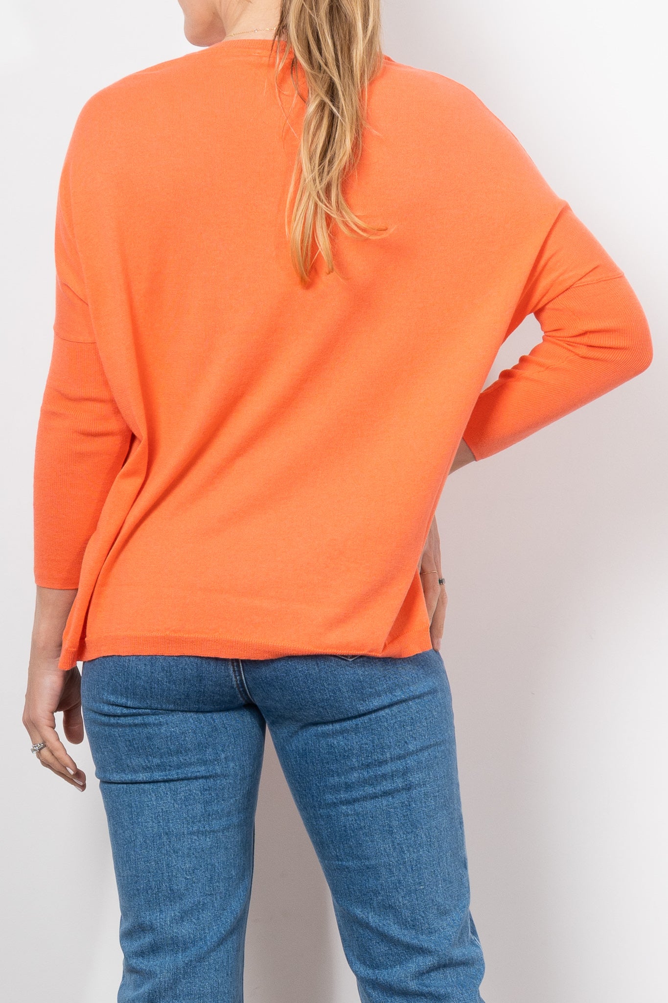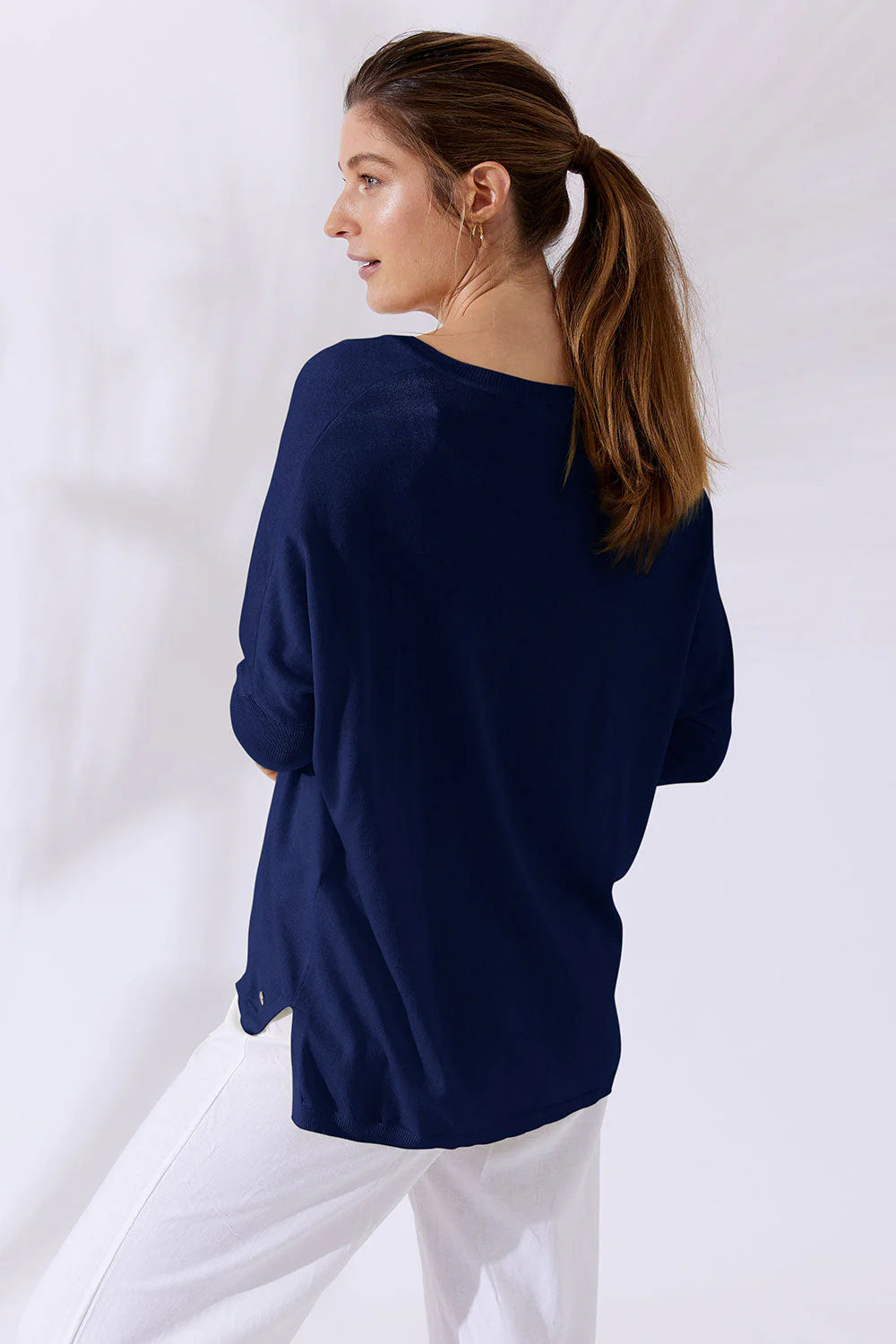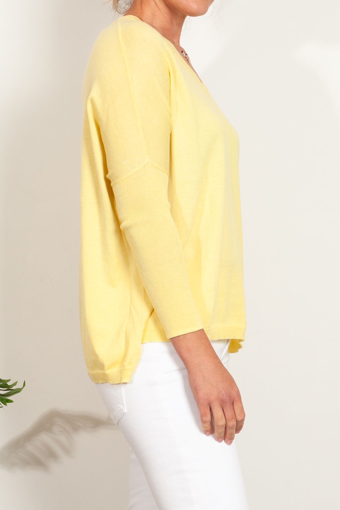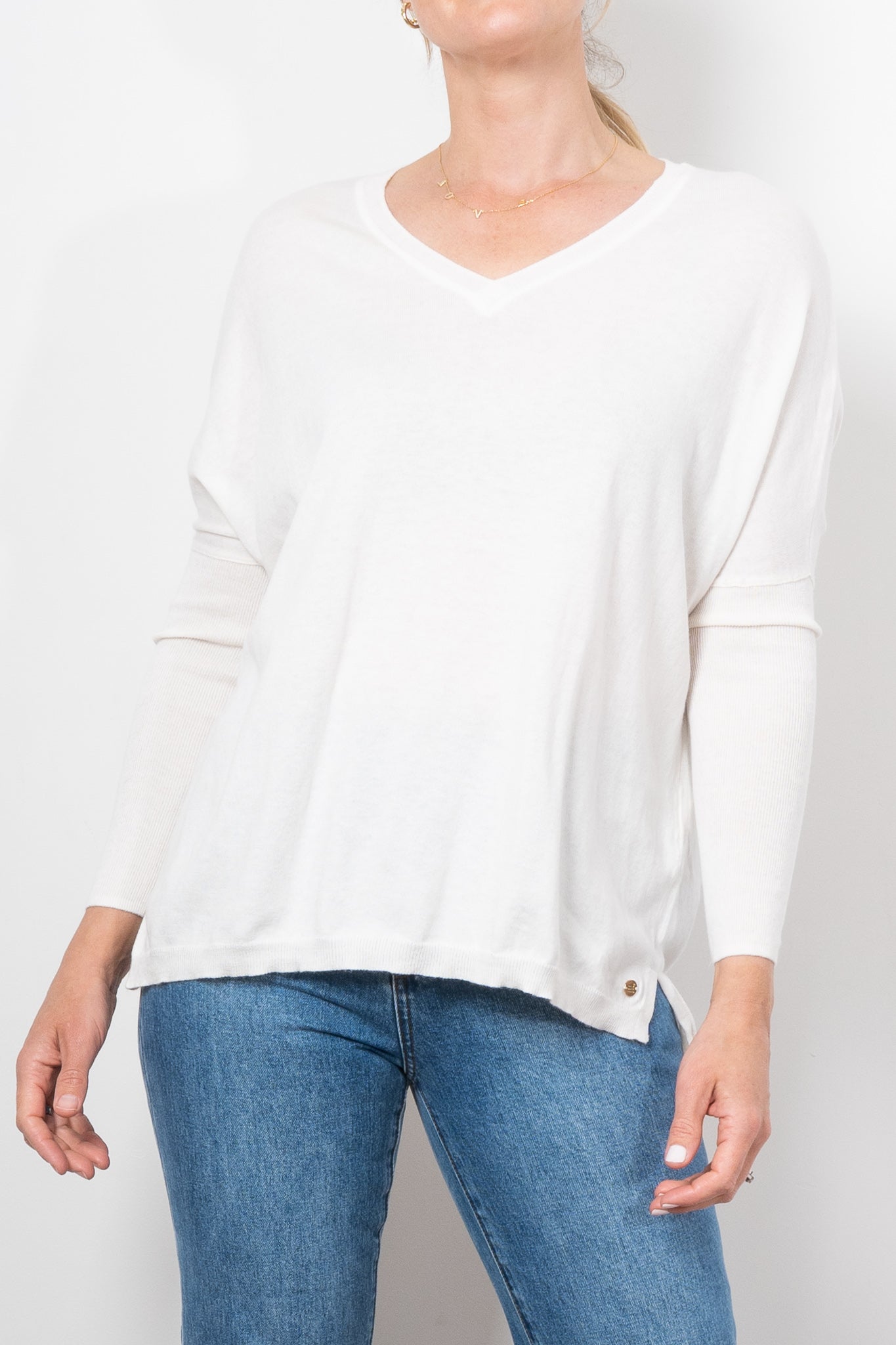 If you love Mia Fratino's classic Boyfriend V-Neck sweater, you'll love the Corfu lightweight vee. Featuring a side split hem, ribbed arm detailing and flattering v-neckline.
