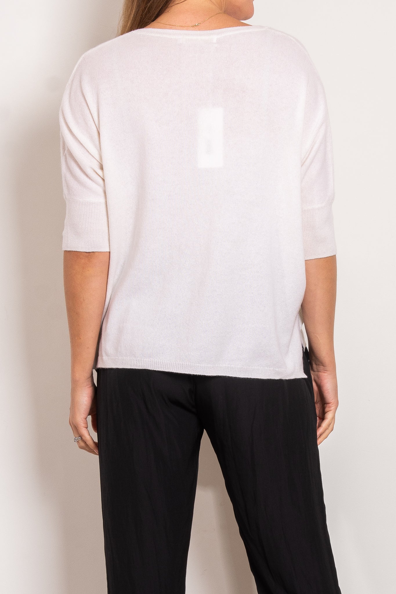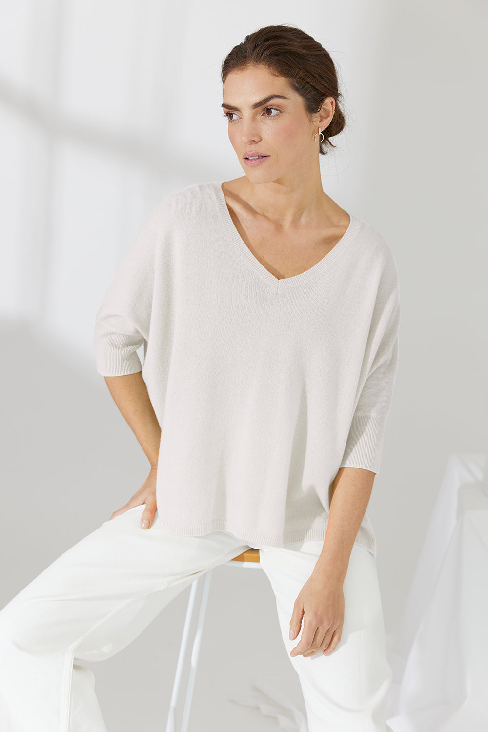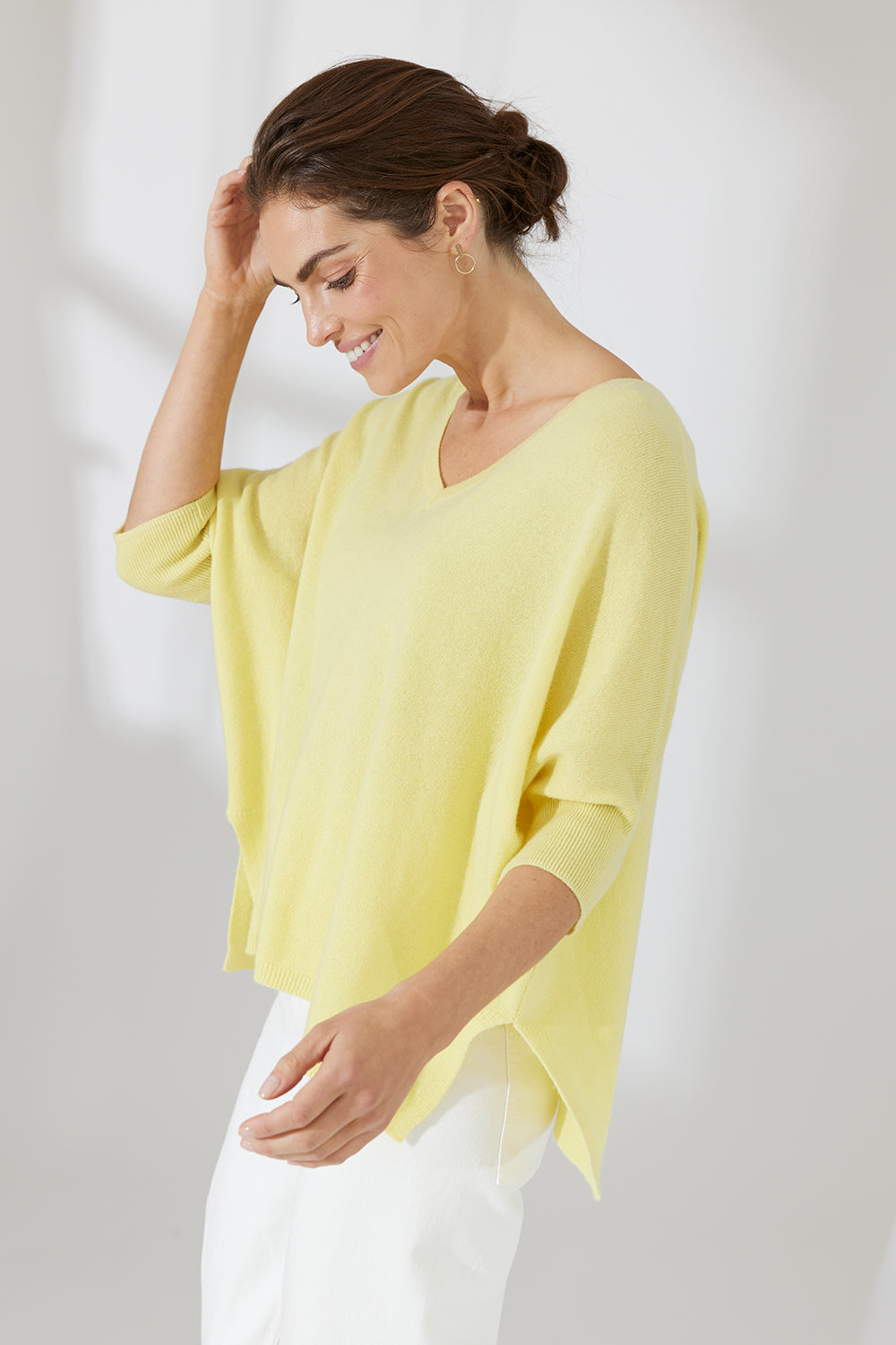 The lightweight and luxurious Hattie Wide Tee is our new everyday essential. This relaxed V-neck knit is spun from 100% cashmere and features a contemporary split hem with rib detailing. The 3/4 slim fit sleeves ensure a balanced silhouette that is both comfortable and flattering.