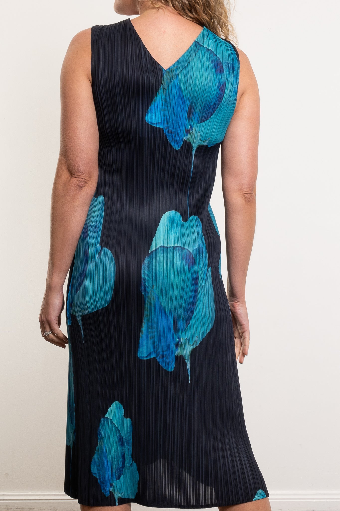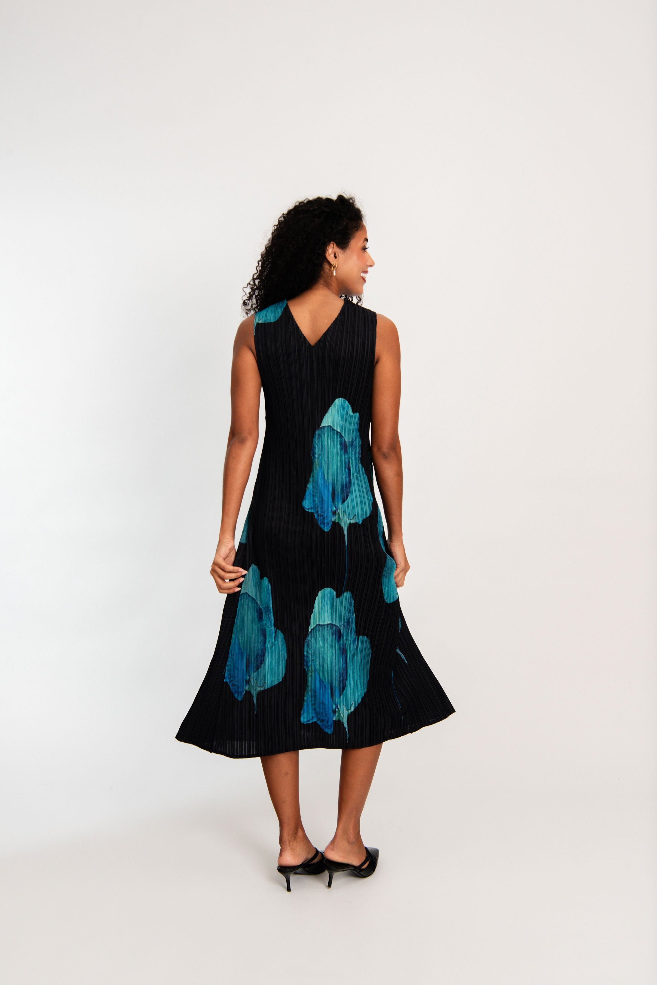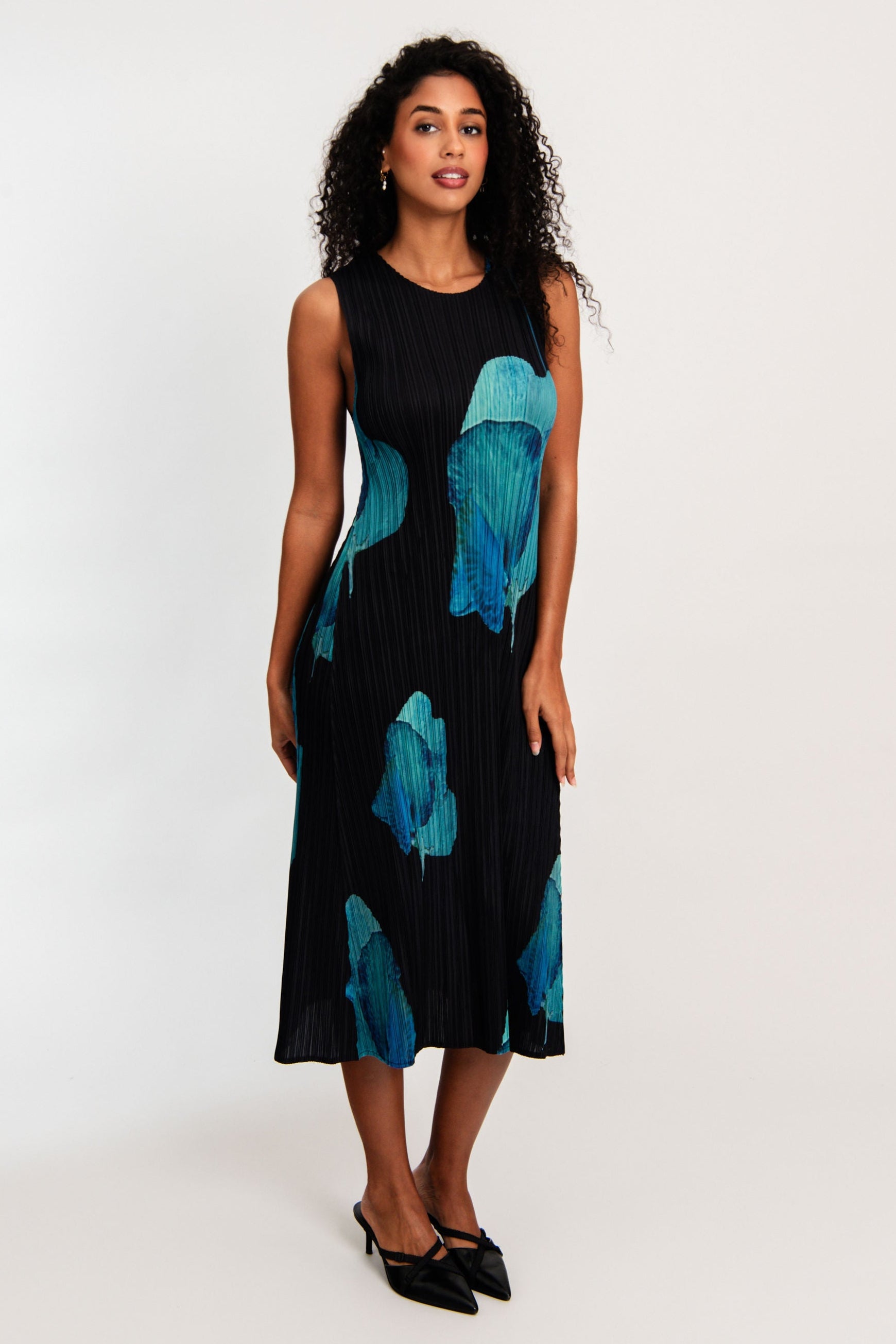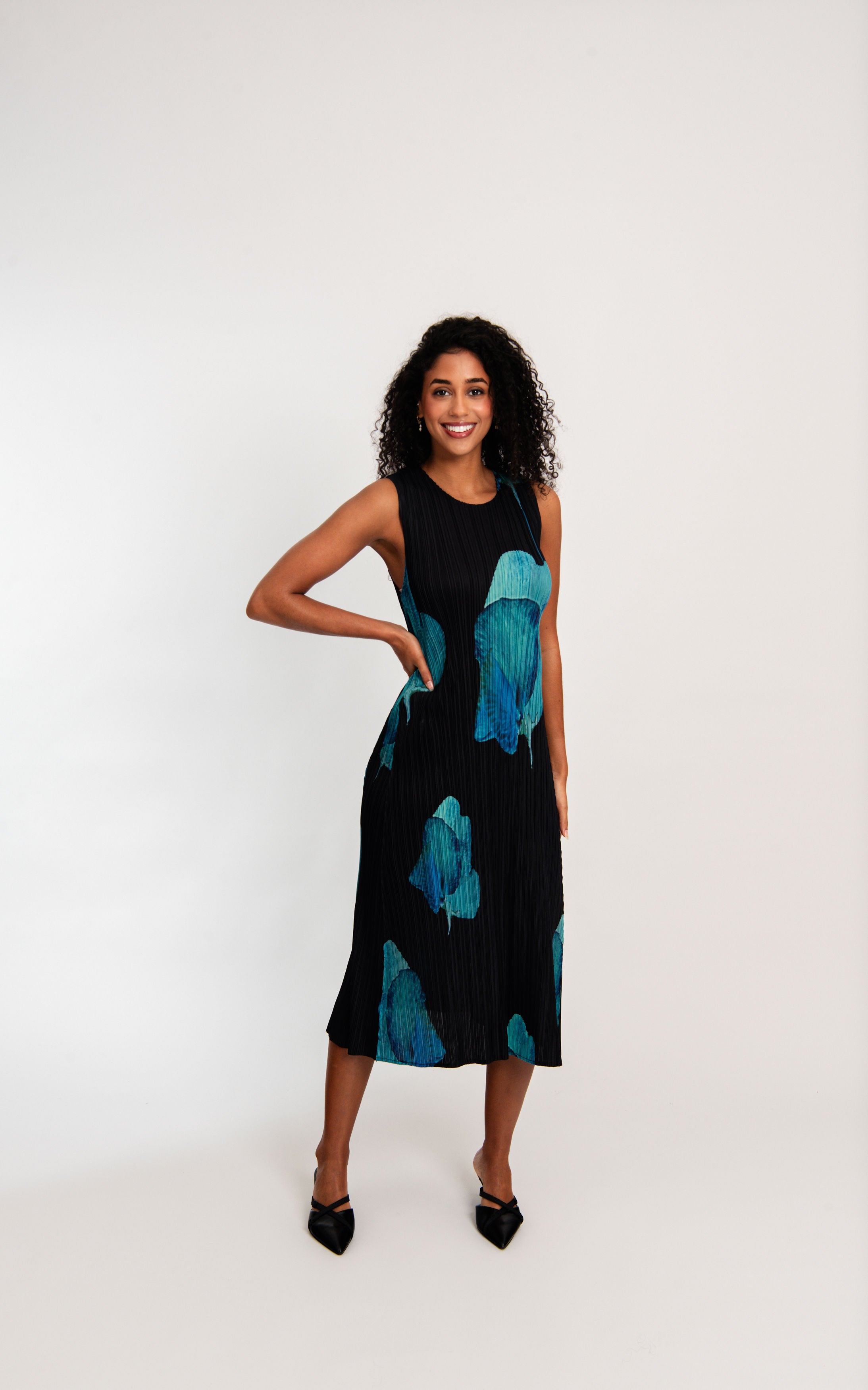 A canvas of movement and print, the Dolce Dress is a striking expression of form and flow. Handcrafted from 100% High Temp using Alquema’s signature pleating technique, this sleeveless silhouette features vertical fine pleats that elongate the figure and bring texture to every fold. The midi-length design is adorned with a bold, large-scale print, creating a visual rhythm that shifts with every step. The Dolce Dress is both artful and effortless.