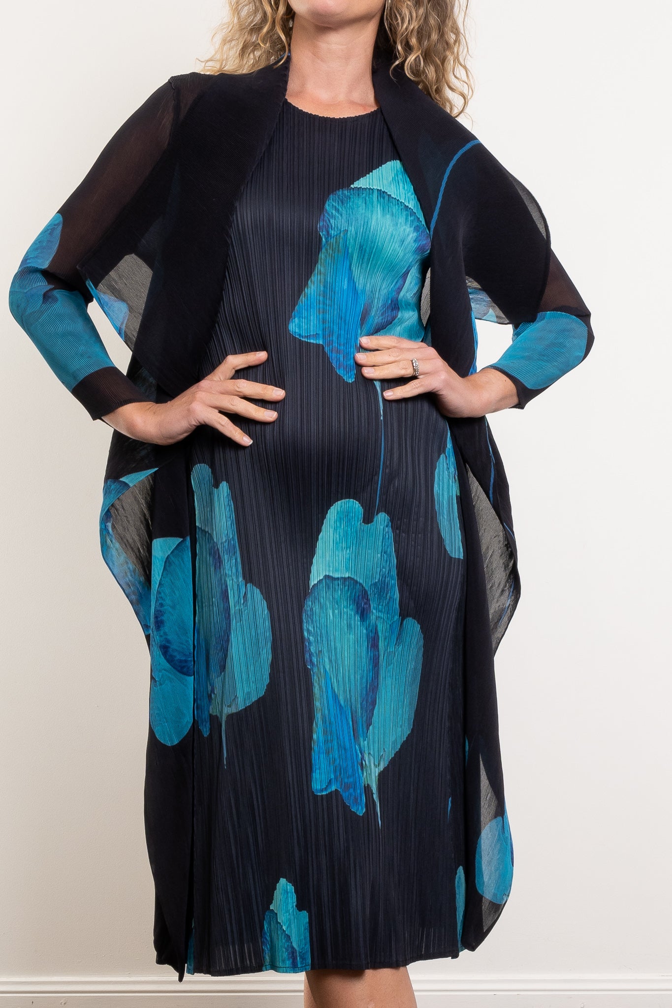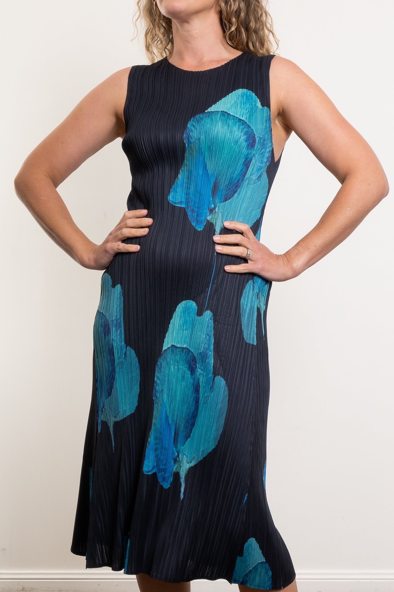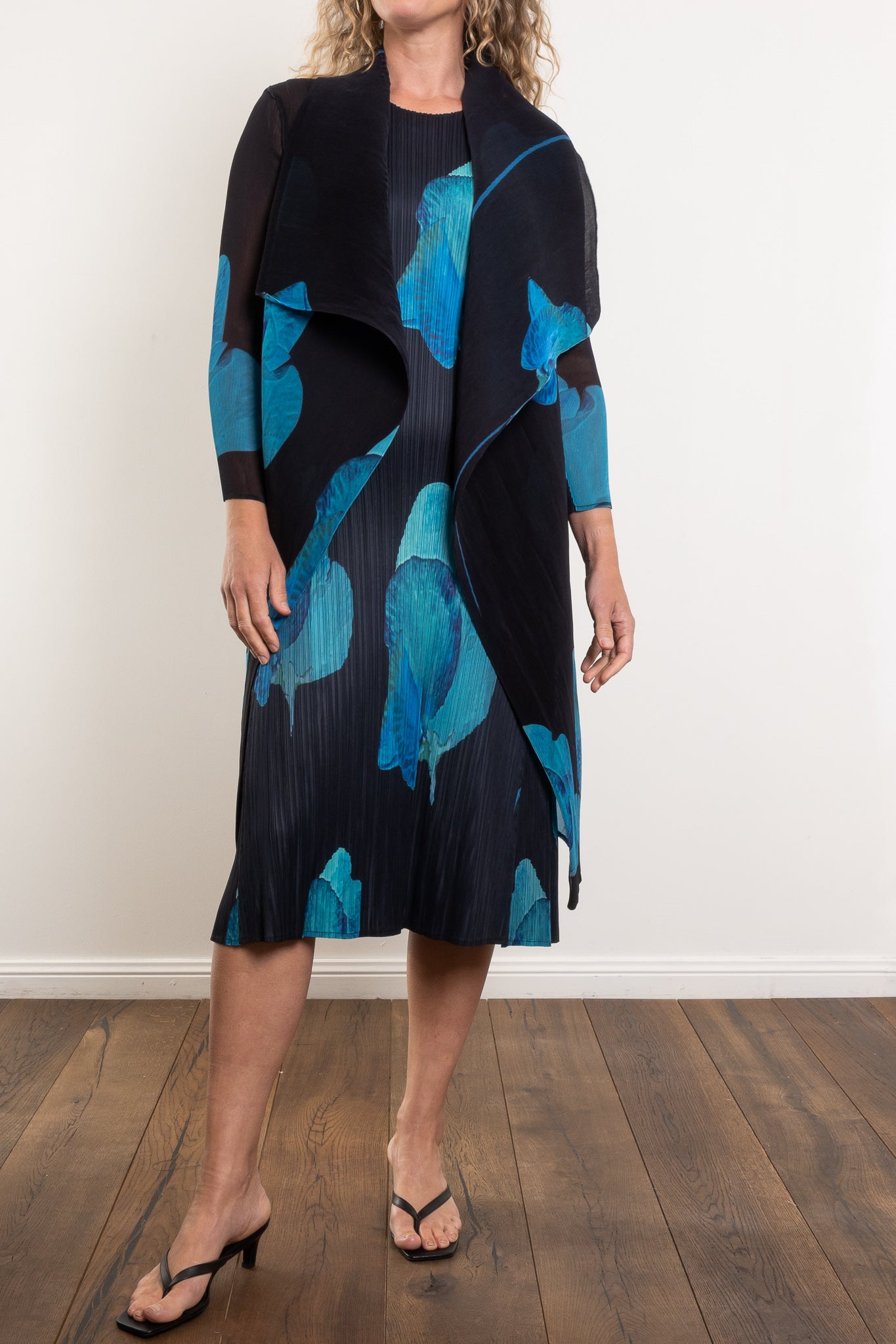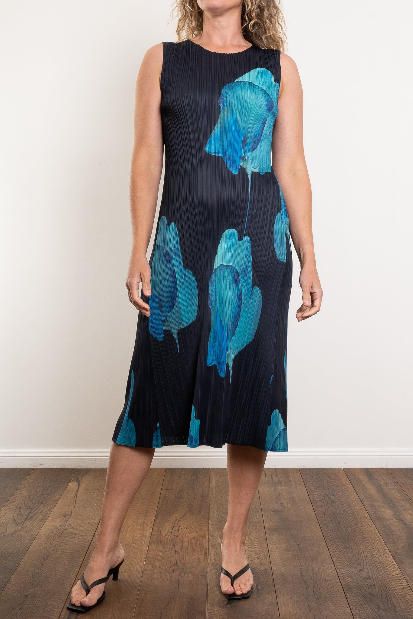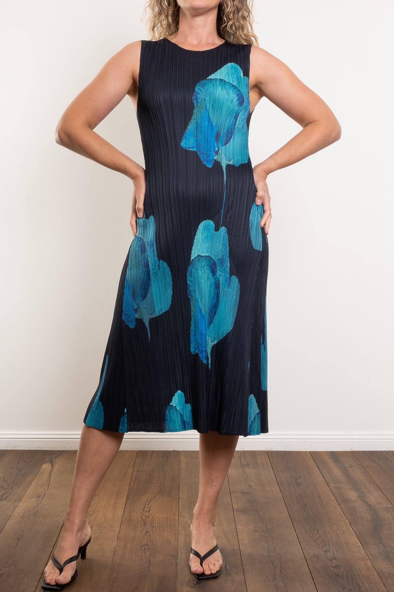 A canvas of movement and print, the Dolce Dress is a striking expression of form and flow. Handcrafted from 100% High Temp using Alquema’s signature pleating technique, this sleeveless silhouette features vertical fine pleats that elongate the figure and bring texture to every fold. The midi-length design is adorned with a bold, large-scale print, creating a visual rhythm that shifts with every step. The Dolce Dress is both artful and effortless.