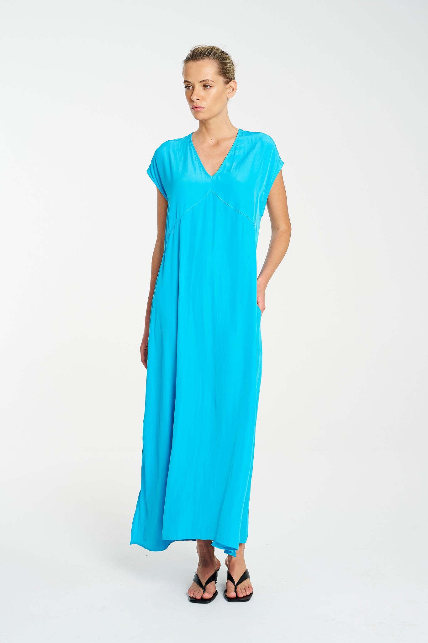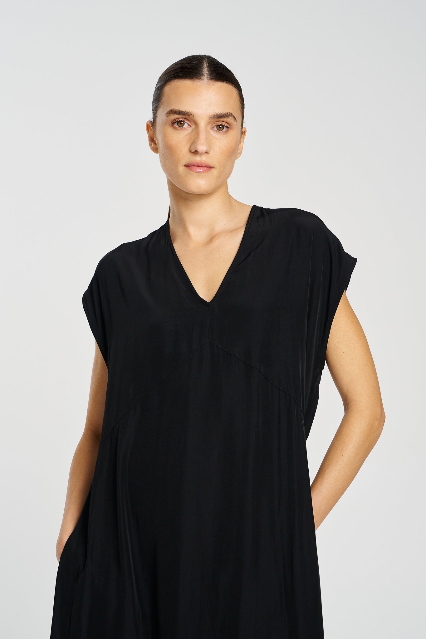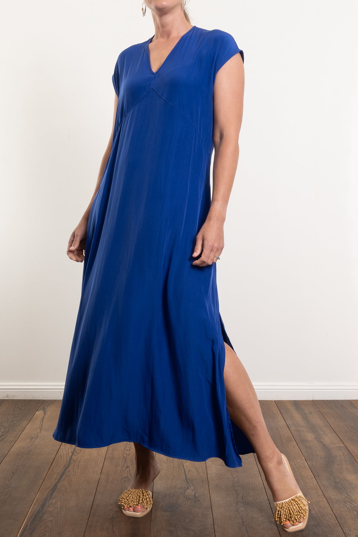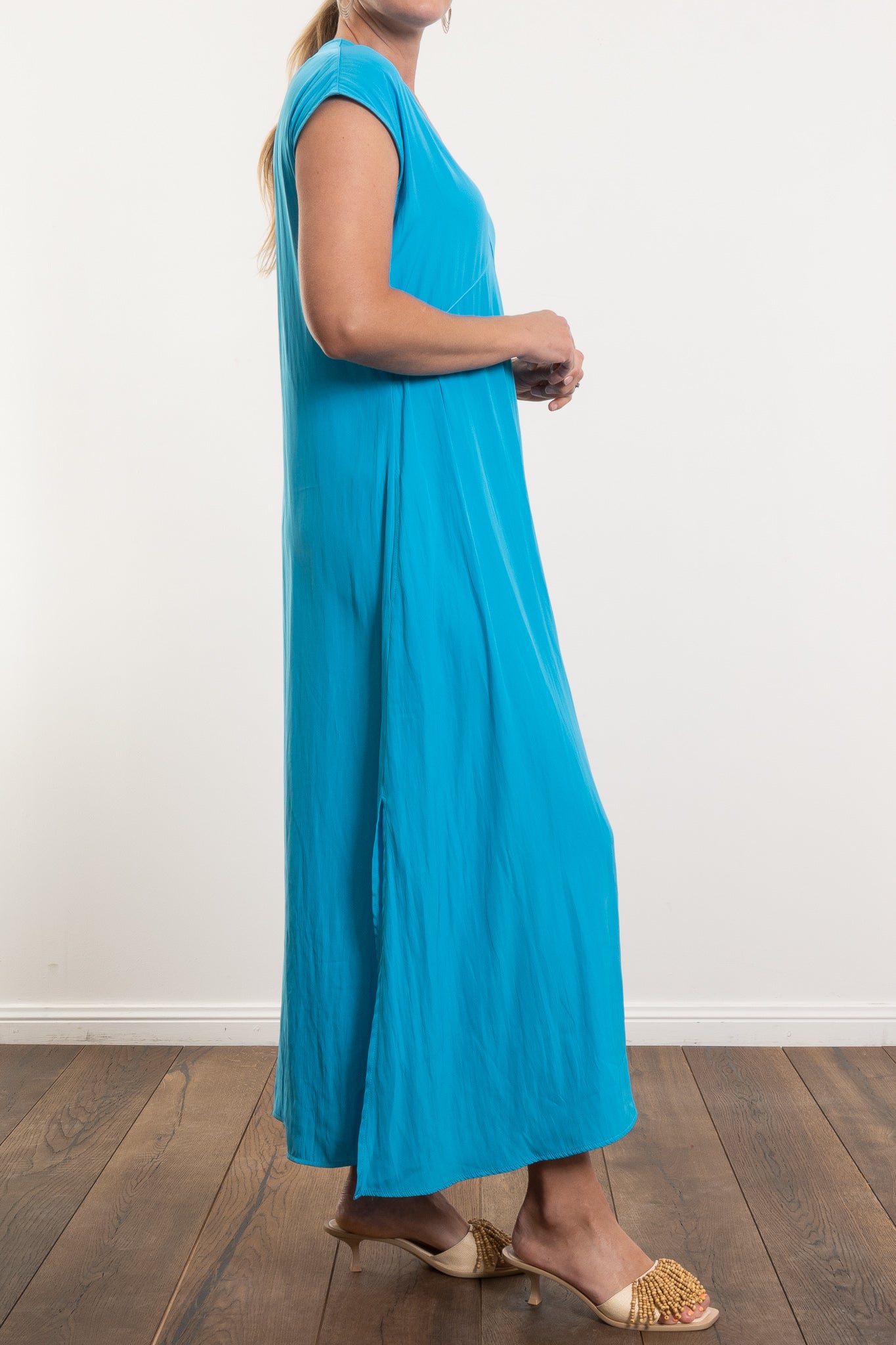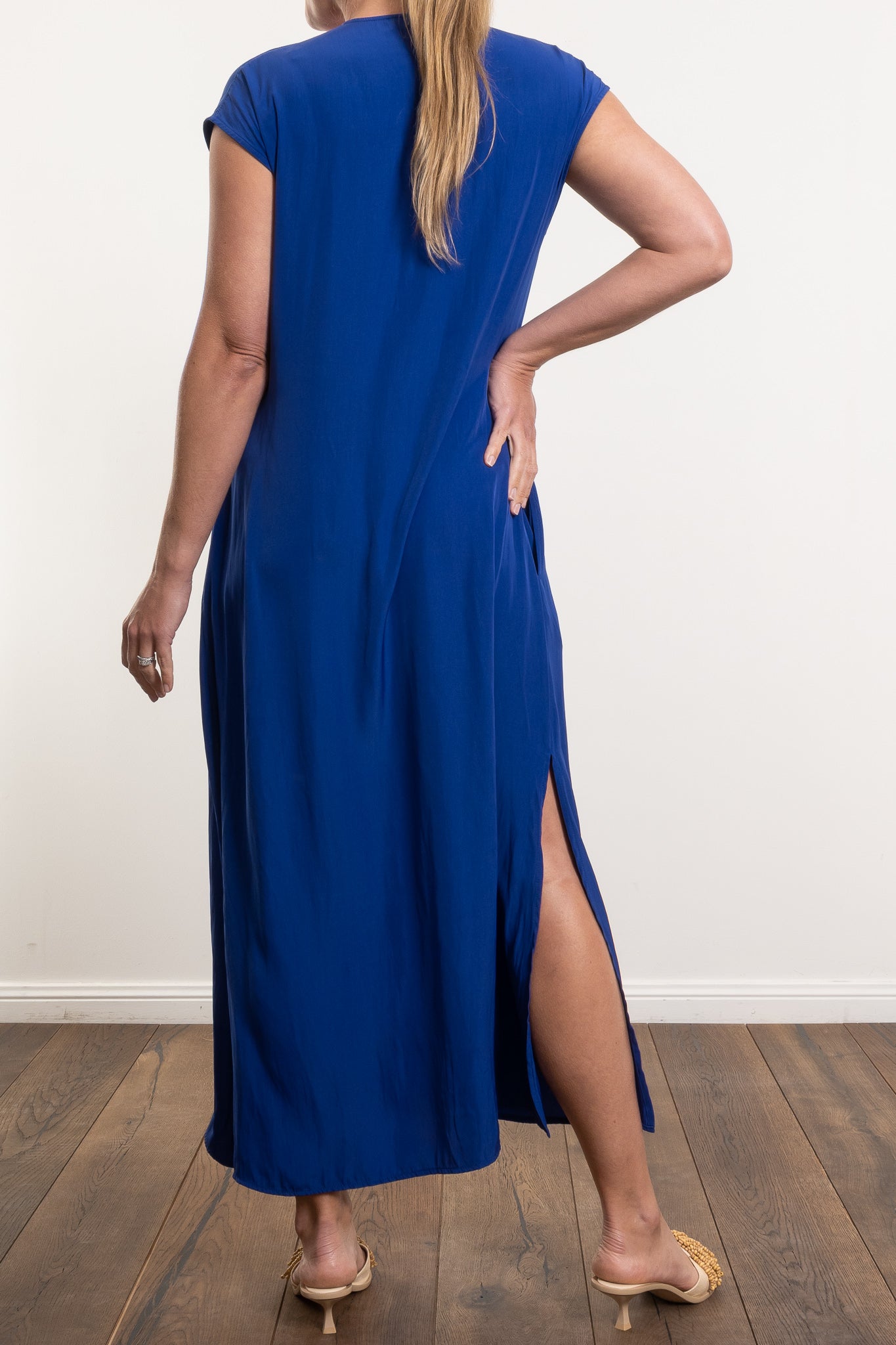 Cut in fluid Mache, the Maxi Slice Dress delivers ease, elegance and wear-anywhere versatility—perfect for travel, events, or everyday dressing.