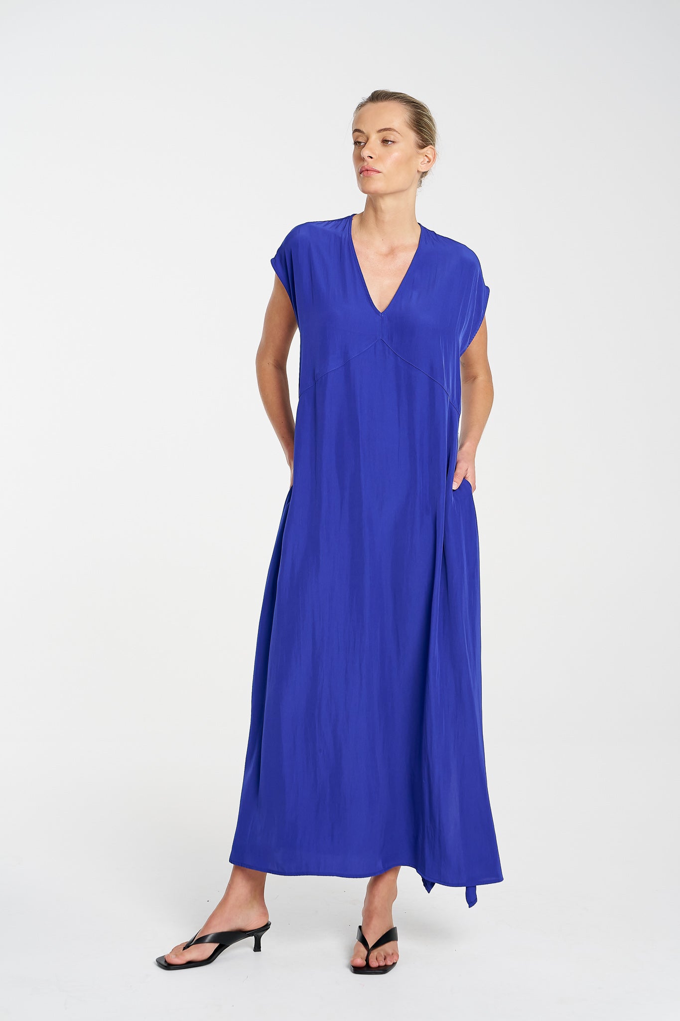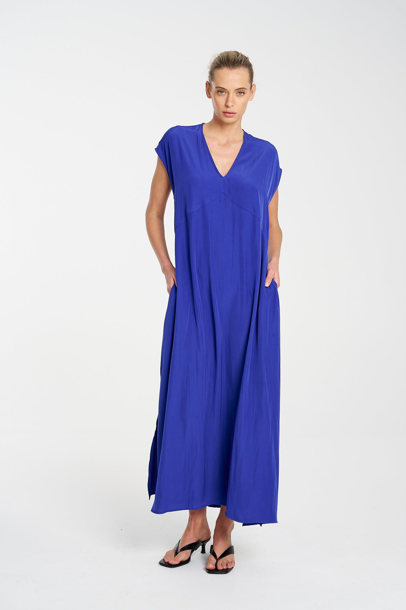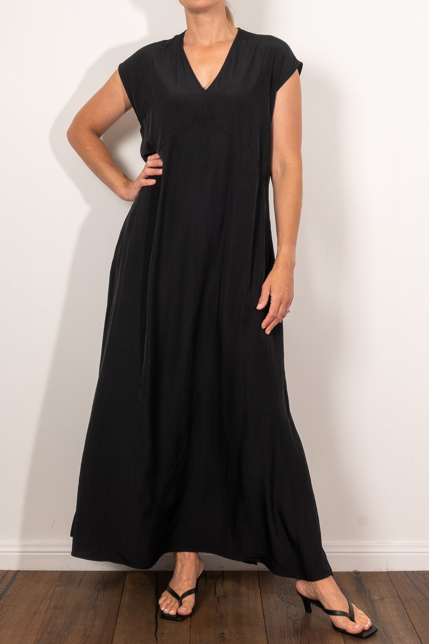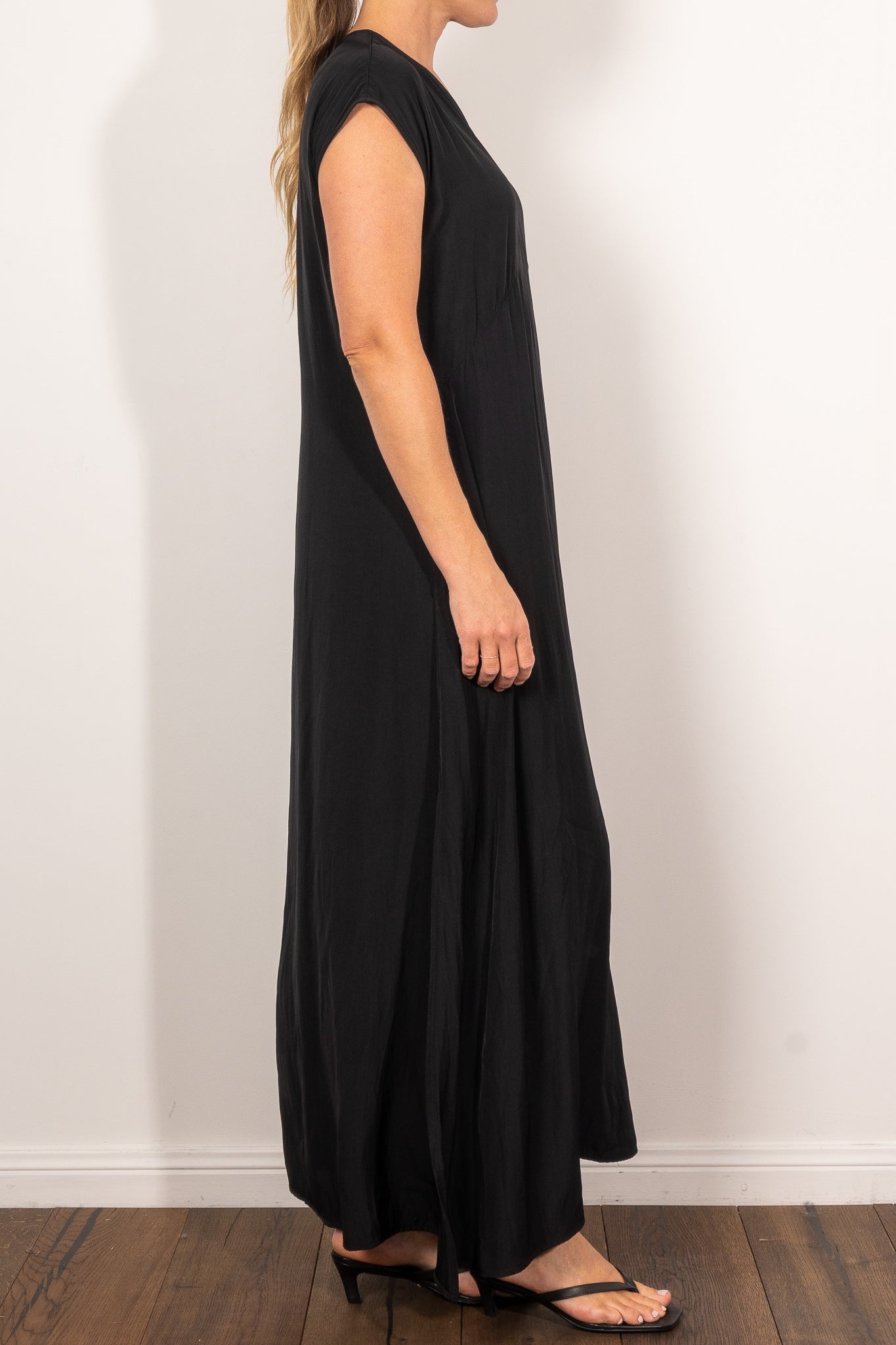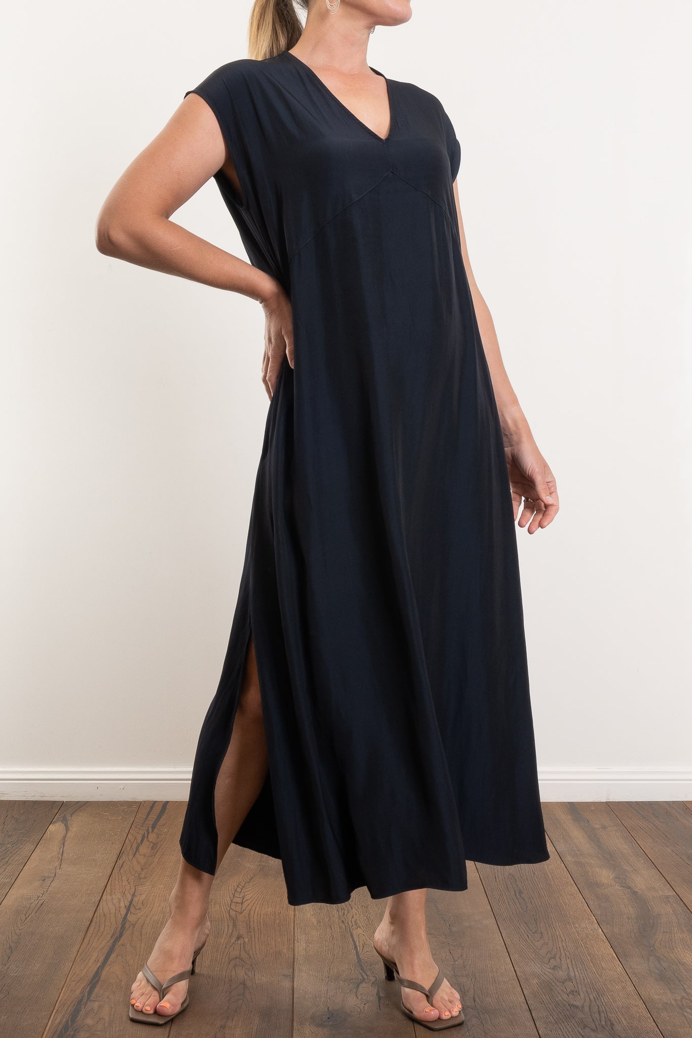 The Maxi Slice Dress by Mela Purdie is the kind of wardrobe hero that makes getting dressed feel effortless. Crafted from the brand’s signature Mache—a softly structured, lightweight Japanese fabric with a gentle sheen—this full-length style features a clean V-neckline, relaxed silhouette and knee-high side splits for ease of movement. Side pockets add a practical touch, while the sleeveless design offers generous shoulder coverage. Whether styled with sandals for day or heels for evening, this is a timeless dress with endless versatility.