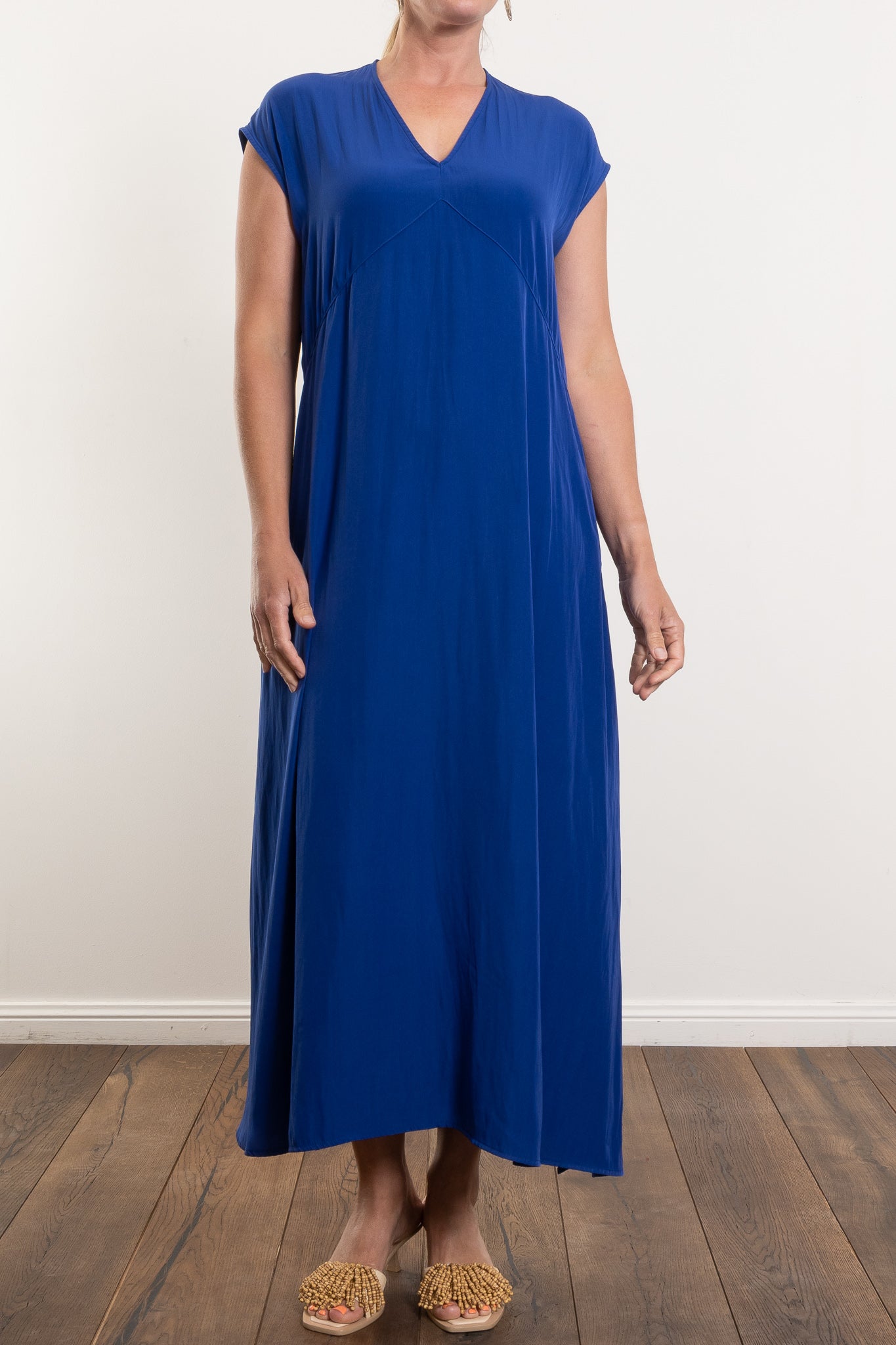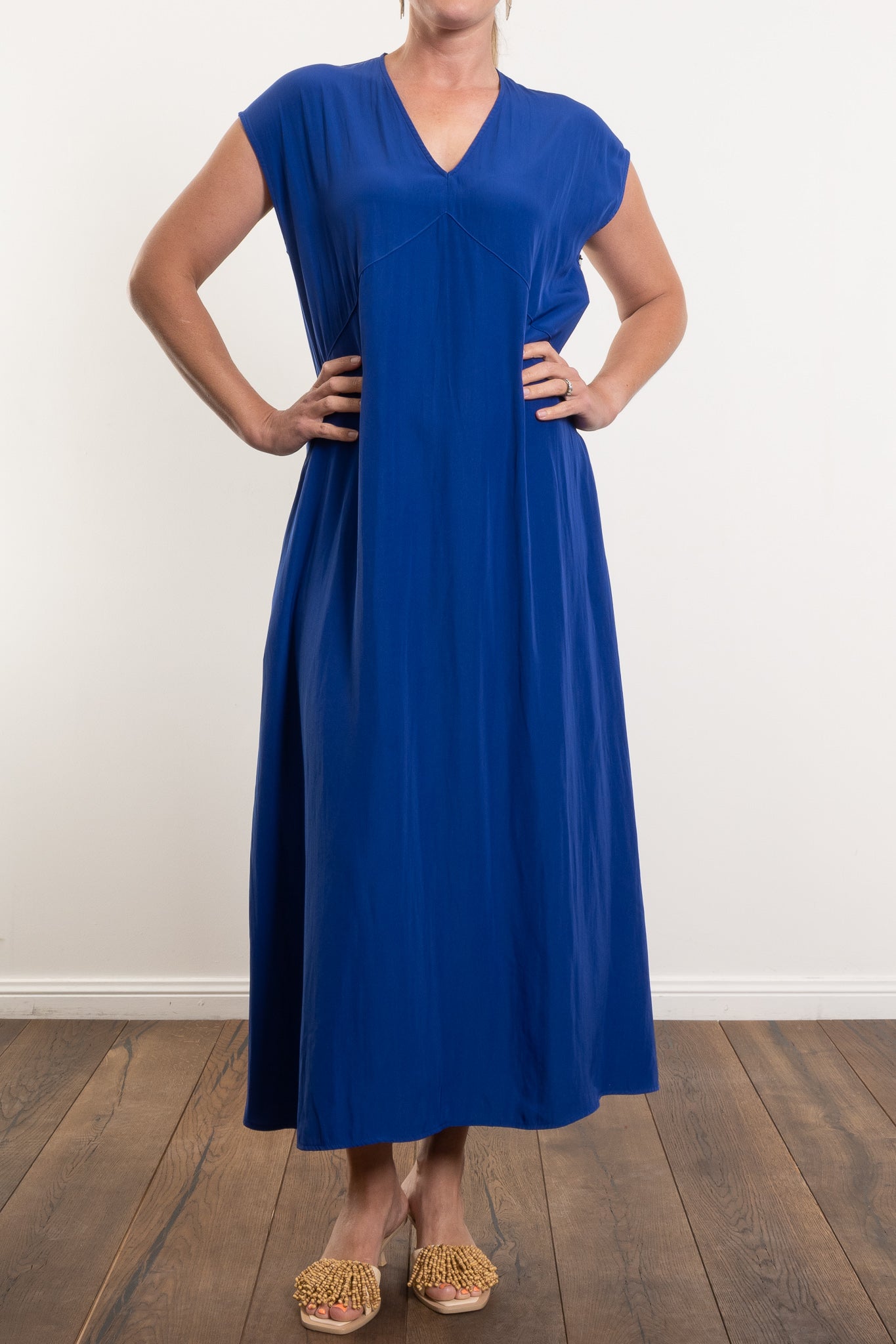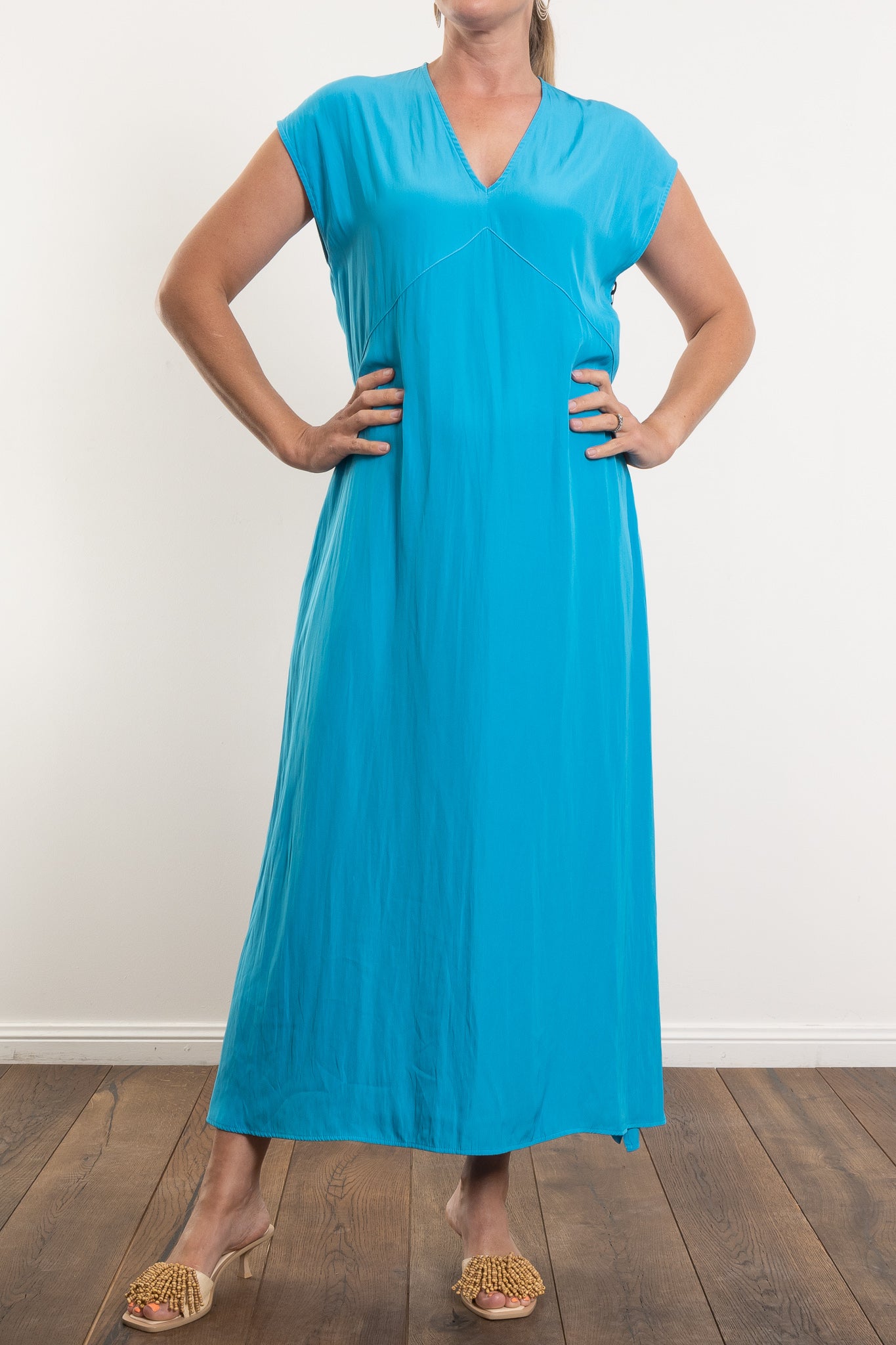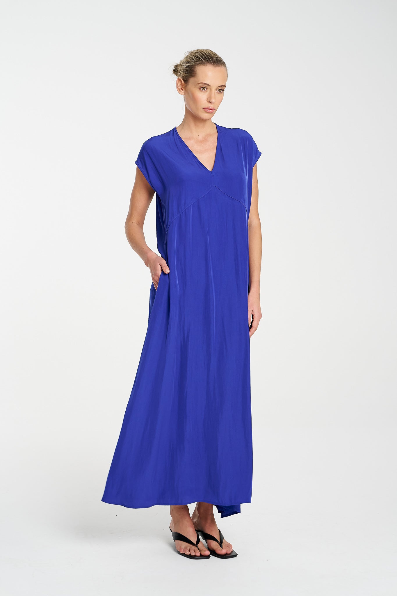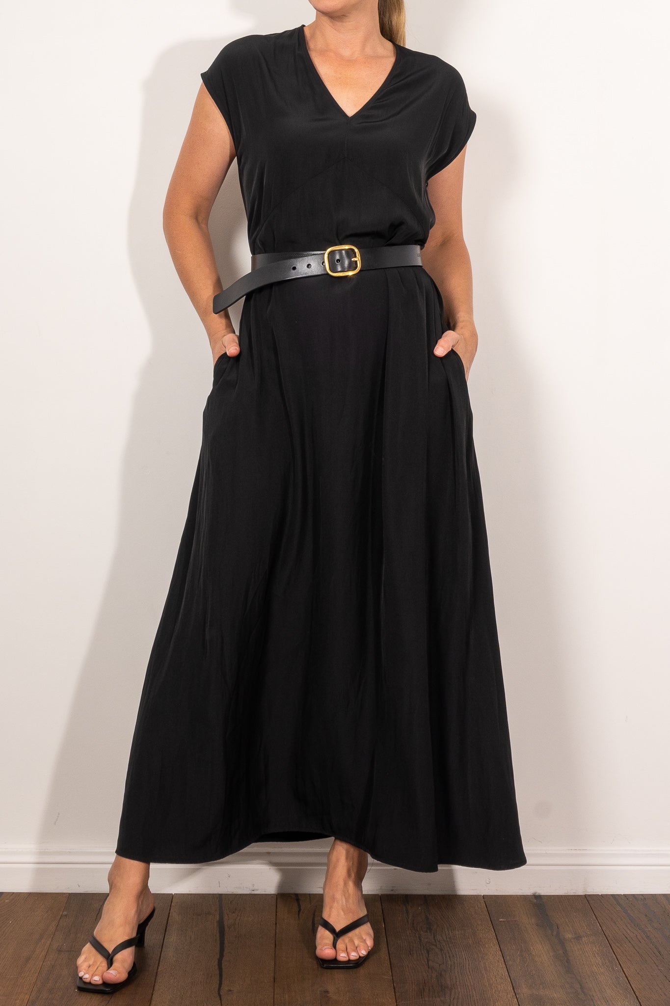 The Maxi Slice Dress by Mela Purdie is the kind of wardrobe hero that makes getting dressed feel effortless. Crafted from the brand’s signature Mache—a softly structured, lightweight Japanese fabric with a gentle sheen—this full-length style features a clean V-neckline, relaxed silhouette and knee-high side splits for ease of movement. Side pockets add a practical touch, while the sleeveless design offers generous shoulder coverage. Whether styled with sandals for day or heels for evening, this is a timeless dress with endless versatility.