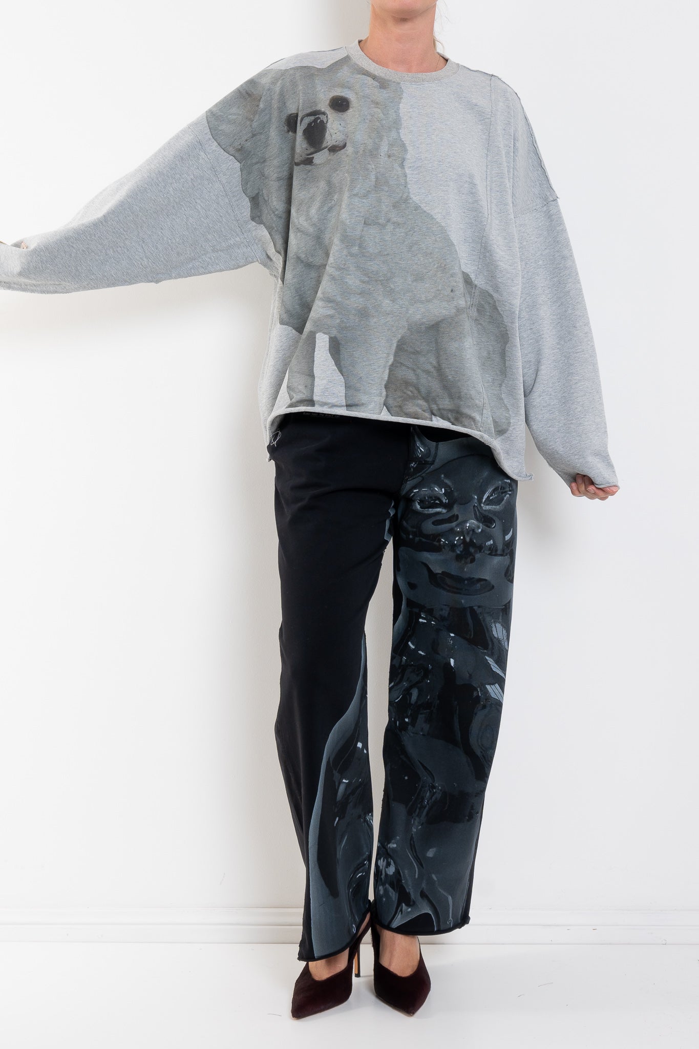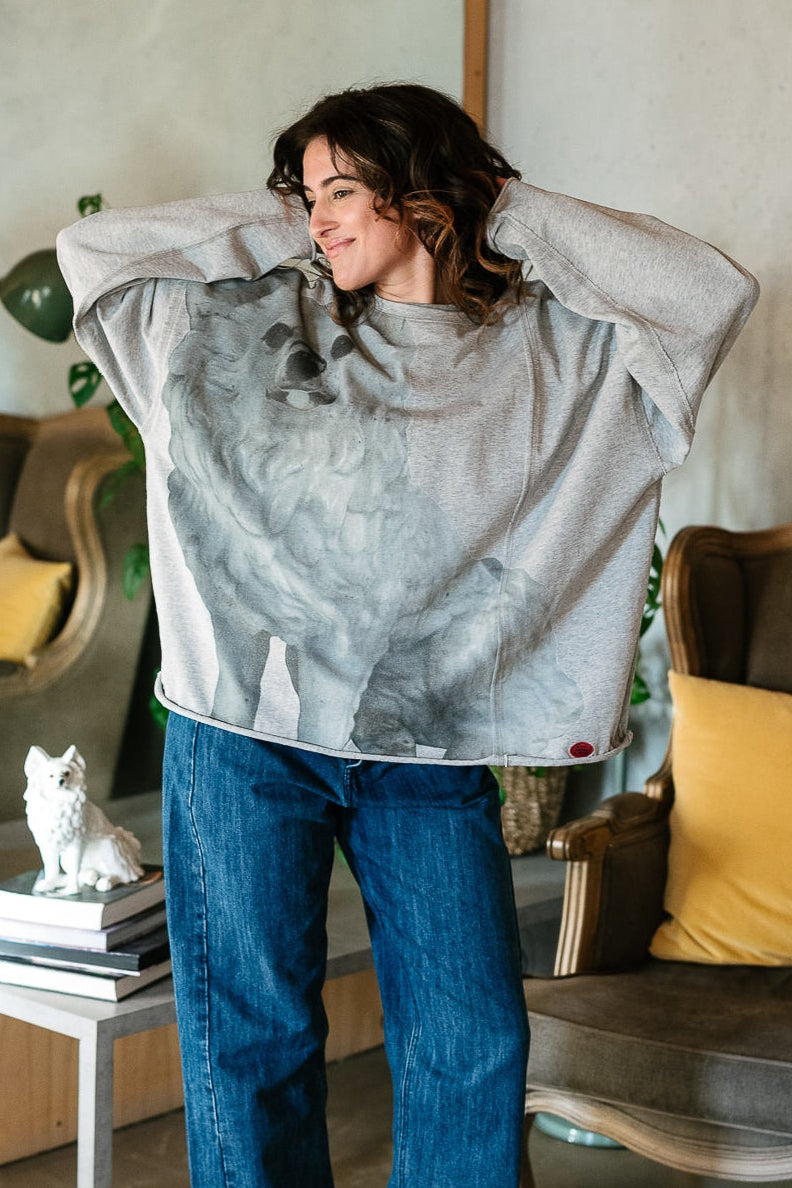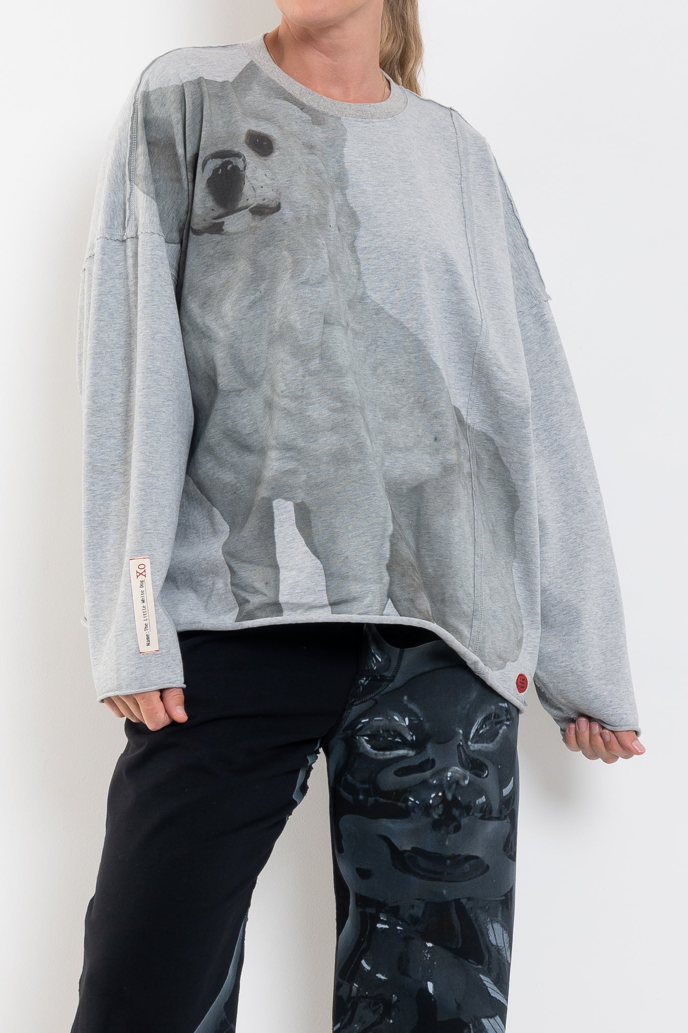 Cut in an easy, oversized silhouette, this relaxed jumper features the Little White Dog artwork washed across the front for a subtle, artful statement. The soft grey marle base keeps things understated, while the print brings personality and warmth — the kind of piece that feels effortlessly thrown on but never ordinary. Comfortable, expressive and endlessly wearable, it’s an easy favourite for cooler days.