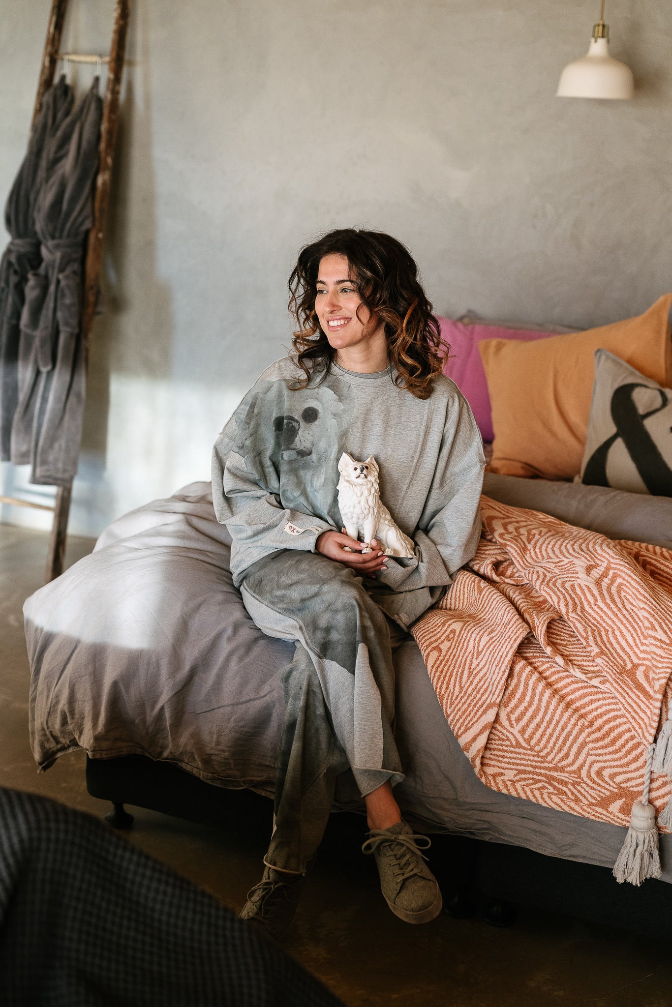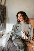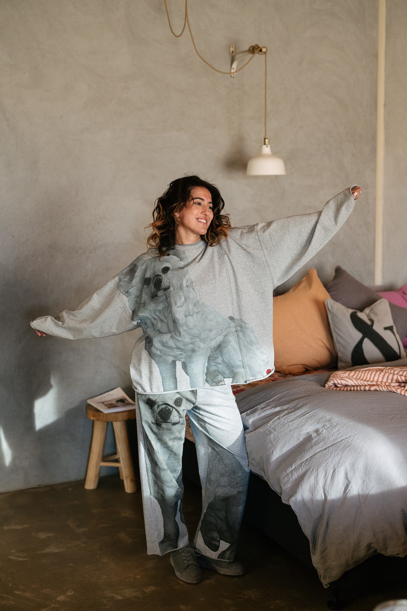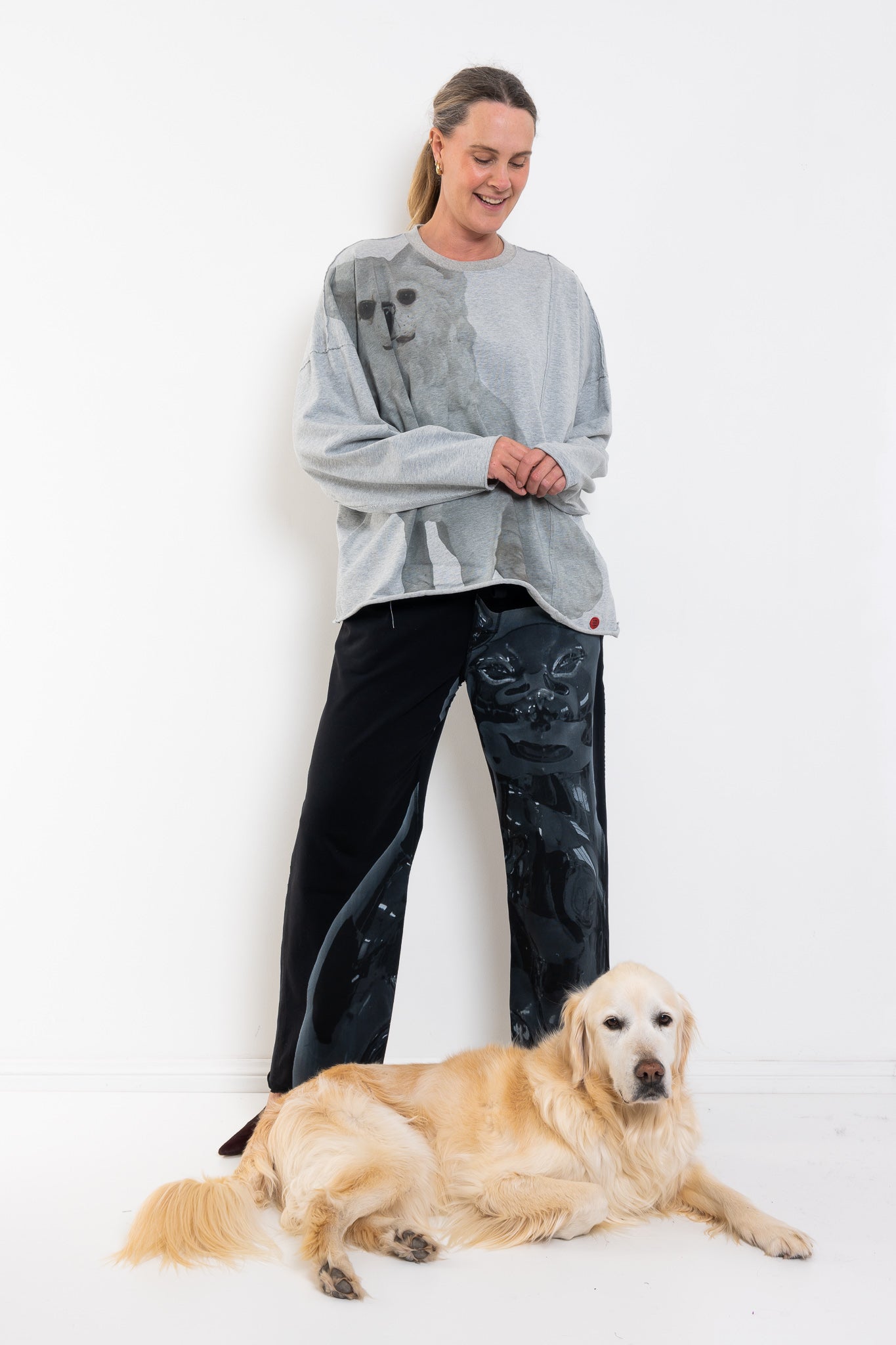 Cut in an easy, oversized silhouette, this relaxed jumper features the Little White Dog artwork washed across the front for a subtle, artful statement. The soft grey marle base keeps things understated, while the print brings personality and warmth — the kind of piece that feels effortlessly thrown on but never ordinary. Comfortable, expressive and endlessly wearable, it’s an easy favourite for cooler days.