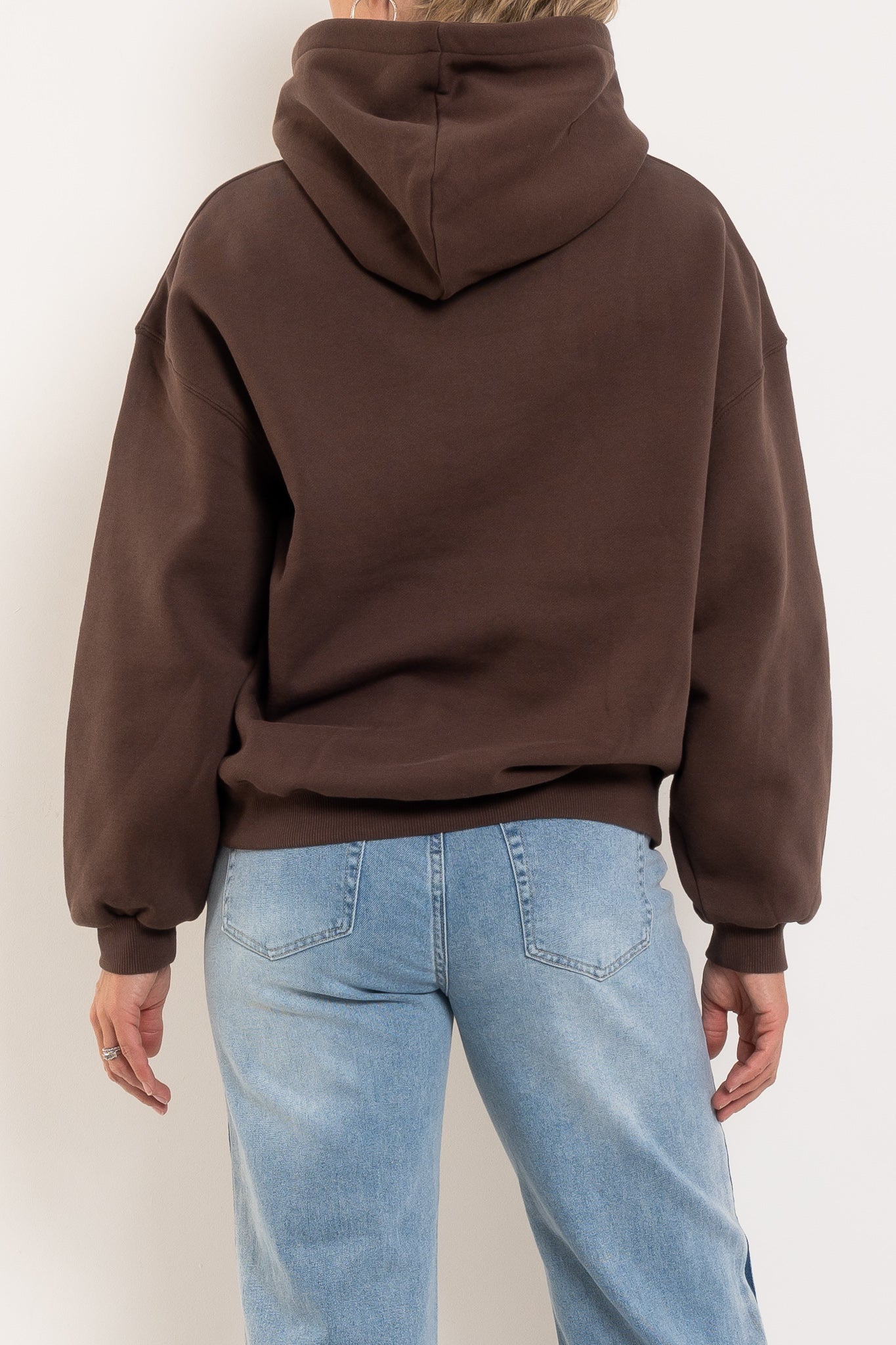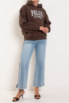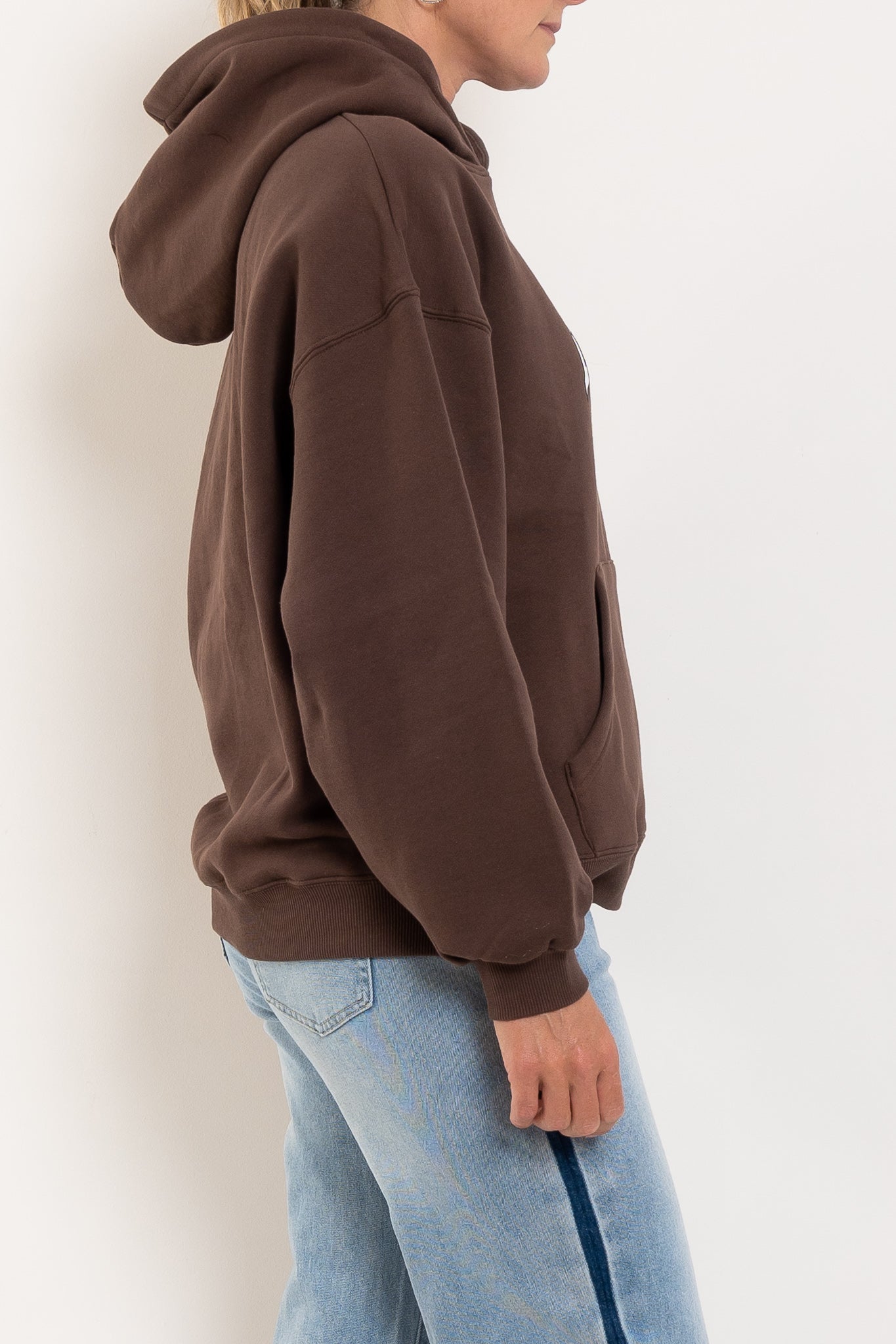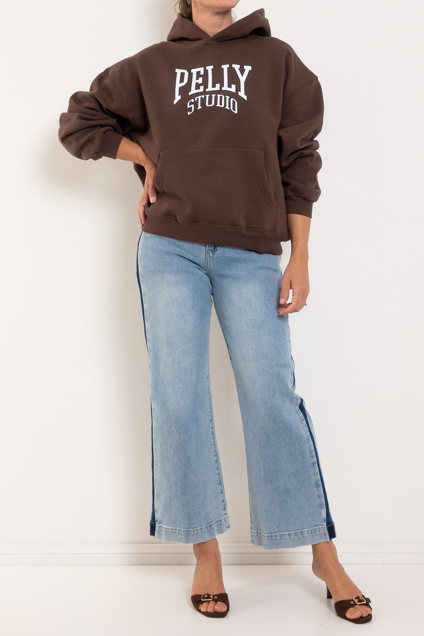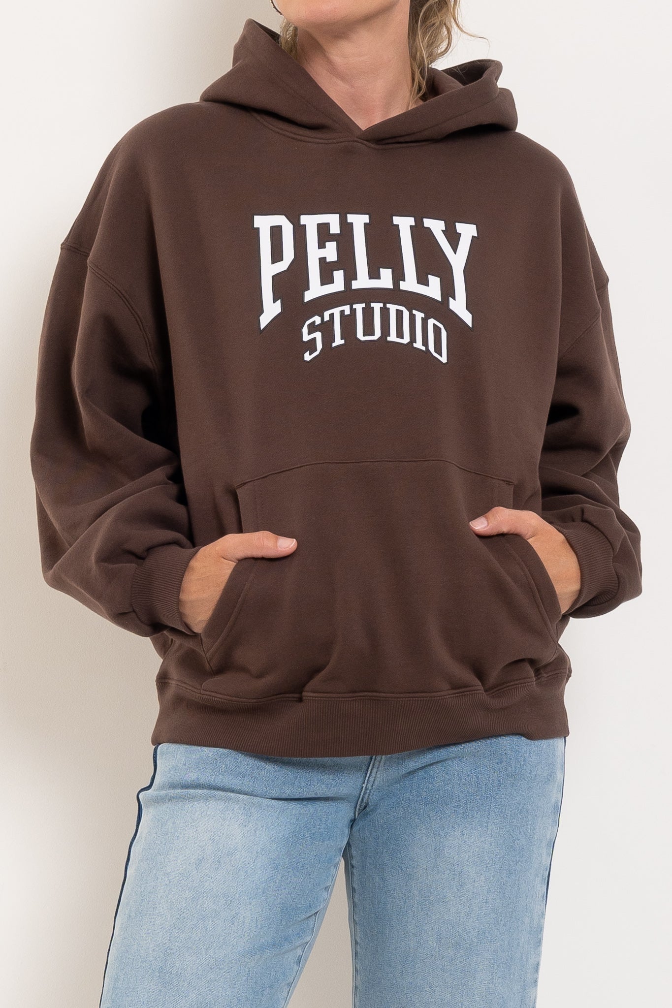 The Pelly Studio Hoodie is crafted from brushed cotton-rich fleece in mocha with an oversized, drop-shoulder fit. Designed with a tonal collegiate-inspired graphic and contrast outline, it offers a refined take on casual layering.