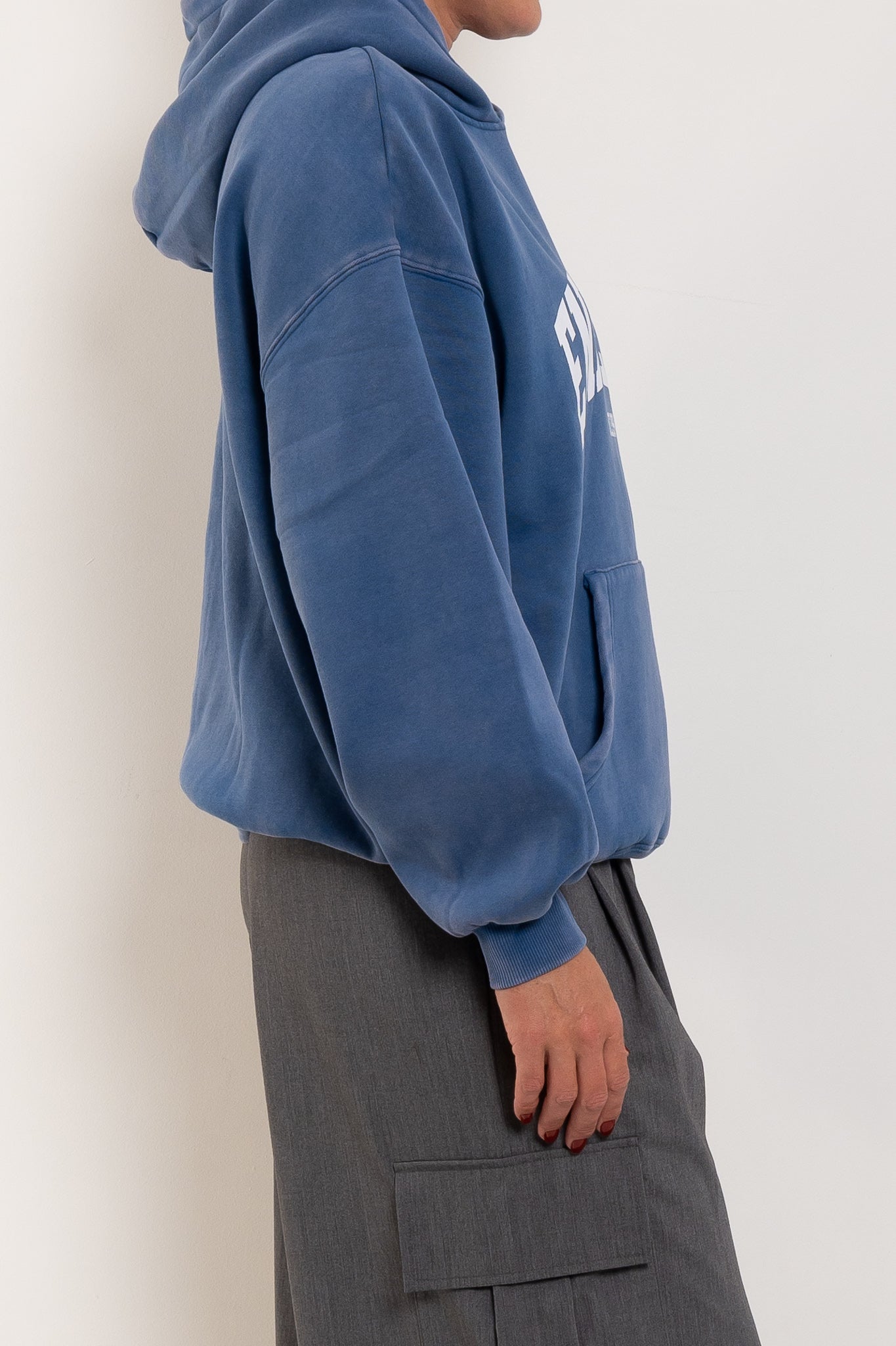 Everyday Layer. Styled Ease. The Varsity Hoodie is made from brushed cotton-rich fleece with an oversized, relaxed shape in washed indigo. Finished with a collegiate-inspired graphic and ribbed trims, it's a casual staple with a vintage feel.