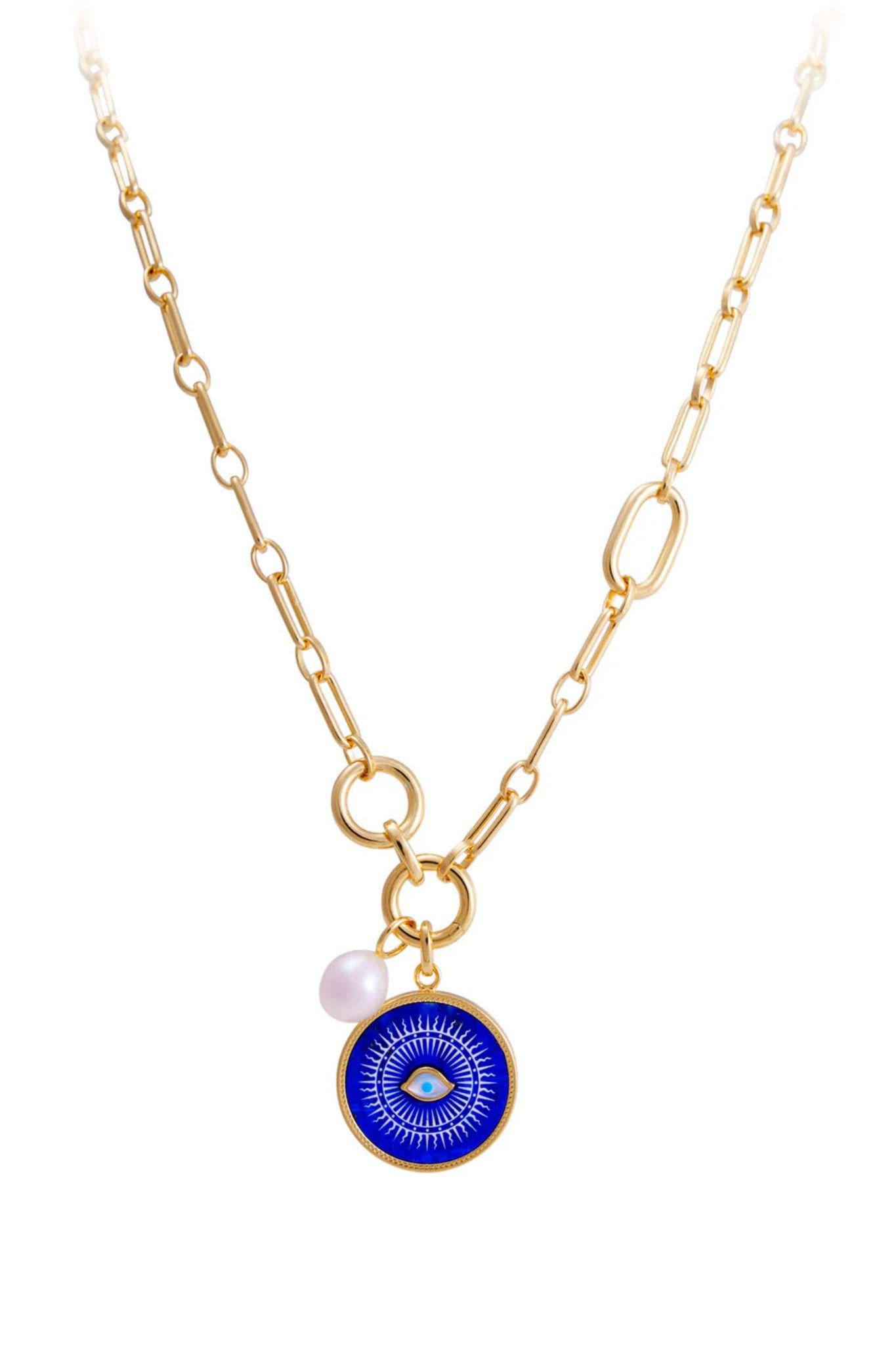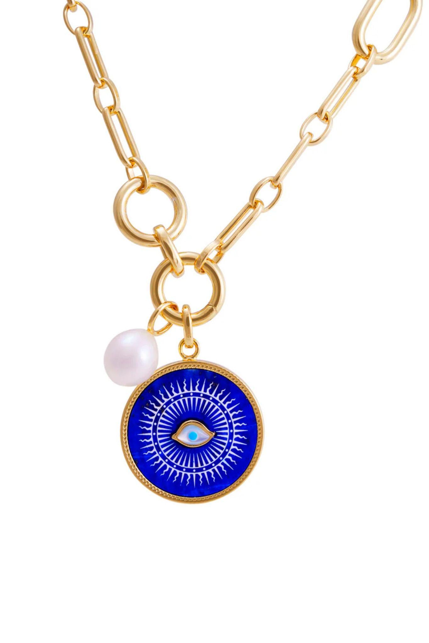Radiating mystique and meaning, the Lucky Amulet Necklace features a freshwater pearl and striking round blue enamel disc, intricately detailed with a radiant sunburst and protective evil eye motif at its centre. Symbolising luck, protection, and positivity, this modern talisman is crafted to be worn daily.