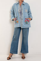 Crafted from 100% cotton denim, the Sunnie Oversized Denim Trucker Jacket features striking floral embroidery that adds character and visual interest. The relaxed silhouette showcases dropped shoulder sleeves, a classic button front, and functional patch pockets, while intricate embroidered detailing adorns the button placket. Versatile and effortlessly stylish, layer this piece over your favourite knit or dress it down with casual basics for an elevated everyday look.