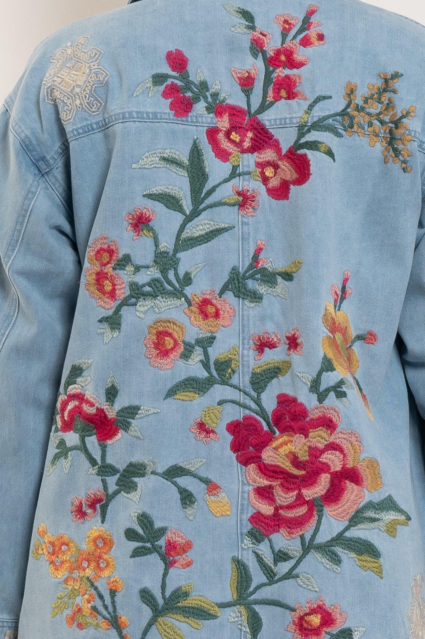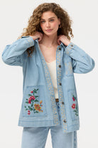 Crafted from 100% cotton denim, the Sunnie Oversized Denim Trucker Jacket features striking floral embroidery that adds character and visual interest. See full product description below for fabric and fit info.