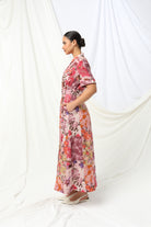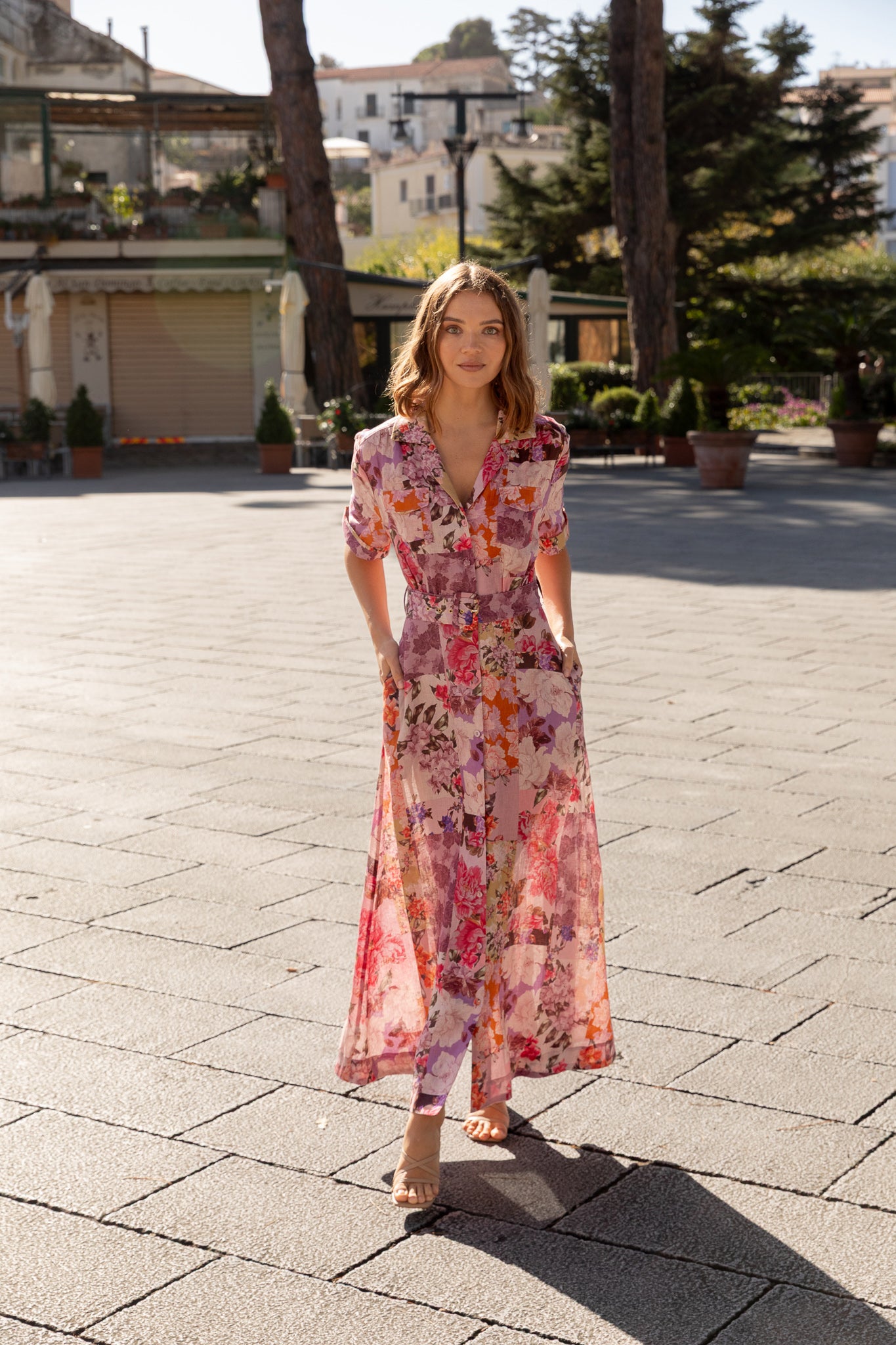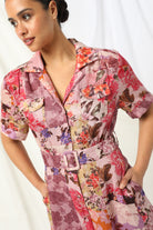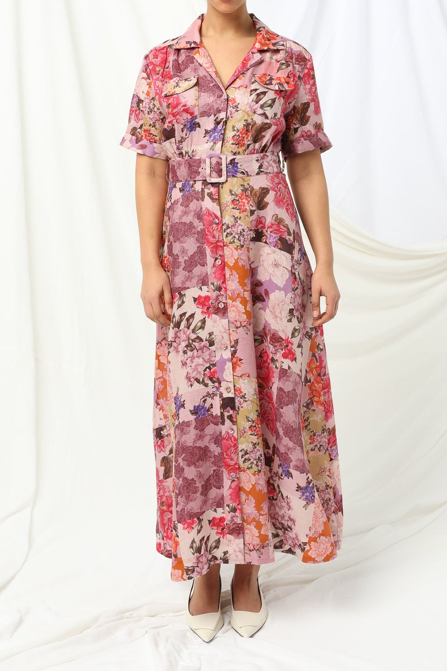 Crafted from breathable 100% linen, this midi-length dress features a classic collared neckline, button-through front and softly tailored waist with a matching belt to shape and flatter. The patchwork floral print brings warmth and richness while the short sleeves and flowing skirt keep it light and easy for everyday wear or special occasions.