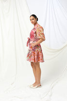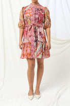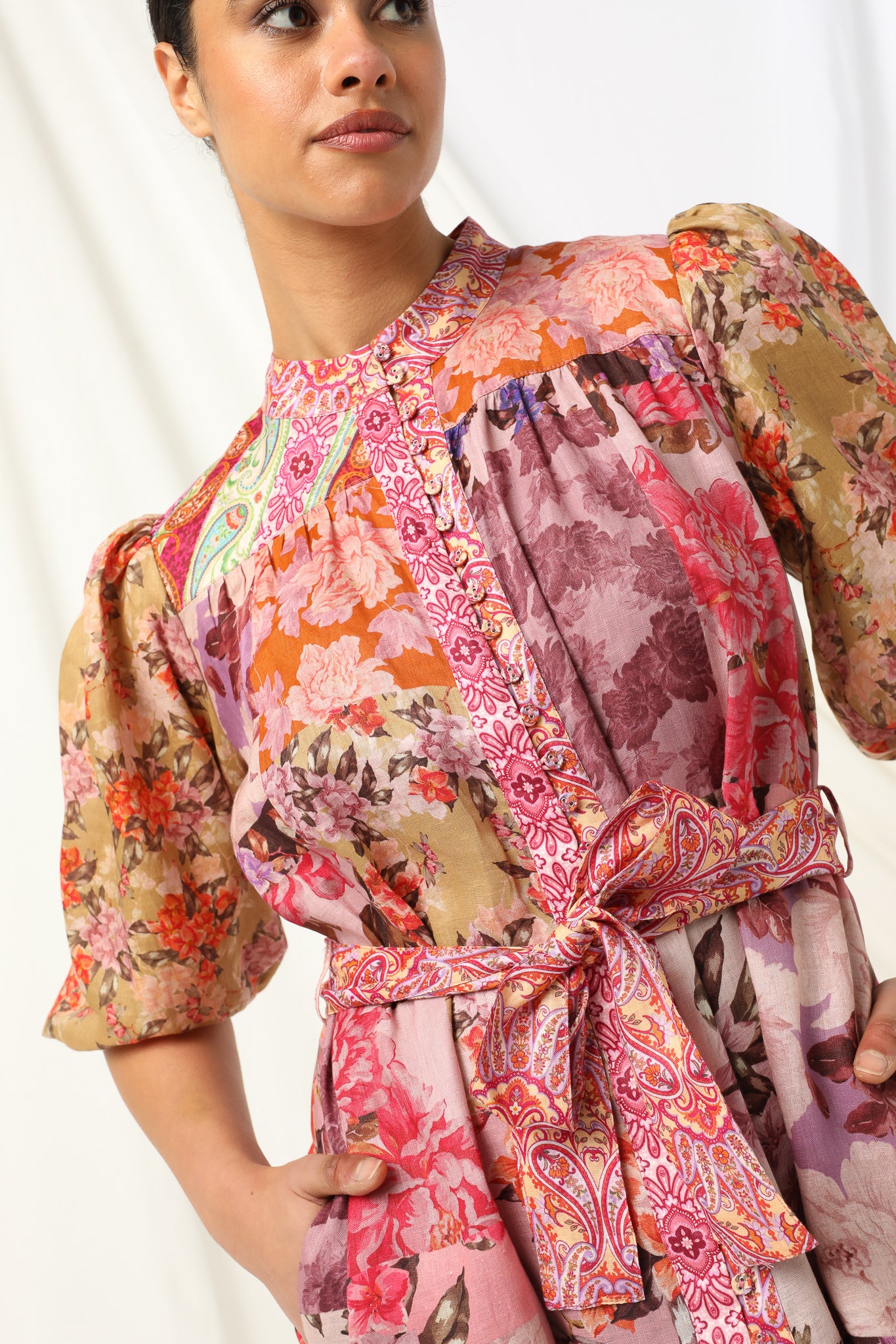 Crafted from breathable 100% linen, this lightweight dress features a softly structured bodice, feminine puff sleeves and a self-tie waist that cinches you in just where you want it. The tiered skirt creates gorgeous movement while the patchwork-style print adds a vibrant, European summer feel — perfect for long lunches, events and warm-weather celebrations.