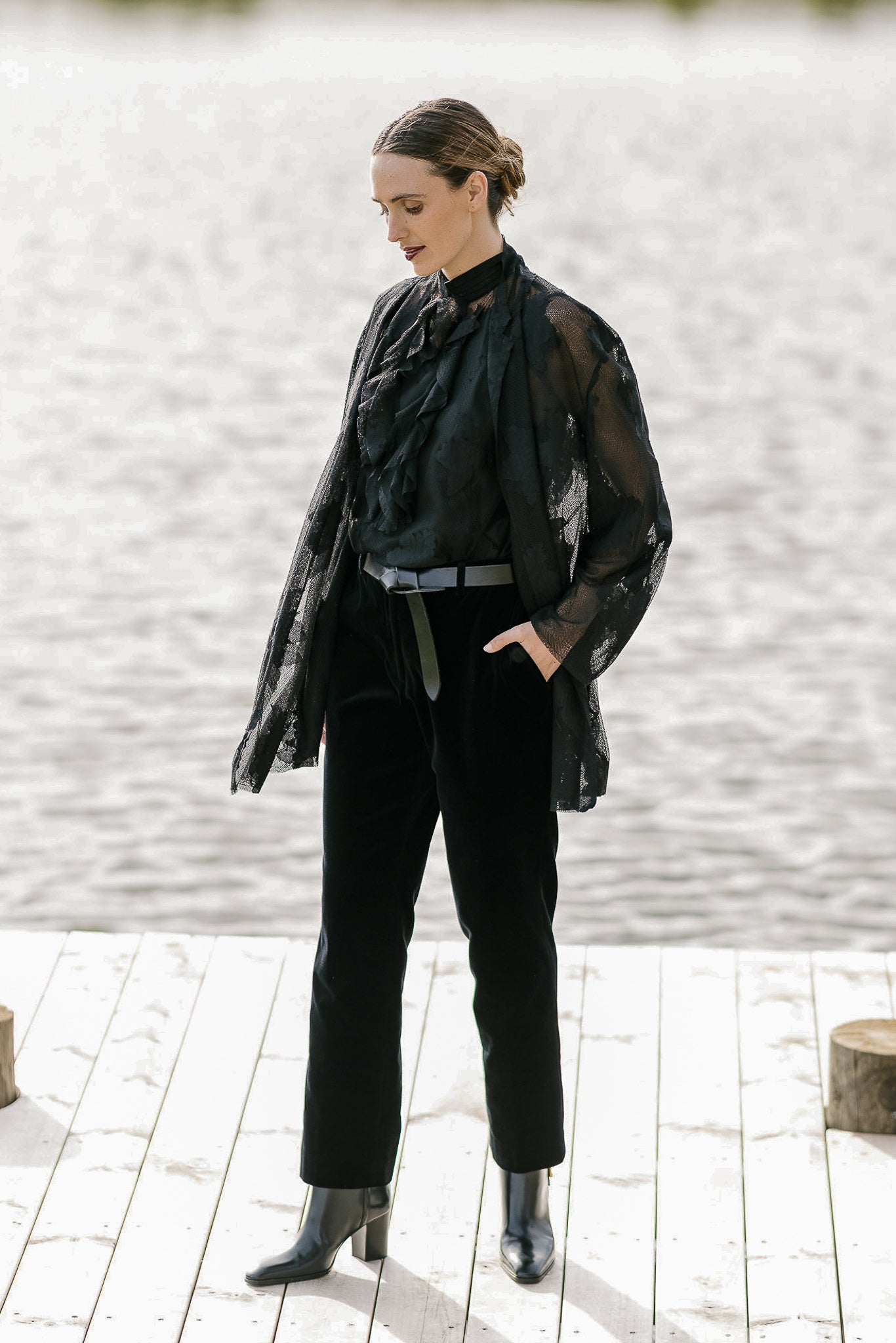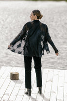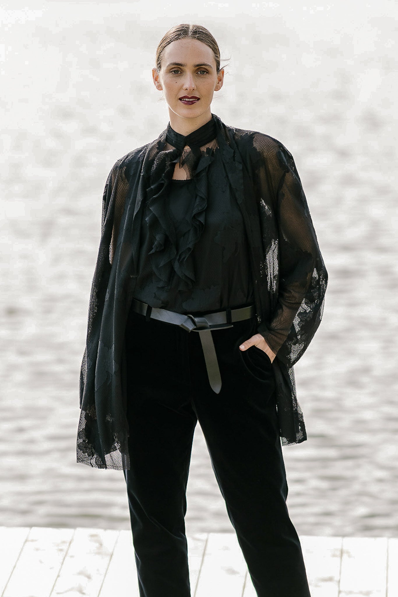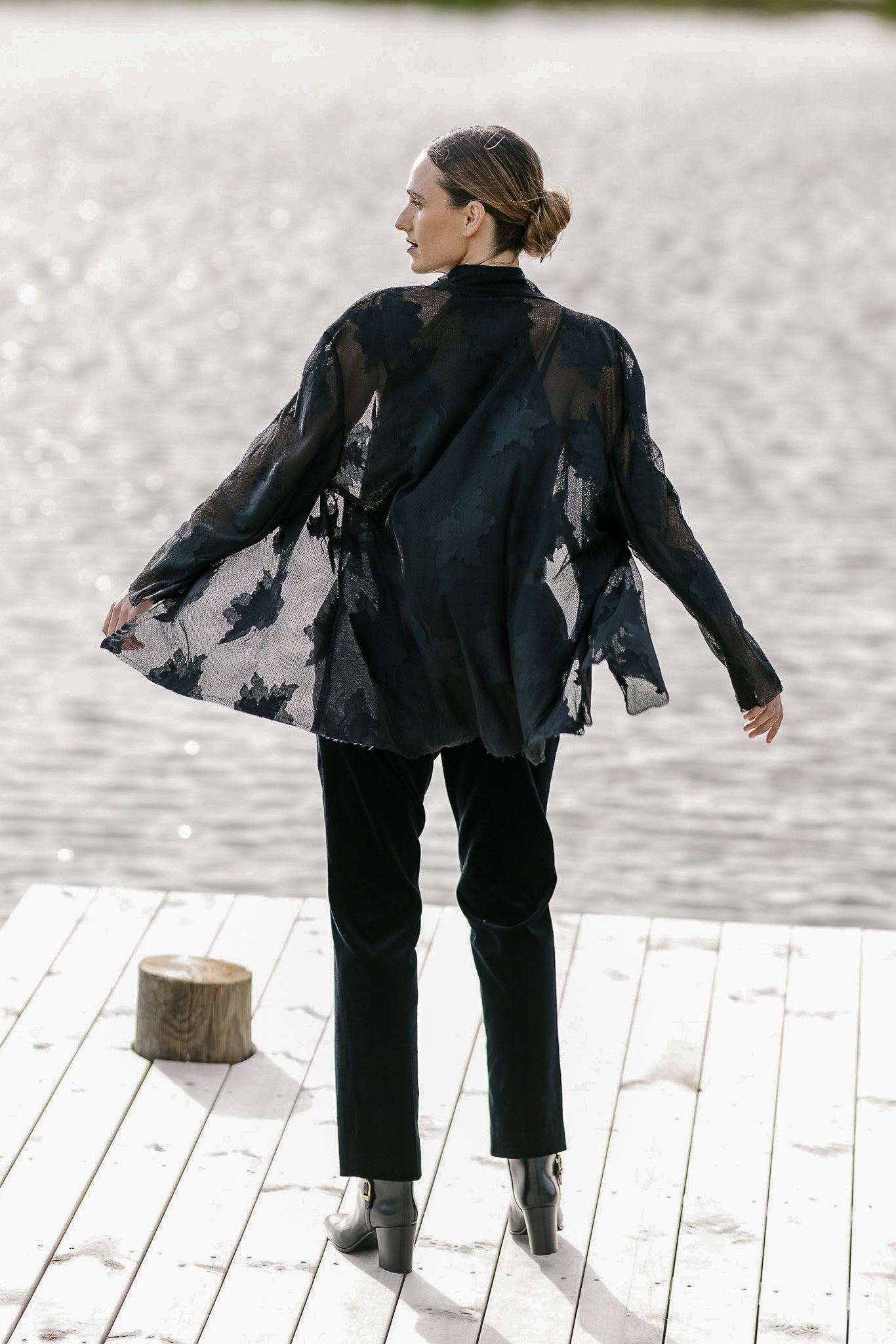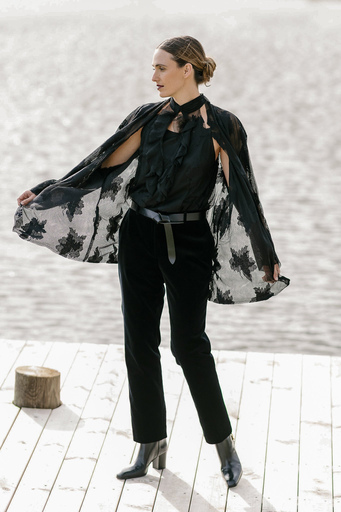 Crafted in delicate black lace, this effortless pull-on jacket adds instant drama to even the simplest outfit. The soft fluid silhouette floats over the body, while the matching tie can be worn cinched at the waist for shape or styled as a neck tie for elevated edge. It’s romantic, modern and unmistakably M.A. Dainty.