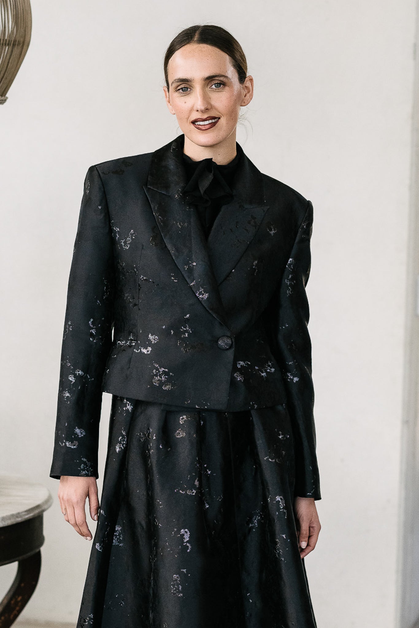 Crafted in a rich black jacquard with subtle texture and shine, the Olé Jacket elevates any outfit instantly. With its clean lines, soft structure and confident silhouette, it’s the kind of piece you throw on and suddenly feel unstoppable. Pair it with the Parted Skirt for a bold, modern evening look that feels effortlessly chic.