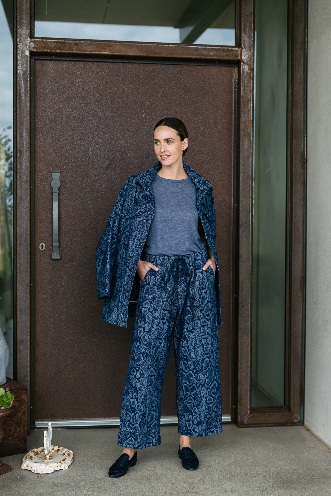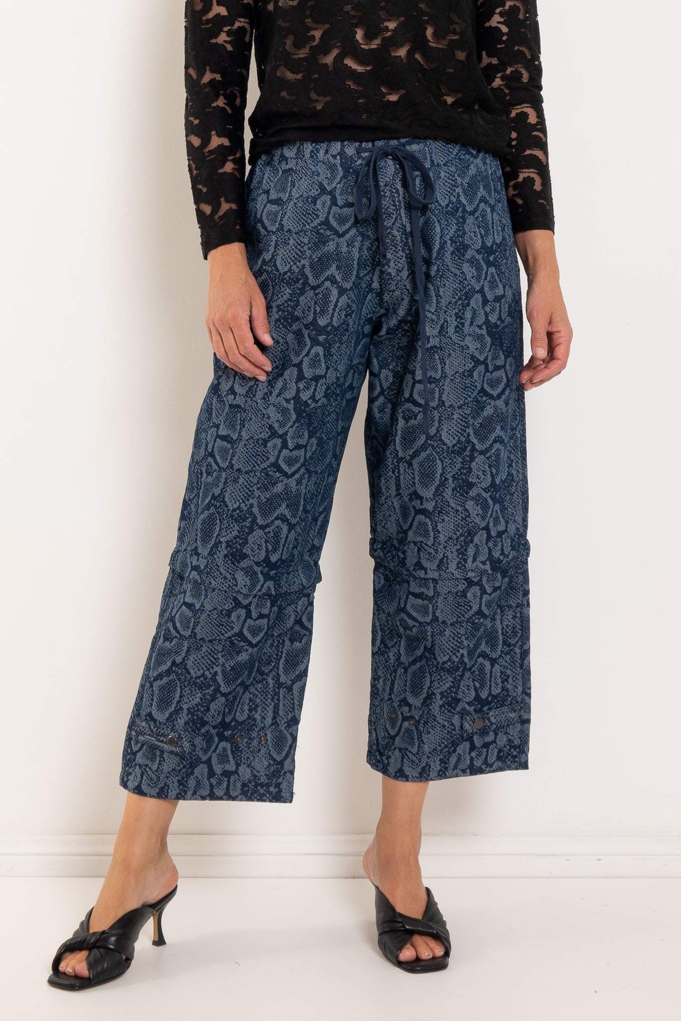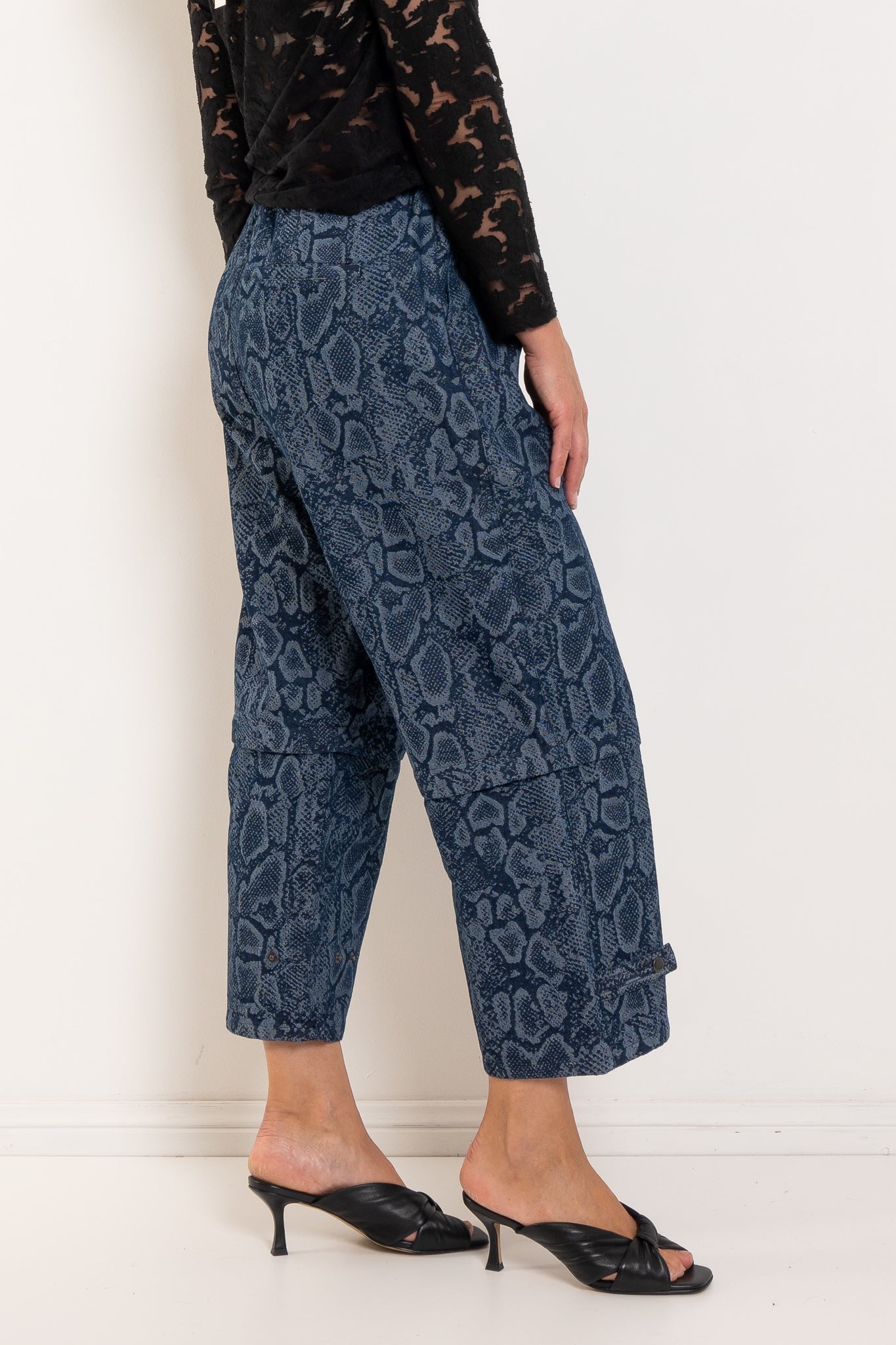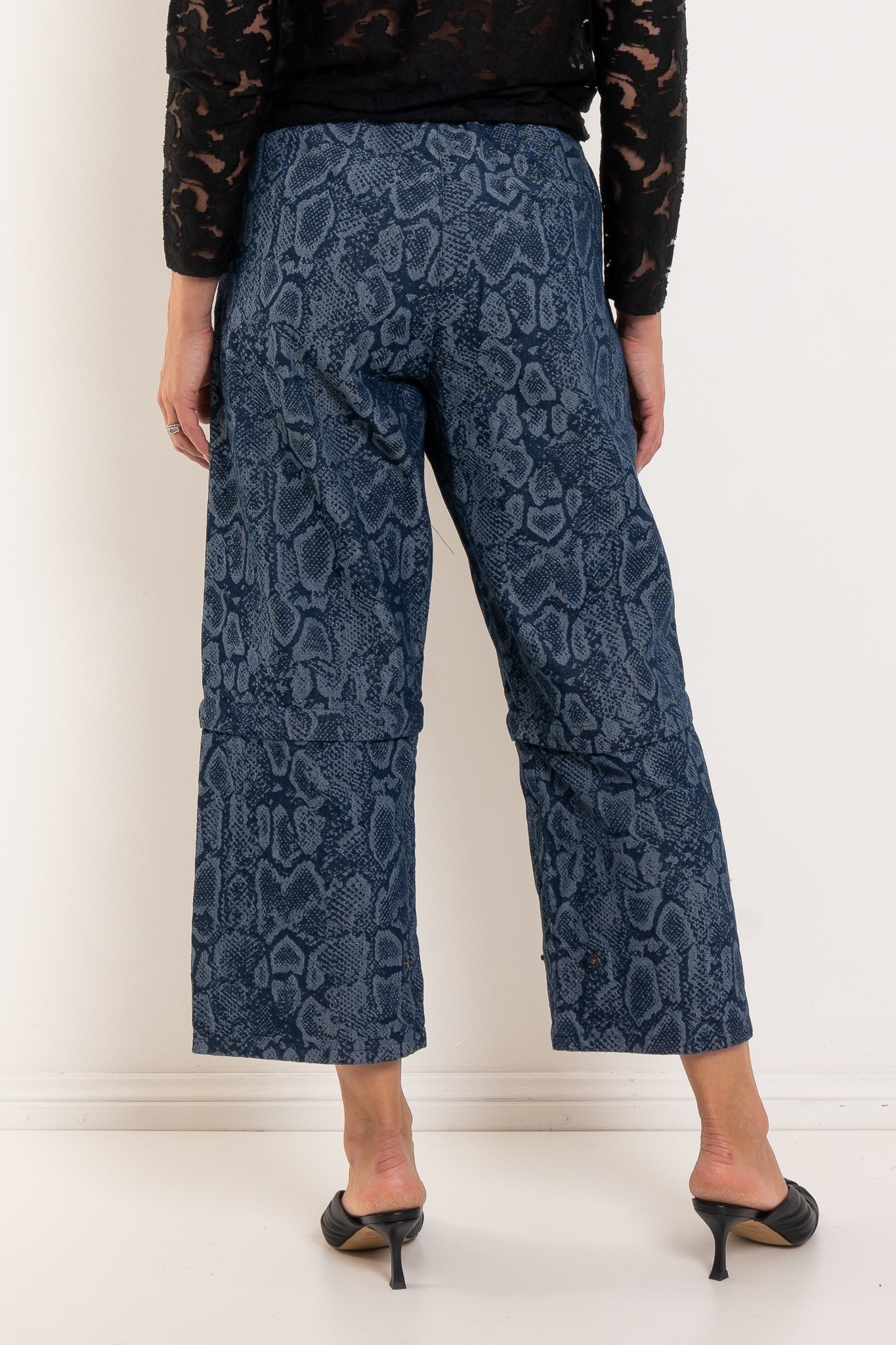 Designed with an intentionally oversized fit and relaxed drawstring waist, the Trucker Jean is all about comfort with edge. The adjustable tab cuff lets you switch between a classic straight leg or a cinched, utility-inspired shape, while the zip-off leg transforms the pant into knee-length shorts — because great design should work as hard as you do. Finished in a bold snake print that feels modern, directional and distinctly Dainty.