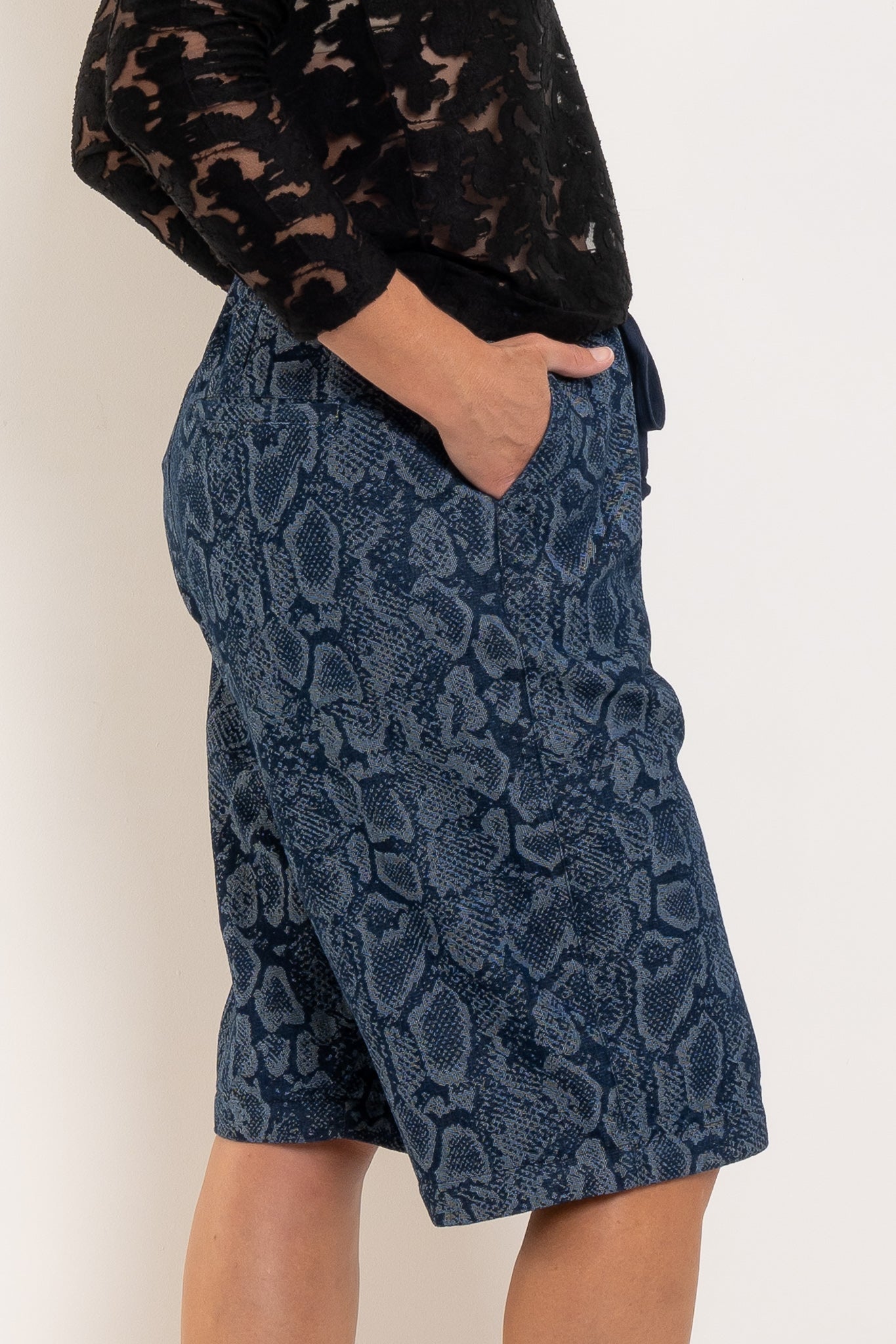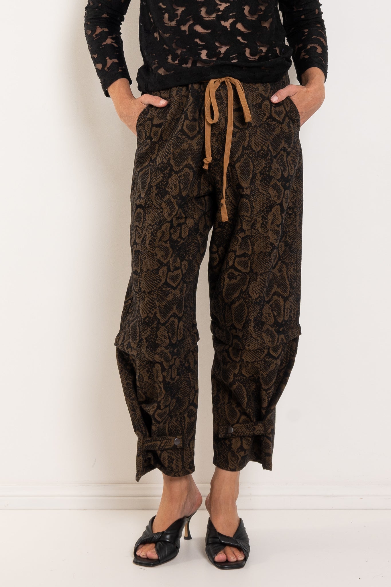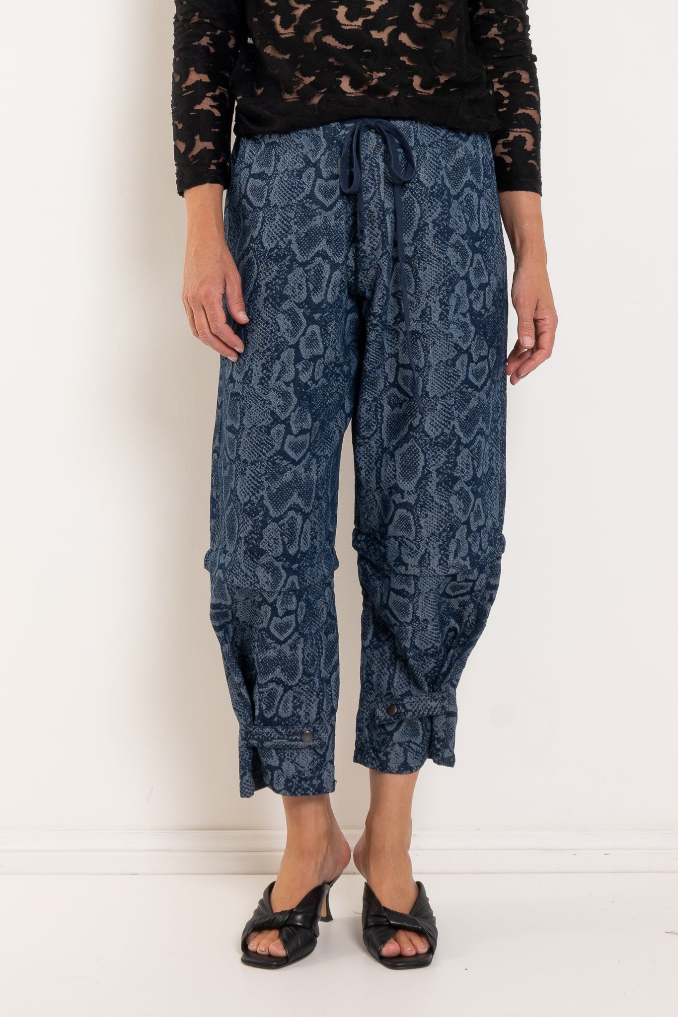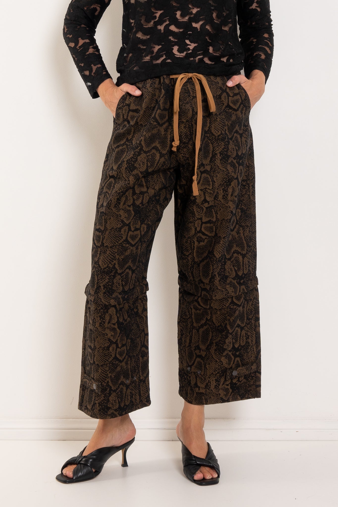 Designed with an intentionally oversized fit and relaxed drawstring waist, the Trucker Jean is all about comfort with edge. The adjustable tab cuff lets you switch between a classic straight leg or a cinched, utility-inspired shape, while the zip-off leg transforms the pant into knee-length shorts — because great design should work as hard as you do. Finished in a bold snake print that feels modern, directional and distinctly Dainty.