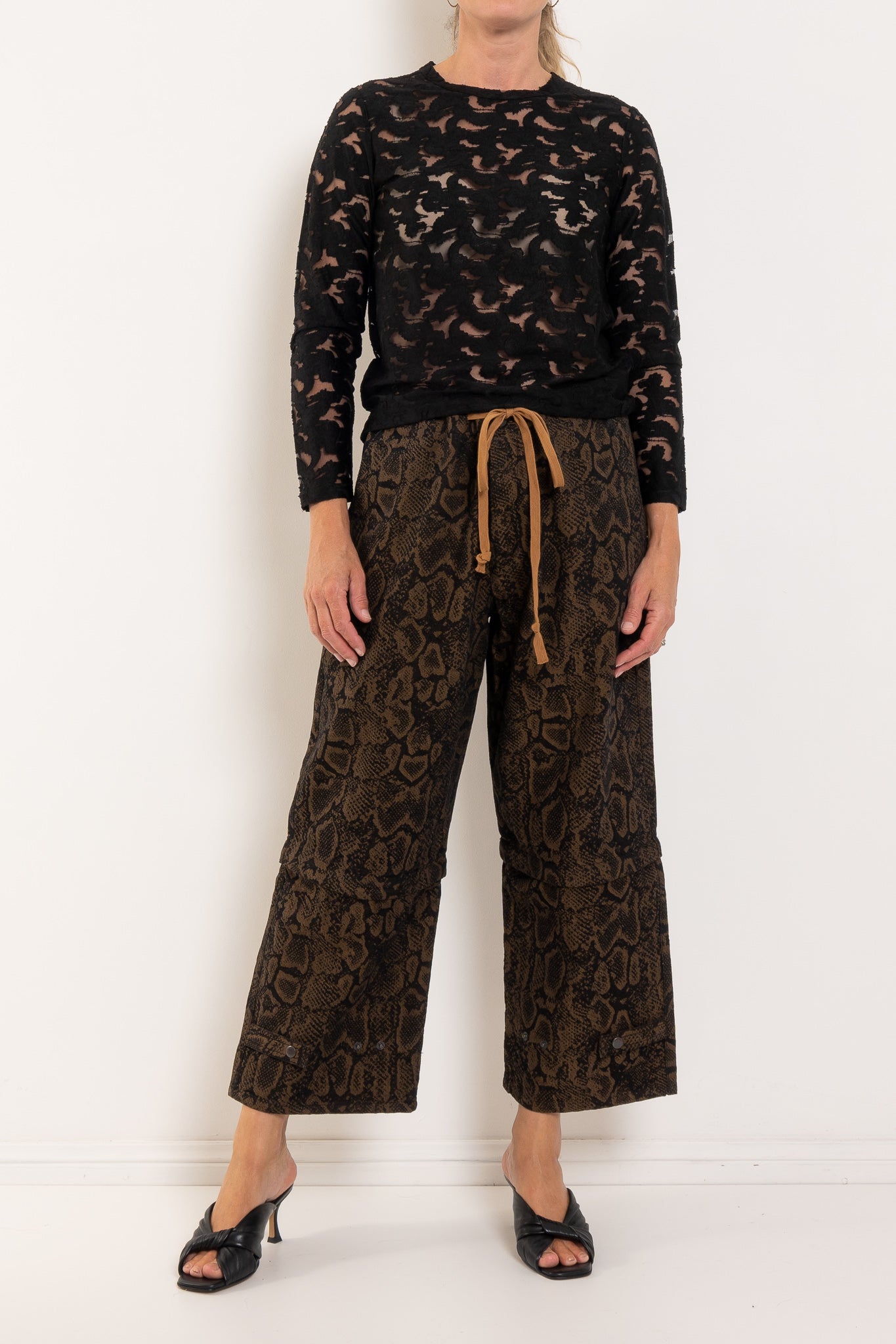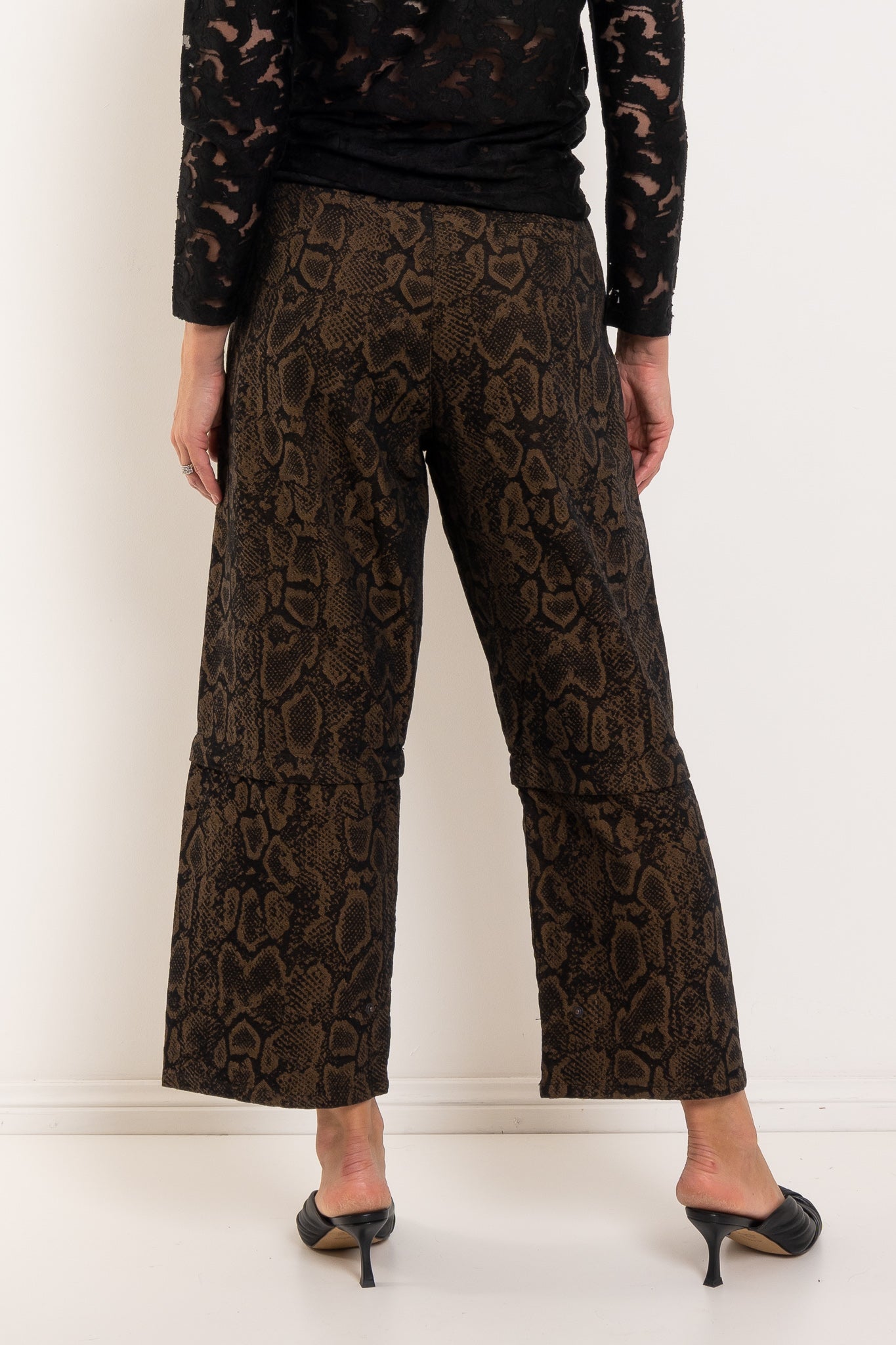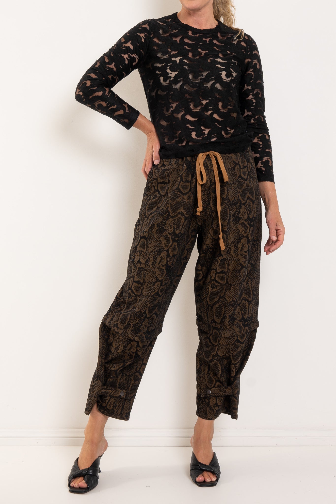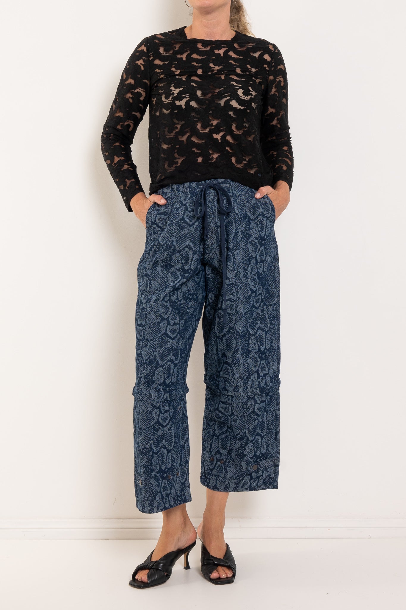 Designed with an intentionally oversized fit and relaxed drawstring waist, the Trucker Jean is all about comfort with edge. The adjustable tab cuff lets you switch between a classic straight leg or a cinched, utility-inspired shape, while the zip-off leg transforms the pant into knee-length shorts — because great design should work as hard as you do. Finished in a bold snake print that feels modern, directional and distinctly Dainty.