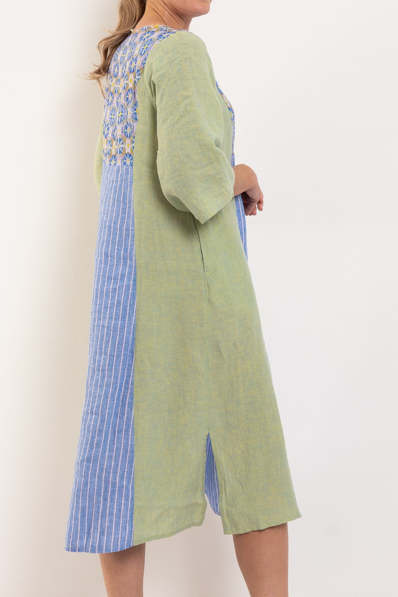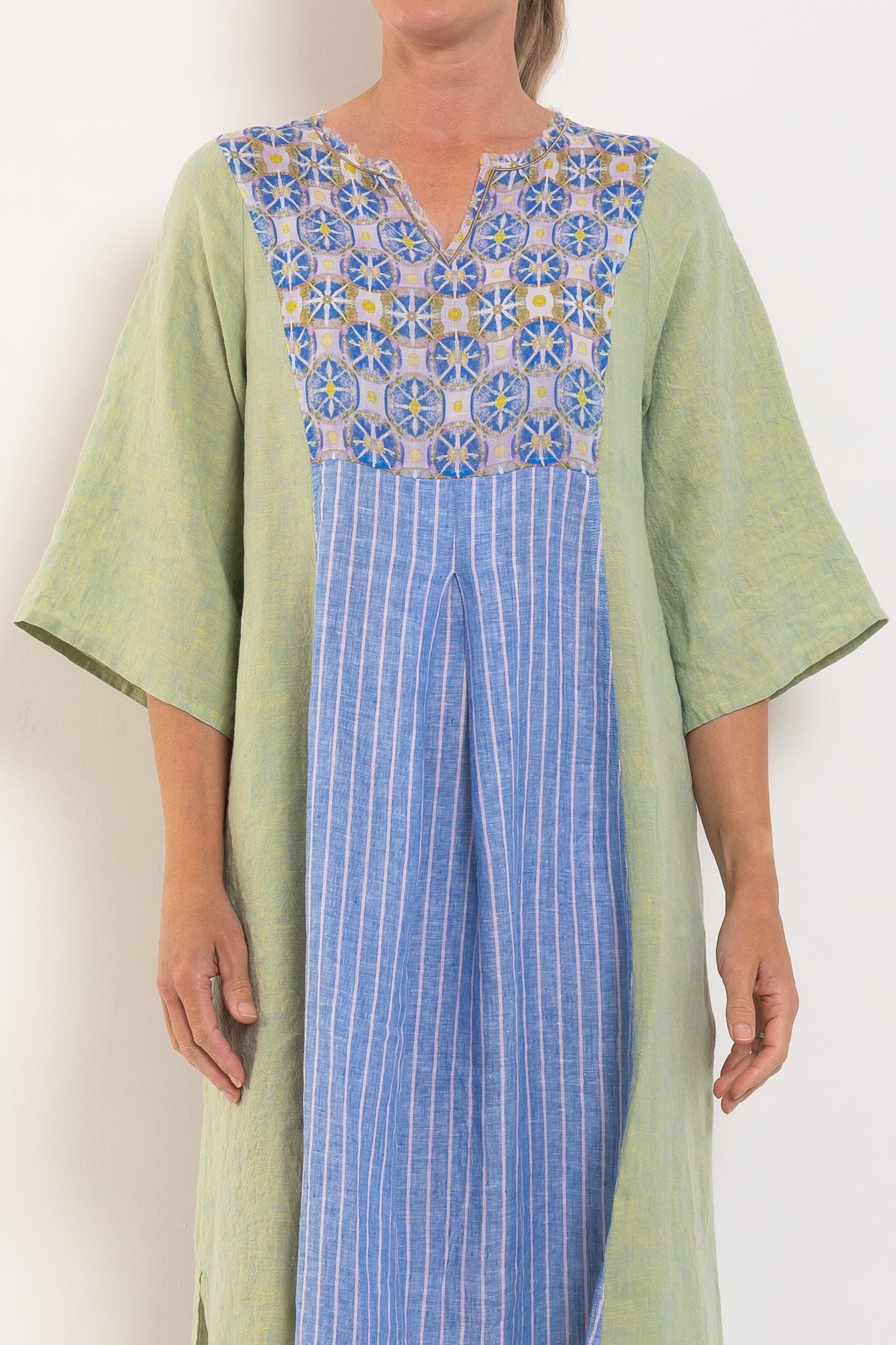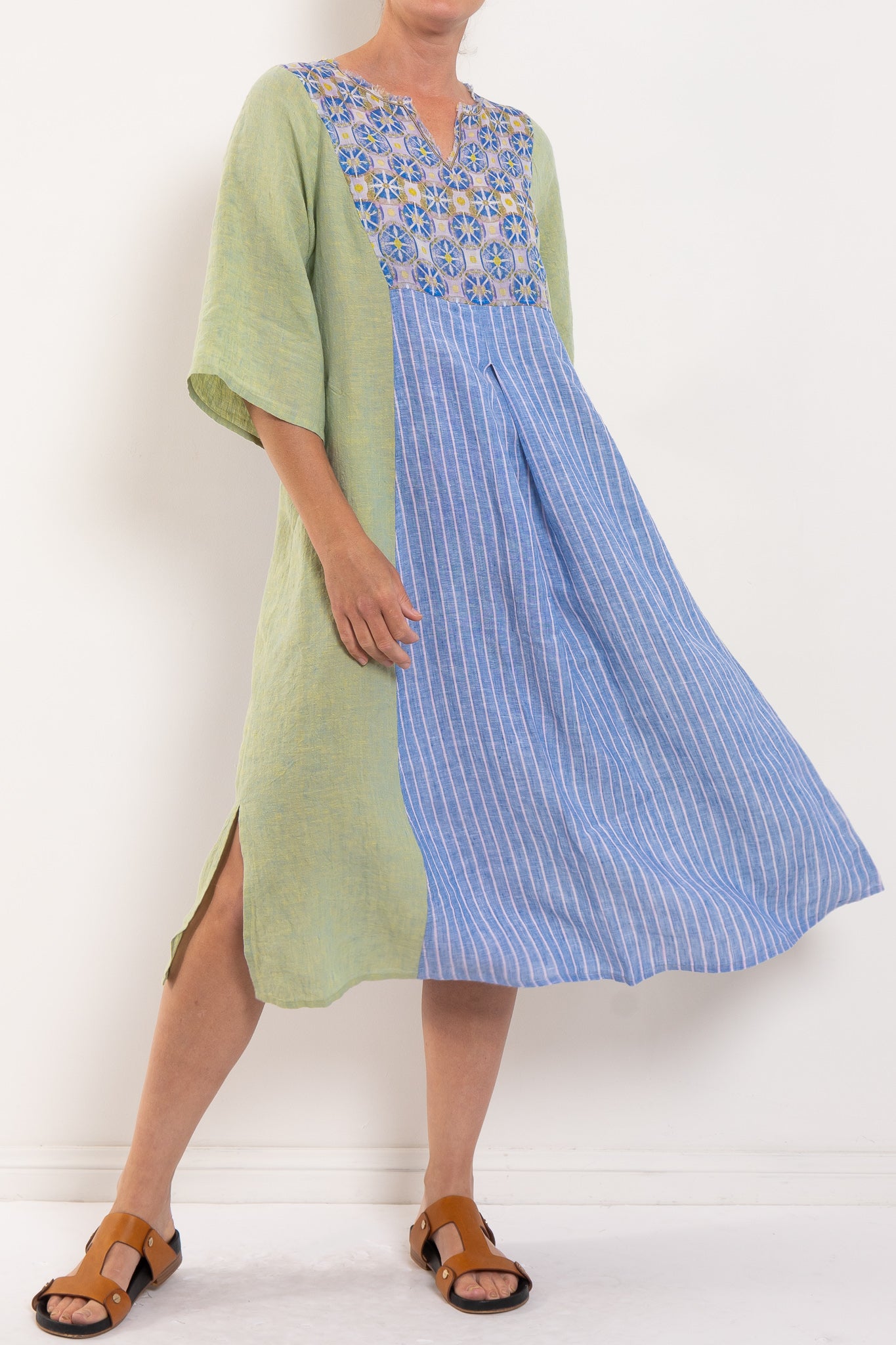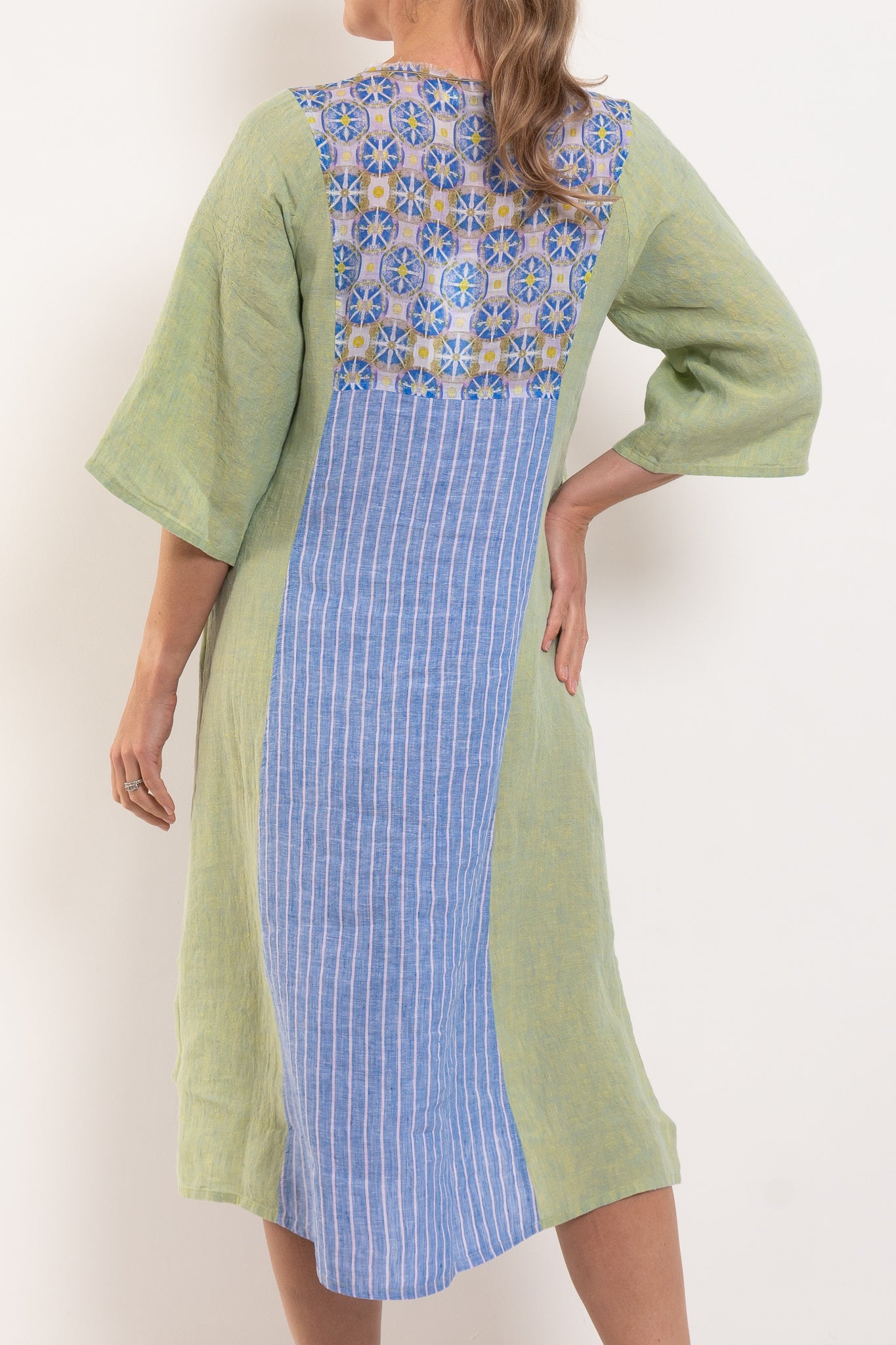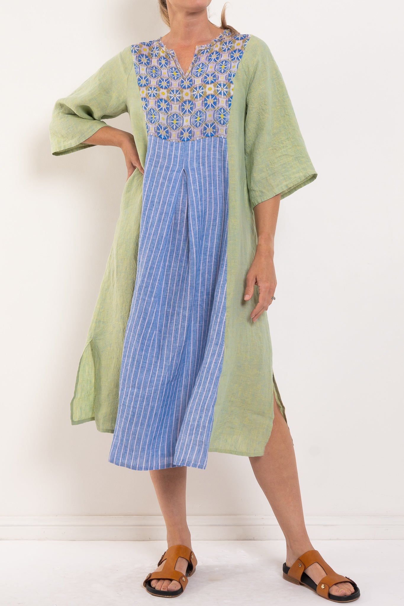 Made in Australia and crafted from breathable pure linen, the Stargazer Dress combines soft green linen with contrasting blue stripes and a beautifully patterned bib for a unique, artisanal look. The relaxed A-line shape drapes effortlessly through the body, while the elbow-length sleeves and side splits keep it cool and easy to move in. Finished with a softly frayed V-neckline, this dress offers a blend of ease, texture and handcrafted charm — perfect for daytime wear, weekend adventures or warm holiday evenings.