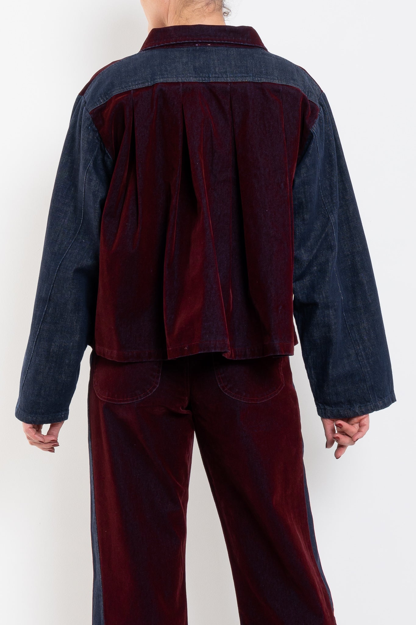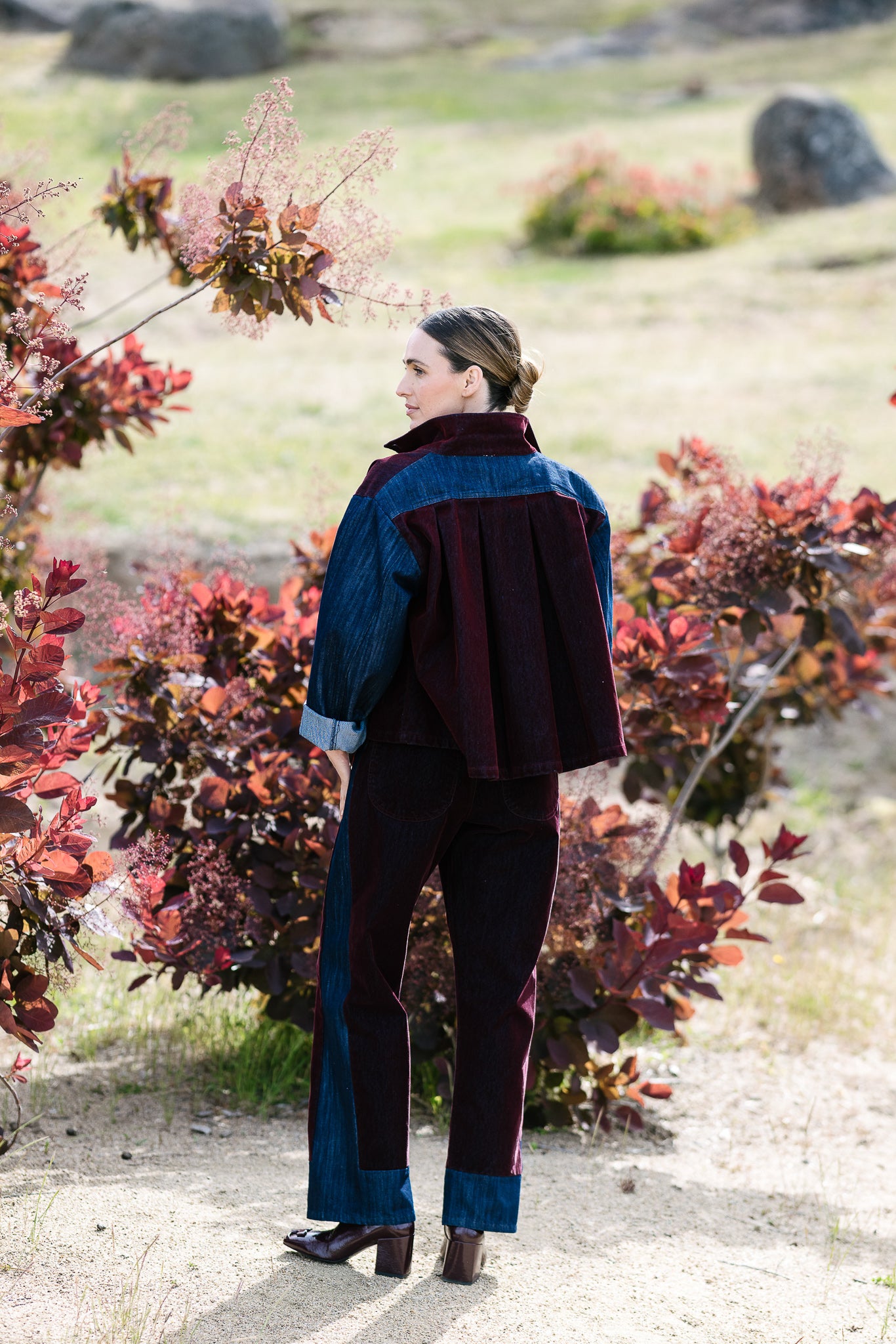 Meet your new jacket obsession. The M.A. Dainty Barnett jacket is a playful twist on classic denim—think relaxed vibes meets tactile luxury. Flocked (velvet touch) cotton panels add unexpected texture and depth, while the easy silhouette begs to be layered. Pair it with the Hayes Jeans for a coordinated moment, or let it do its own thing. Burgundy never looked so good.
