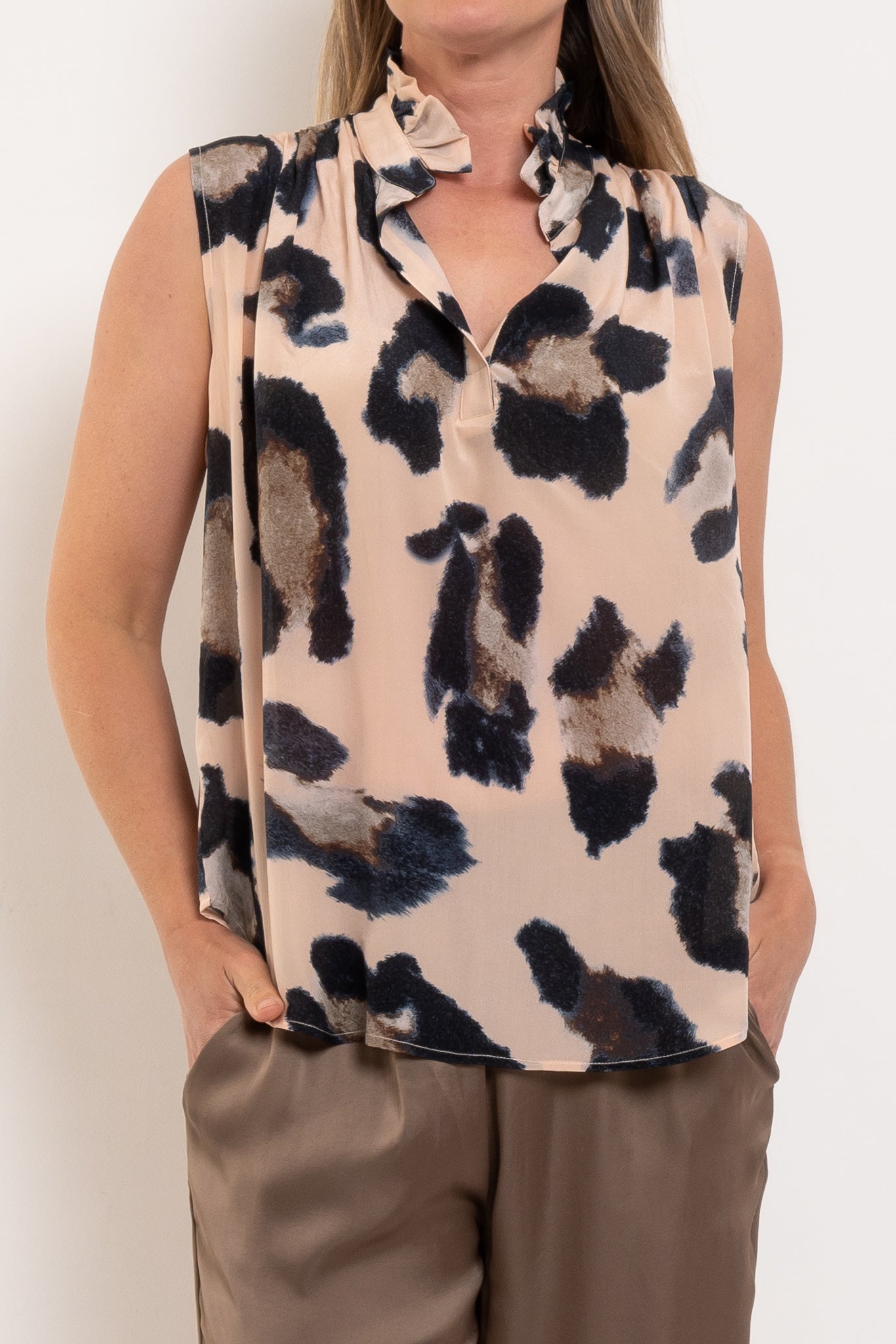 An elevated silk piece that instantly lifts any outfit. The Frill Neck Tank in Blurr Print Silk brings softness, movement and quiet drama — the kind of piece that makes even simple dressing feel considered. See full product description below for fabric and fit info.