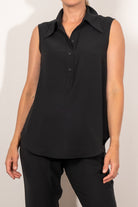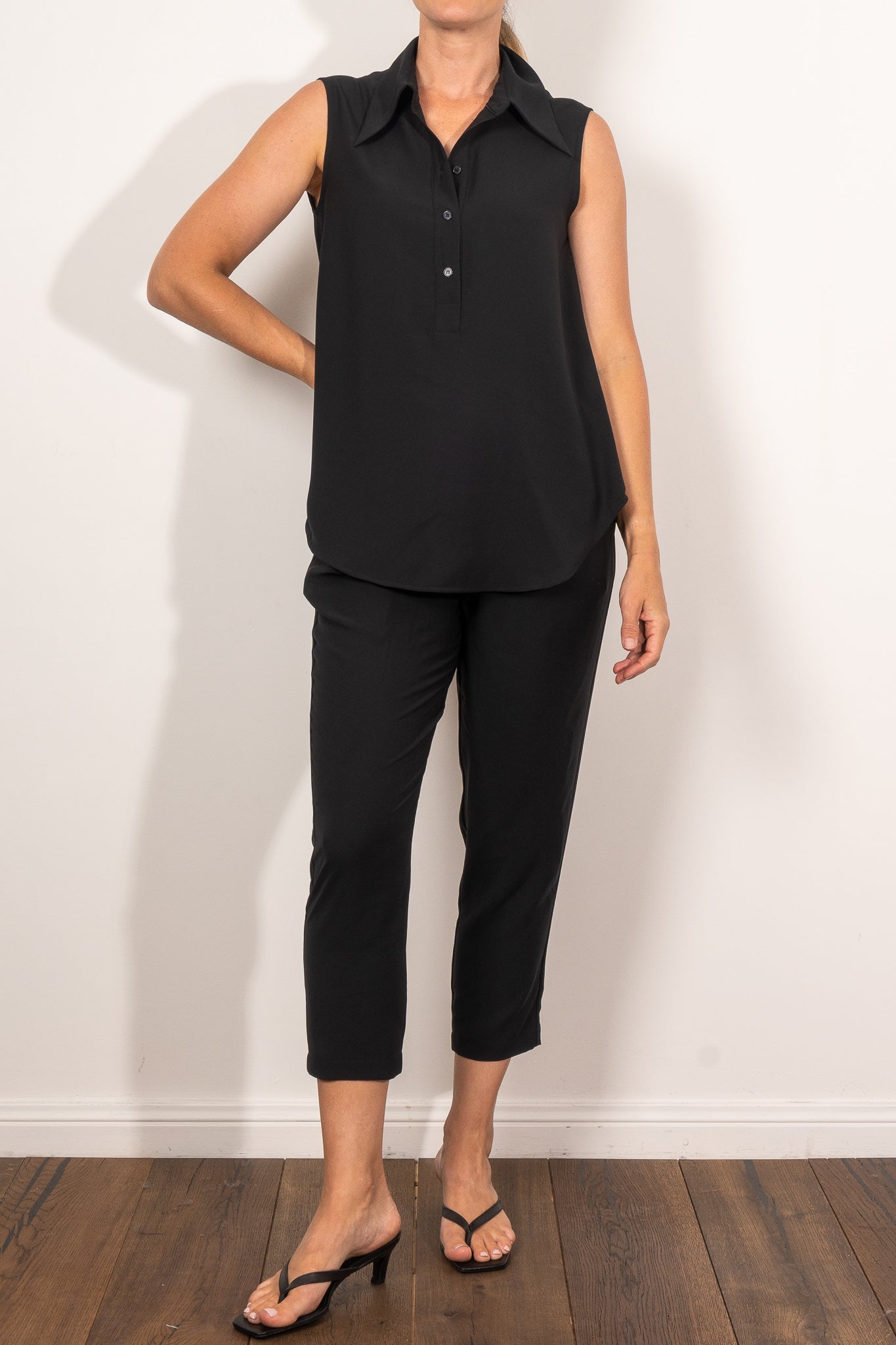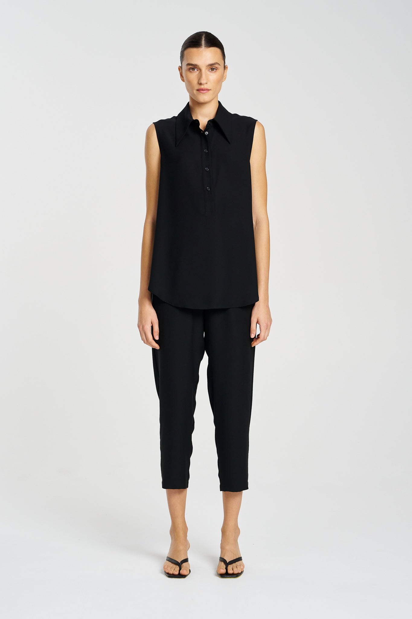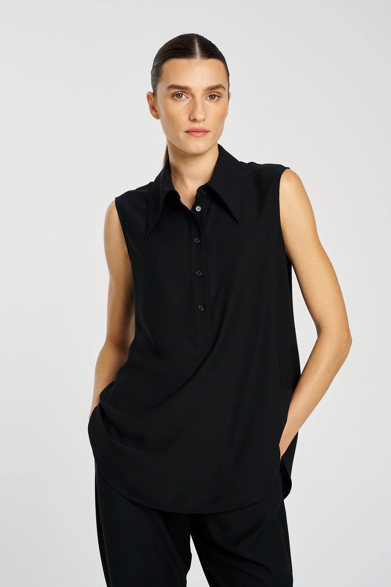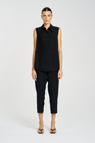 Chic and structured, the Peak Tank brings a refined edge to everyday dressing. Crafted from Mela Purdie’s signature Micro Denier—a lightweight Japanese fabric with fluid drape and subtle stretch—this sleeveless style features a sculptural collar and signature tab-button detail. Designed with thoughtful shoulder coverage and a relaxed silhouette, it’s a versatile piece for layering or standalone polish.