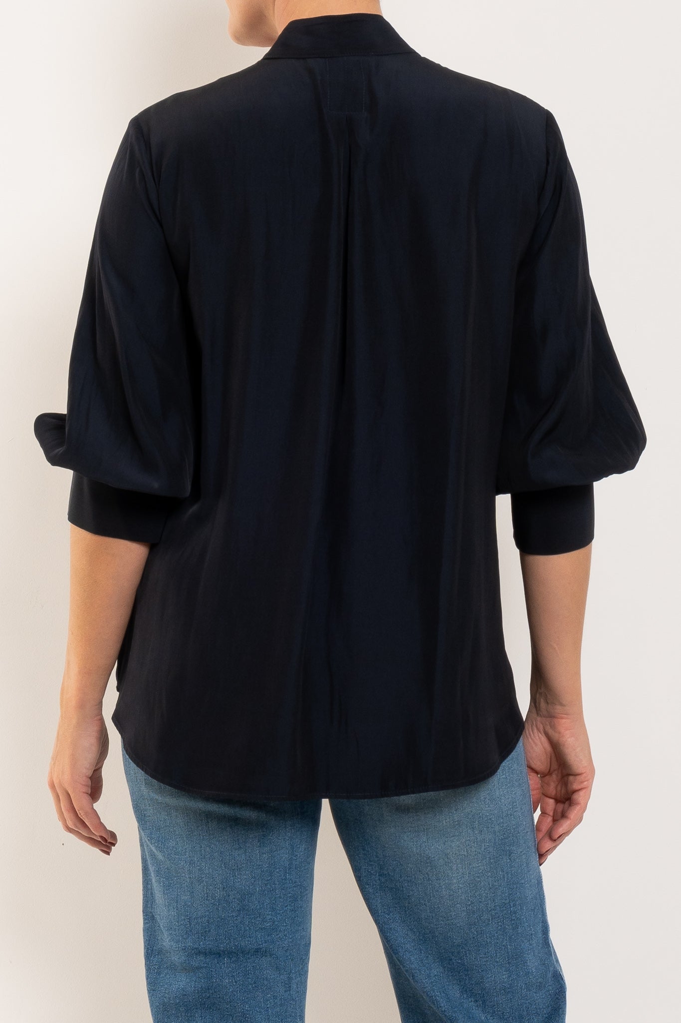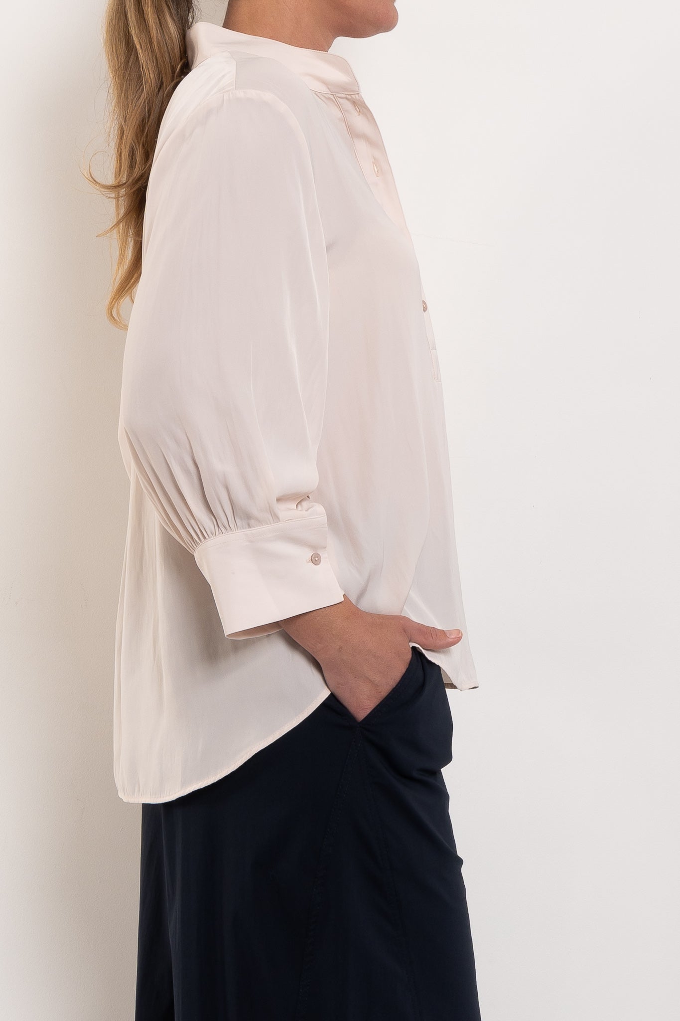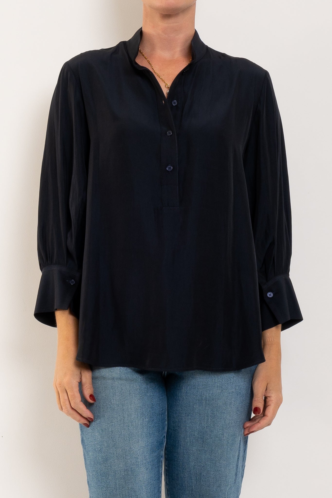 Crafted in Japanese-woven Mache — a fabric that drapes like silk but is crease-resistant and washable — this shirt combines comfort with refinement. A relaxed silhouette makes it endlessly wearable, while the stand collar, half placket closure, and softly curved hemline give it a polished finish. With 3/4 sleeves and classic cuffs, it’s the versatile piece that takes you from desk to dinner, weekend to travel, always feeling chic without trying too hard.