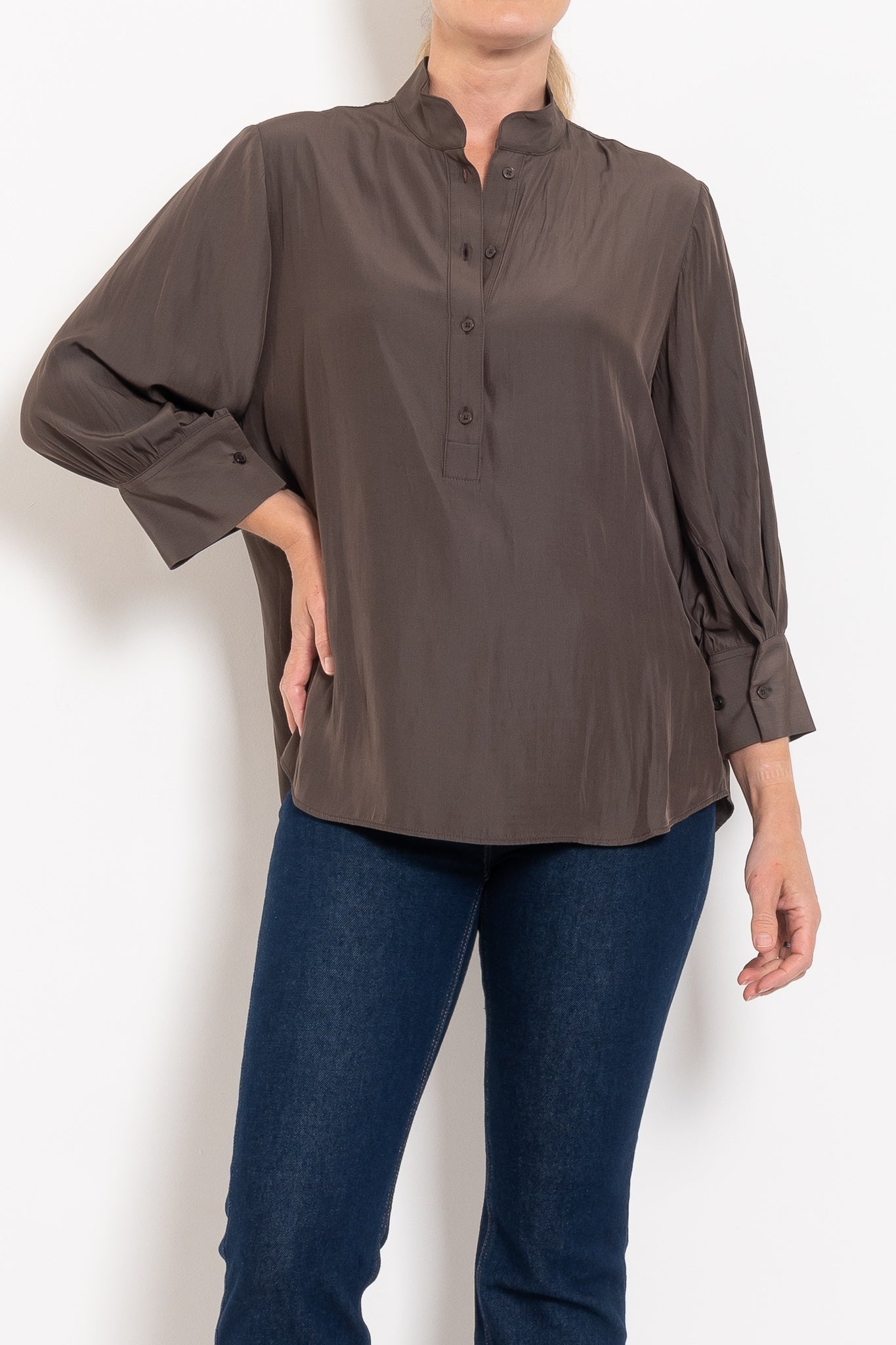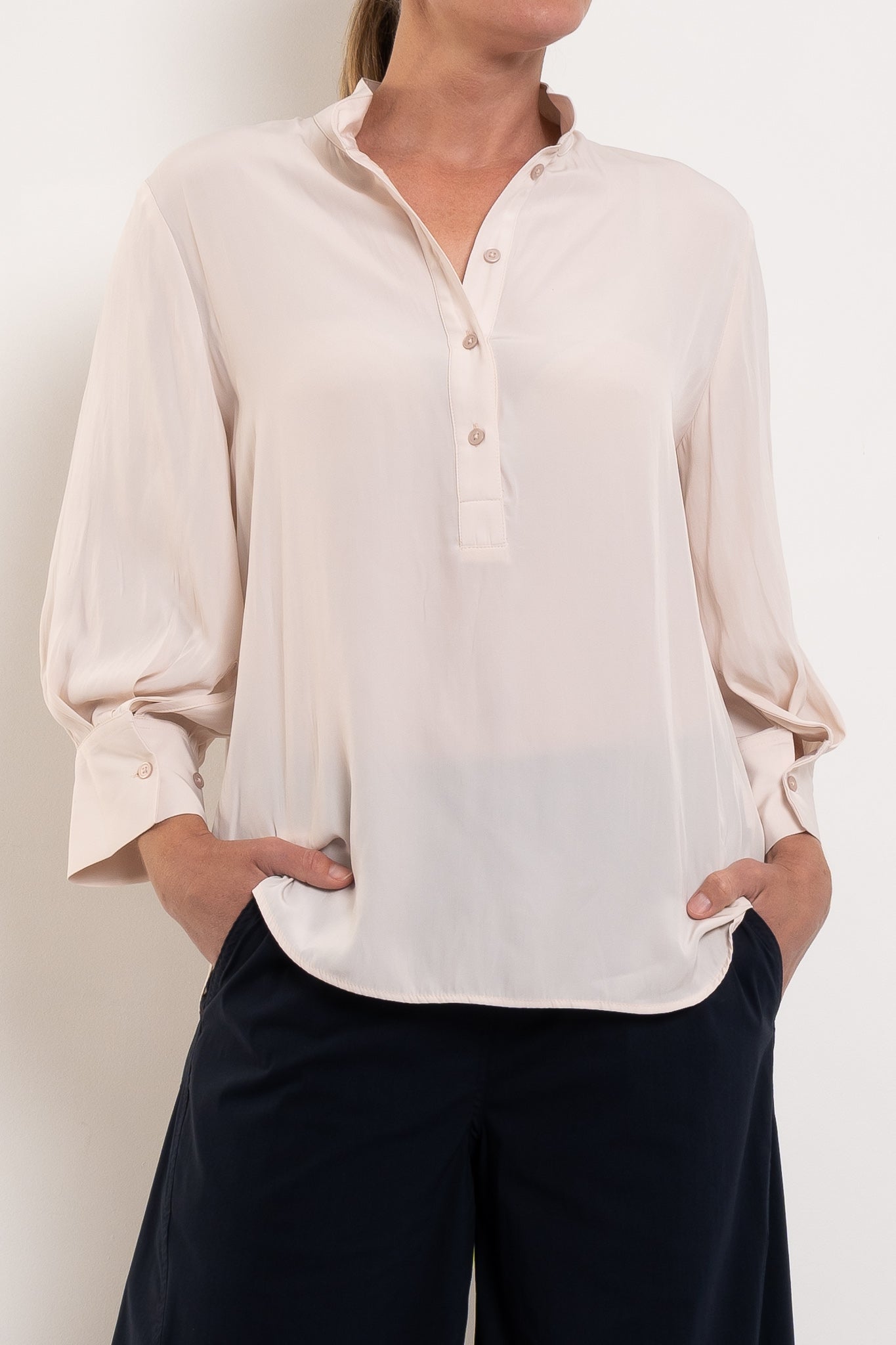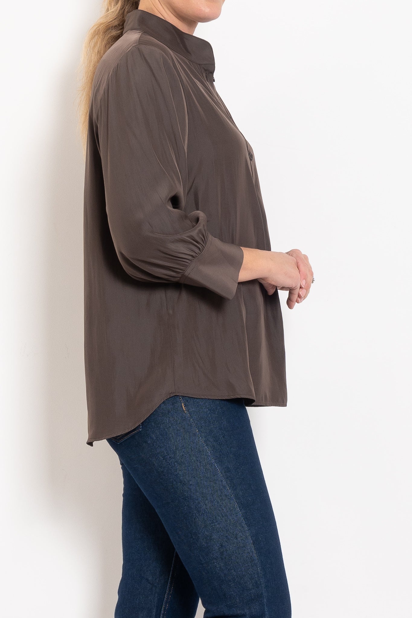 Crafted in Japanese-woven Mache — a fabric that drapes like silk but is crease-resistant and washable — this shirt combines comfort with refinement. A relaxed silhouette makes it endlessly wearable, while the stand collar, half placket closure, and softly curved hemline give it a polished finish. With 3/4 sleeves and classic cuffs, it’s the versatile piece that takes you from desk to dinner, weekend to travel, always feeling chic without trying too hard.